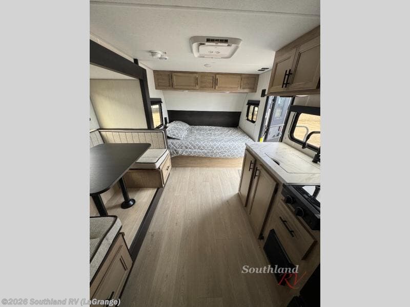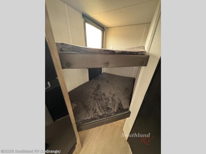 This family travel trailer is ready to head to the campground whenever you are! The kiddos can sleep on the set of double-size bed bunks, and you can sleep on the front queen bed, plus the U-shaped dinette slide can also transform into an extra sleeping space when you aren't using it to enjoy a meal prepared with the cooktop. You can also prepare your delicious meals at the outside mini kitchen and stay protected by the power awning. The exterior not only has outside storage and an outside TV mount but also features an outside storage plus door for access to the storage space underneath the bottom bunk bed. The rear corner bath allows everyone to stay clean and refreshed while you camp.