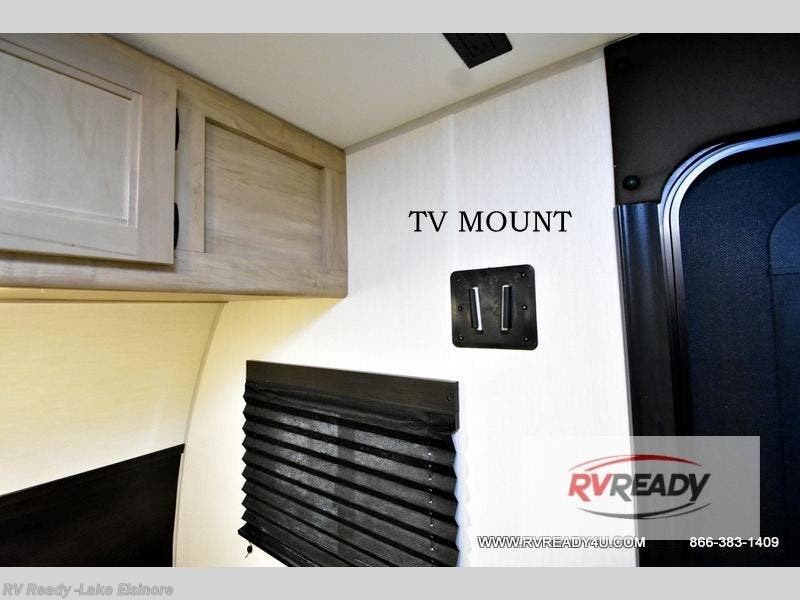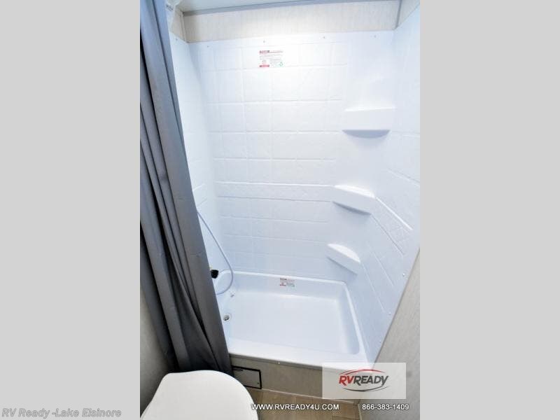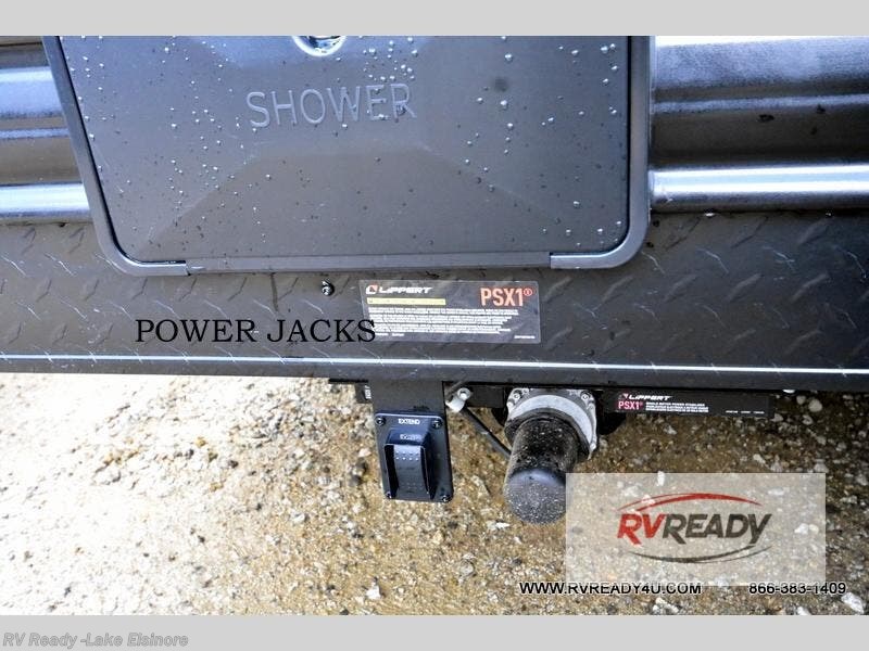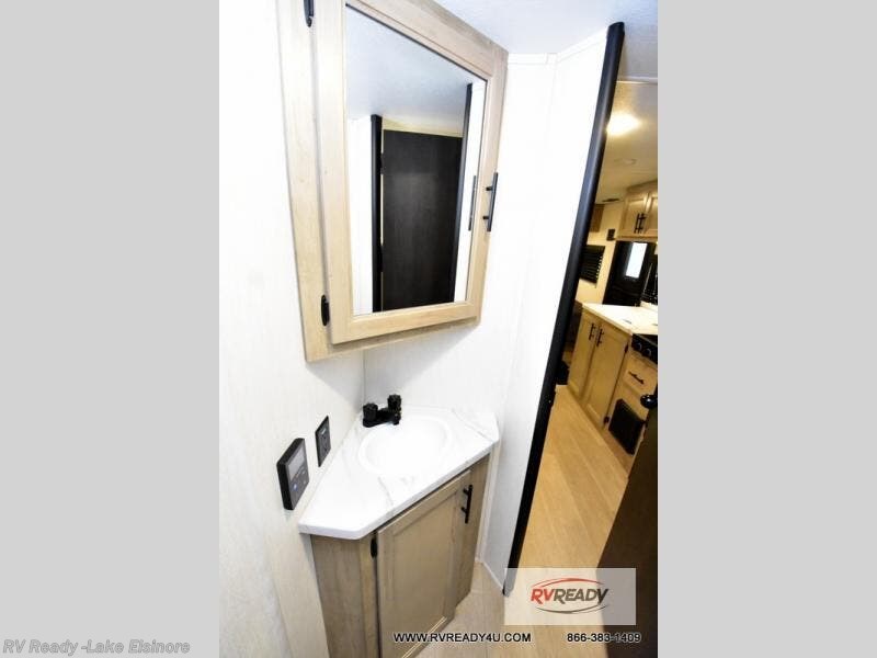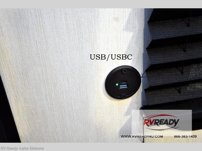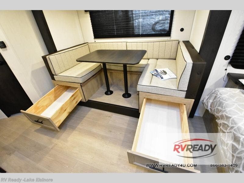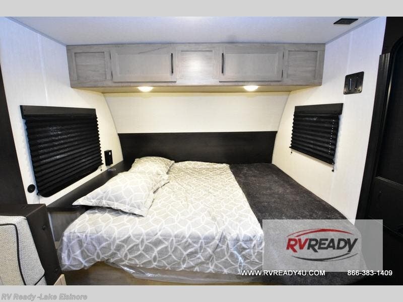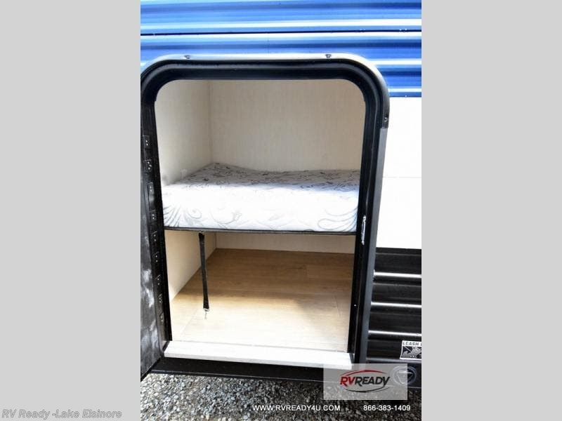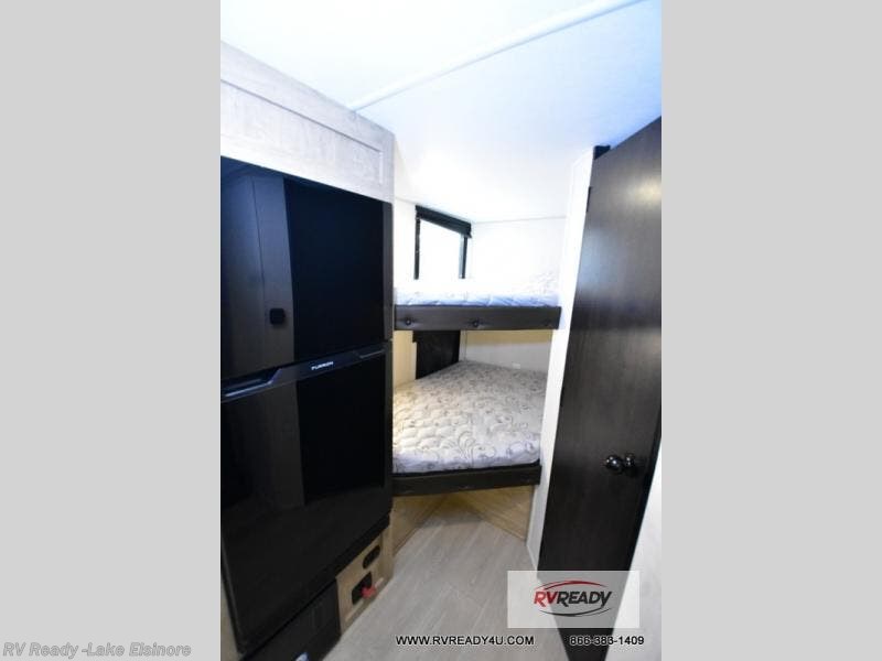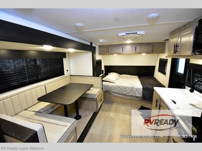 This family travel trailer is ready to head to the campground whenever you are! The kiddos can sleep on the set of double-size bed bunks, and you can sleep on the front queen bed, plus the U-shaped dinette slide can also transform into an extra sleeping space when you aren't using it to enjoy a meal prepared with the cooktop. You can also prepare your delicious meals at the outside mini kitchen and stay protected by the power awning. The exterior not only has outside storage and an outside TV mount but also features an outside storage plus door for access to the storage space underneath the bottom bunk bed. The rear corner bath allows everyone to stay clean and refreshed while you camp.