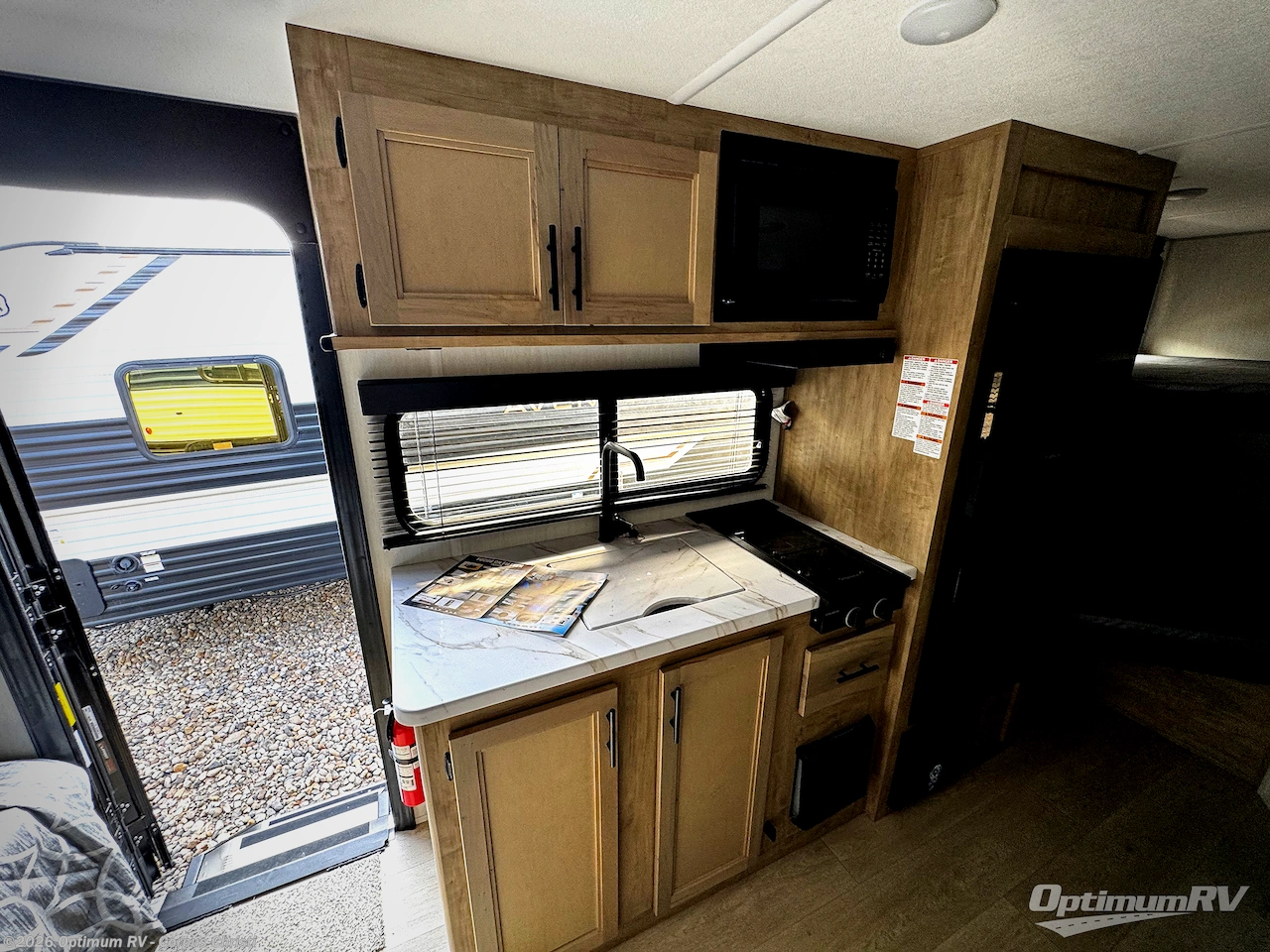 This family travel trailer is ready to head to the campground whenever you are! The kiddos can sleep on the set of double-size bed bunks, and you can sleep on the front queen bed, plus the U-shaped dinette slide can also transform into an extra sleeping space when you aren't using it to enjoy a meal prepared with the cooktop. You can also prepare your delicious meals at the outside mini kitchen and stay protected by the power awning. The exterior not only has outside storage and an outside TV mount but also features an outside storage plus door for access to the storage space underneath the bottom bunk bed. The rear corner bath allows everyone to stay clean and refreshed while you camp.