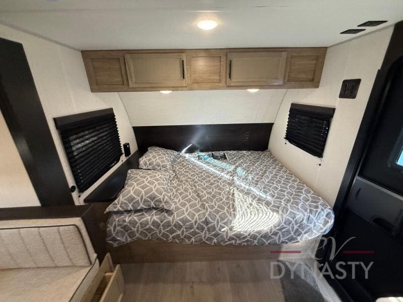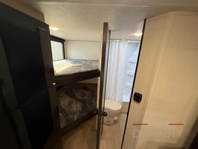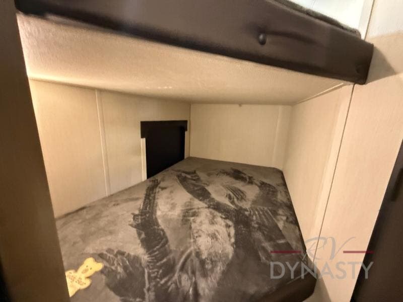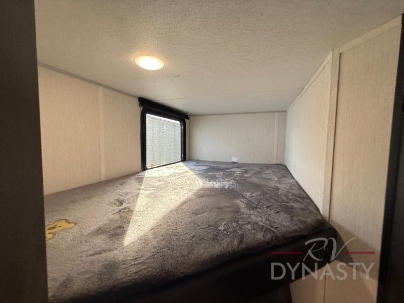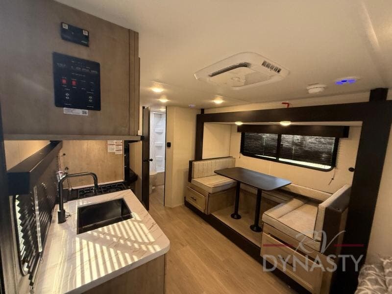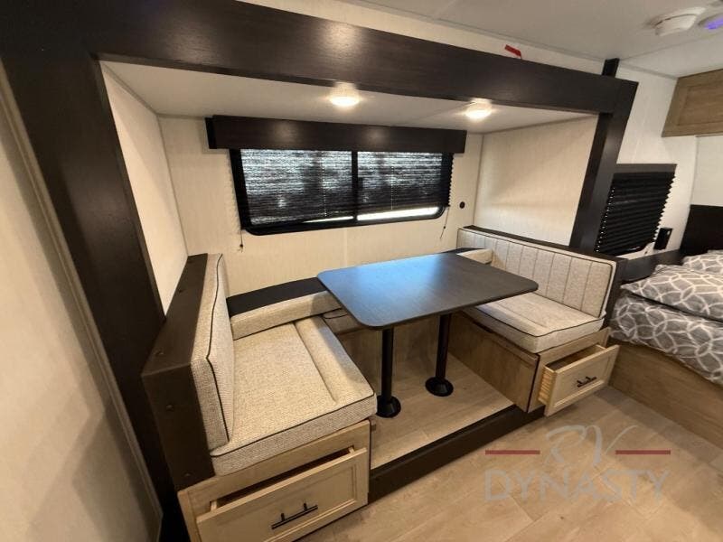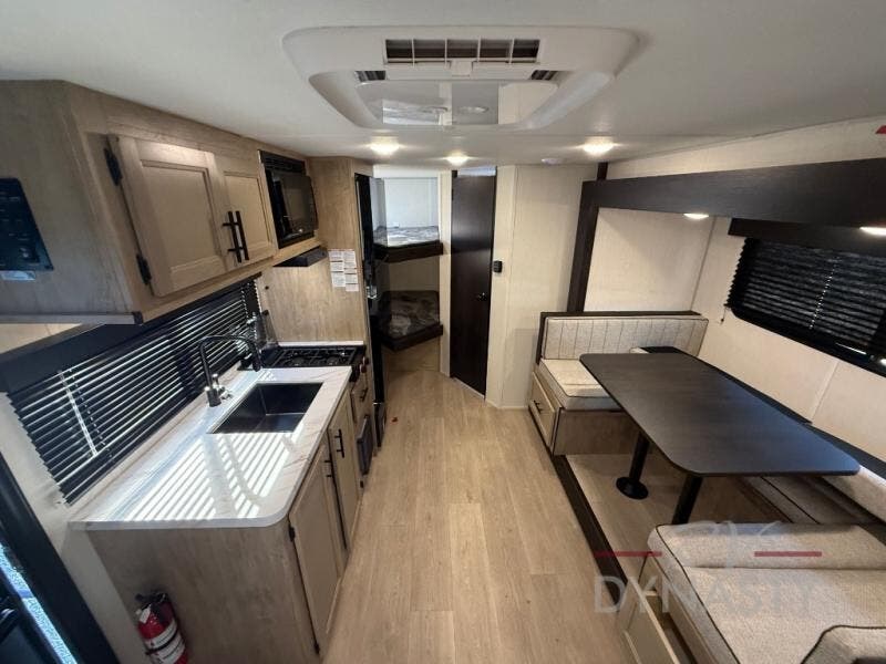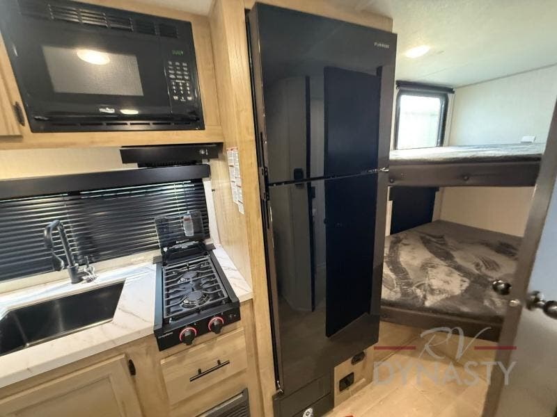 This family travel trailer is ready to head to the campground whenever you are! The kiddos can sleep on the set of double-size bed bunks, and you can sleep on the front queen bed, plus the U-shaped dinette slide can also transform into an extra sleeping space when you aren't using it to enjoy a meal prepared with the cooktop. You can also prepare your delicious meals at the outside mini kitchen and stay protected by the power awning. The exterior not only has outside storage and an outside TV mount but also features an outside storage plus door for access to the storage space underneath the bottom bunk bed. The rear corner bath allows everyone to stay clean and refreshed while you camp.