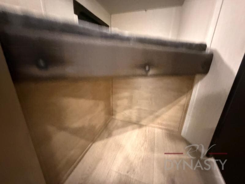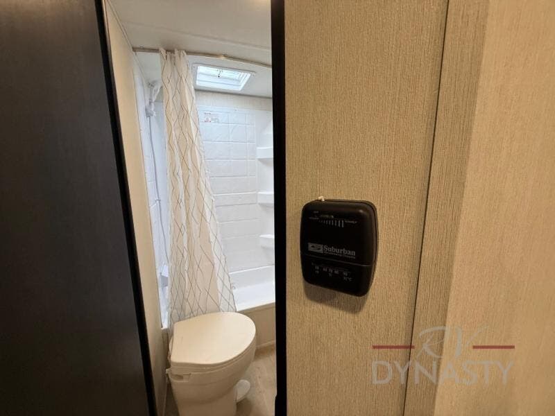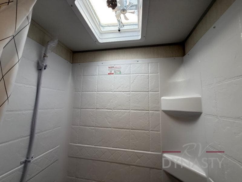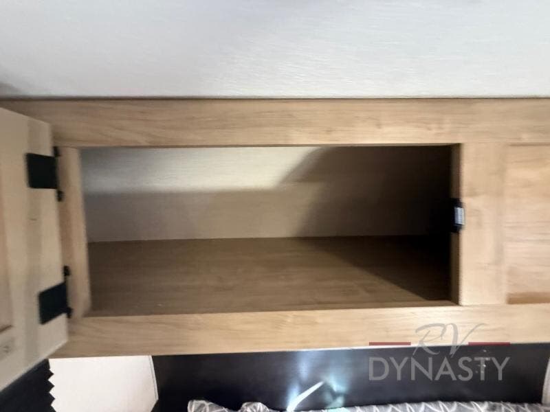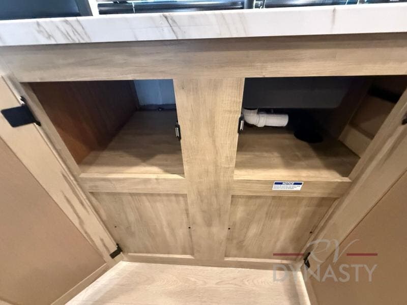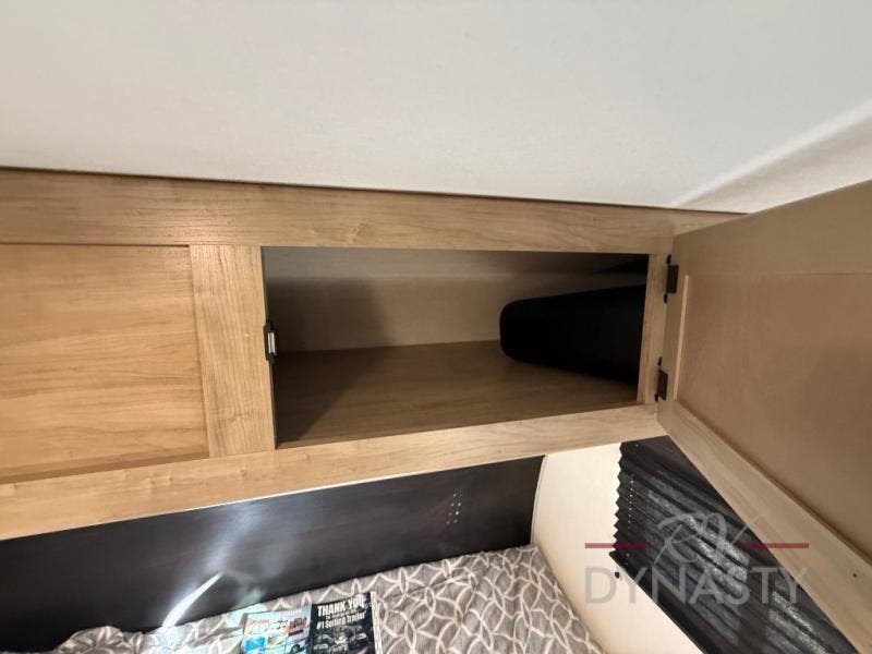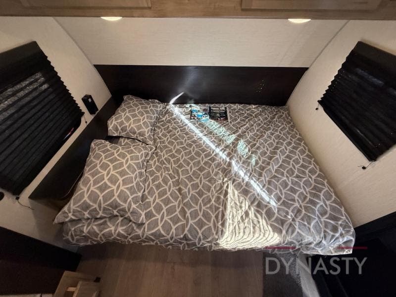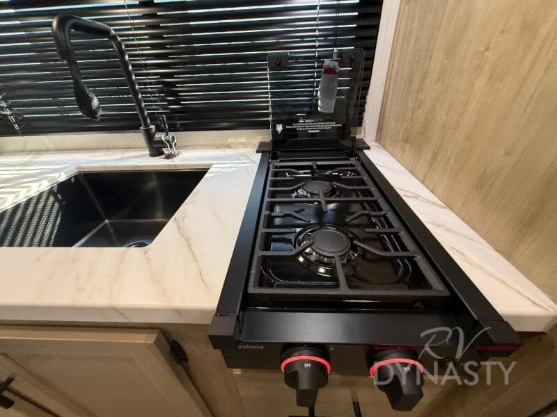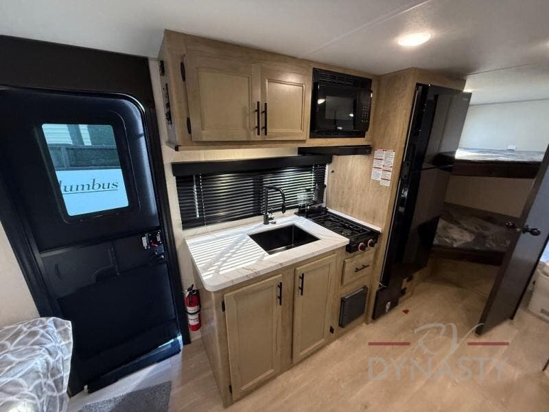 This family travel trailer is ready to head to the campground whenever you are! The kiddos can sleep on the set of double-size bed bunks, and you can sleep on the front queen bed, plus the U-shaped dinette slide can also transform into an extra sleeping space when you aren't using it to enjoy a meal prepared with the cooktop. You can also prepare your delicious meals at the outside mini kitchen and stay protected by the power awning. The exterior not only has outside storage and an outside TV mount but also features an outside storage plus door for access to the storage space underneath the bottom bunk bed. The rear corner bath allows everyone to stay clean and refreshed while you camp.