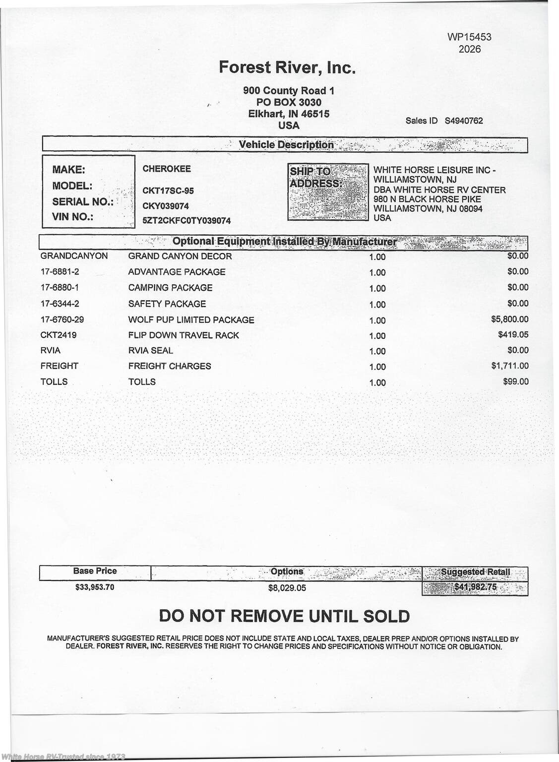 This 2026 Cherokee Wolf Pup Toy Hauler Travel Trailer (Stock #WP15453) includes the Advantage Package, Camping Package, Safety Package and Wolf Pup Limited Package. MSRP $41,982.75.