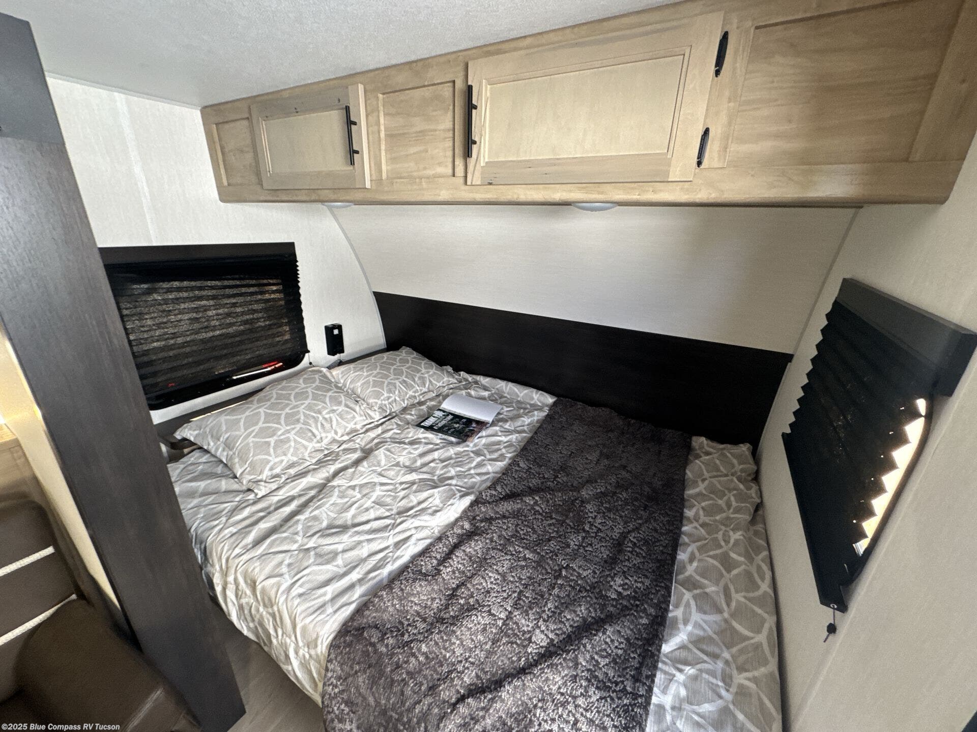 Camping trips in this spacious travel trailer are sure to bring memories! Once you arrive at the campground, you can unload the outside storage, put out the 12' awning, and enjoy the outdoor mini kitchen. Once inside, you can dine at the booth dinette, relax on the sofa, and freshen up in the full bath with a tub/shower. The front queen bed will provide a great night's rest, while your guests sleep on the living area furniture. This travel trailer also includes ample interior storage, including a spacious kitchen pantry, an overhead cabinet above the bed, plus additional storage beside the refrigerator!