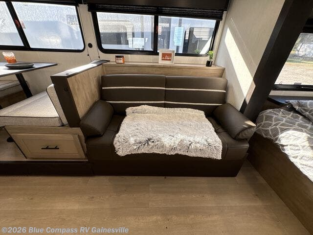 Camping trips in this spacious travel trailer are sure to bring memories! Once you arrive at the campground, you can unload the outside storage, put out the 12' awning, and enjoy the outdoor mini kitchen. Once inside, you can dine at the booth dinette, relax on the sofa, and freshen up in the full bath with a tub/shower. The front queen bed will provide a great night's rest, while your guests sleep on the living area furniture. This travel trailer also includes ample interior storage, including a spacious kitchen pantry, an overhead cabinet above the bed, plus additional storage beside the refrigerator!