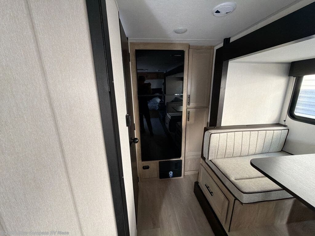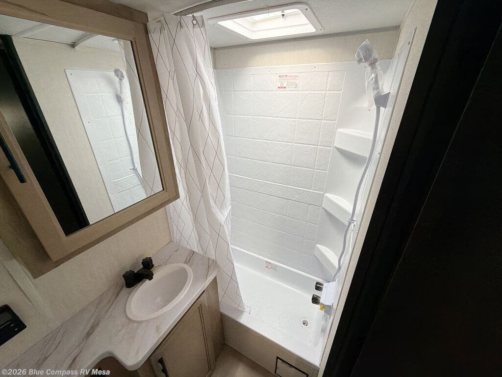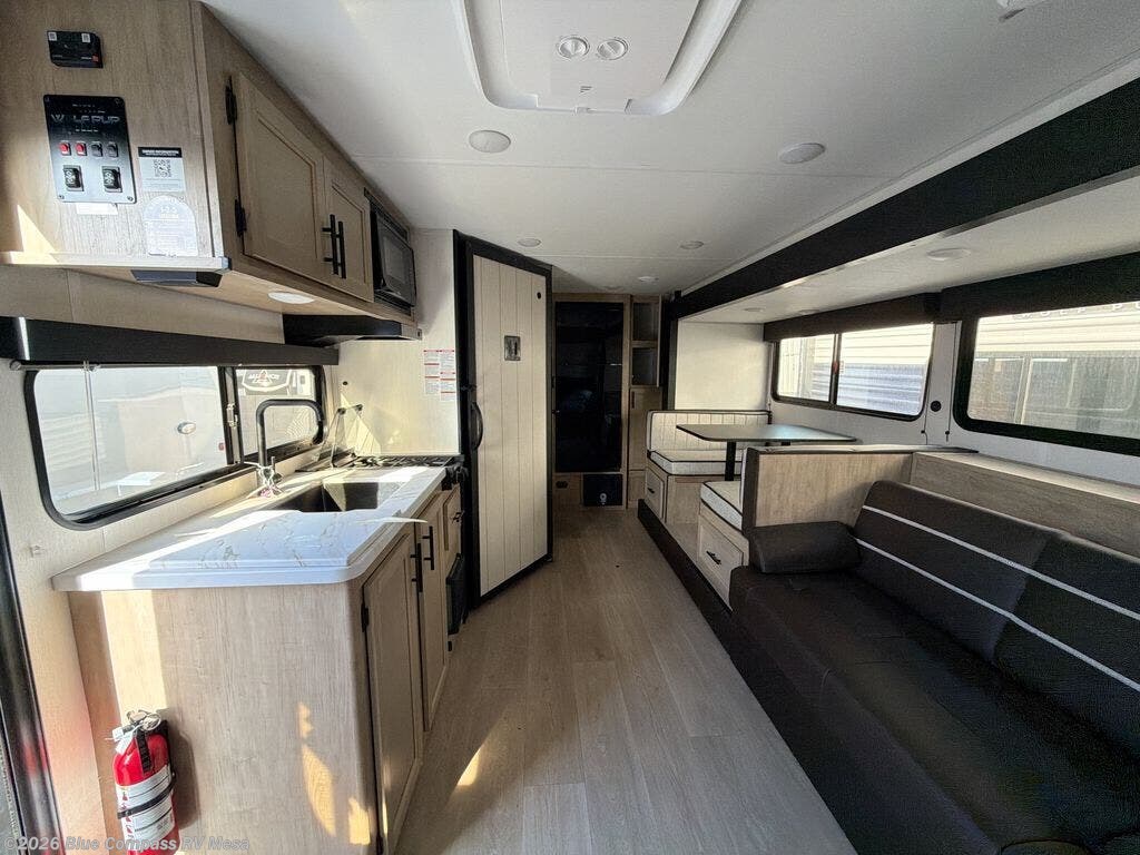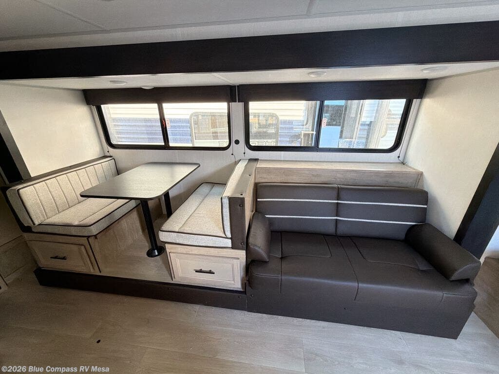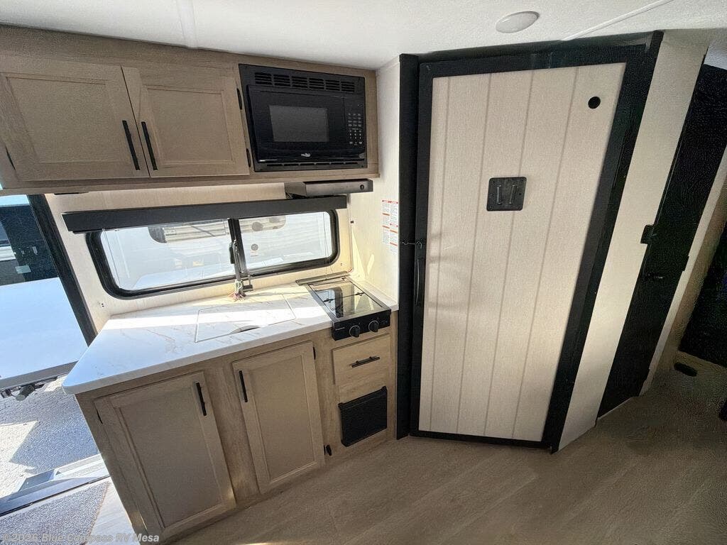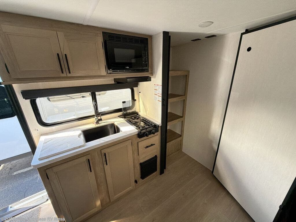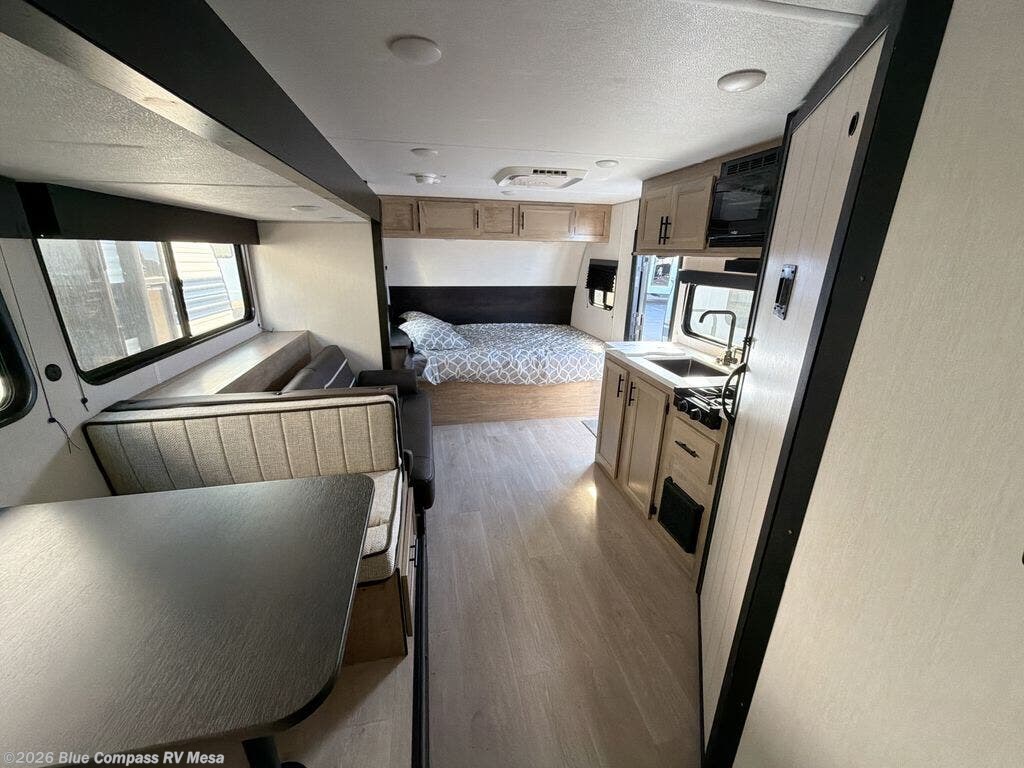 Camping trips in this spacious travel trailer are sure to bring memories! Once you arrive at the campground, you can unload the outside storage, put out the 12' awning, and enjoy the outdoor mini kitchen. Once inside, you can dine at the booth dinette, relax on the sofa, and freshen up in the full bath with a tub/shower. The front queen bed will provide a great night's rest, while your guests sleep on the living area furniture. This travel trailer also includes ample interior storage, including a spacious kitchen pantry, an overhead cabinet above the bed, plus additional storage beside the refrigerator!