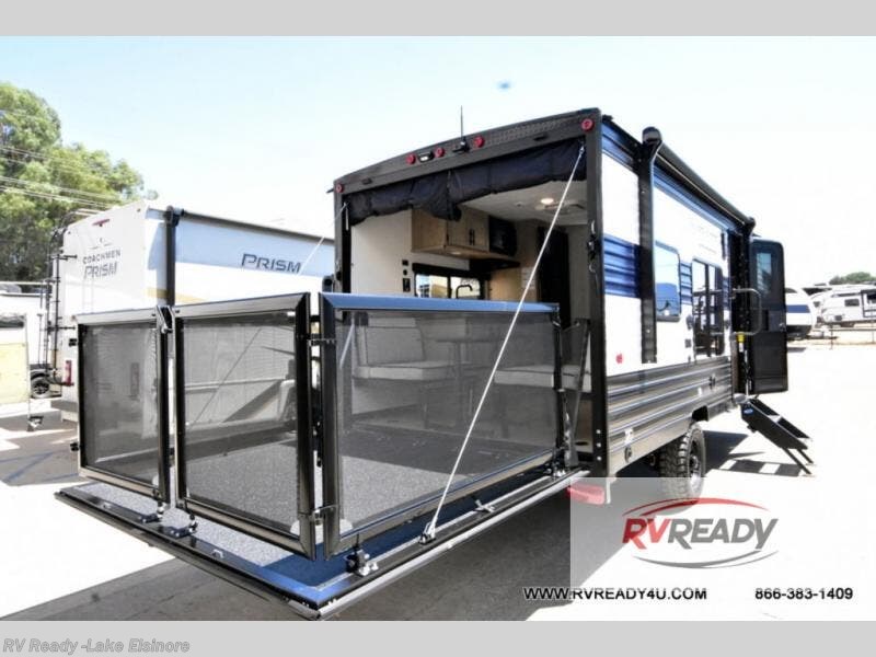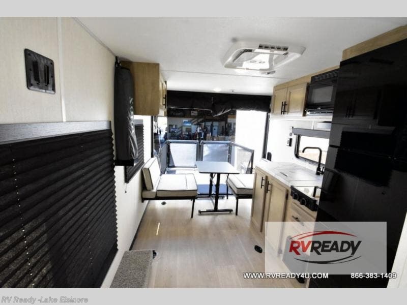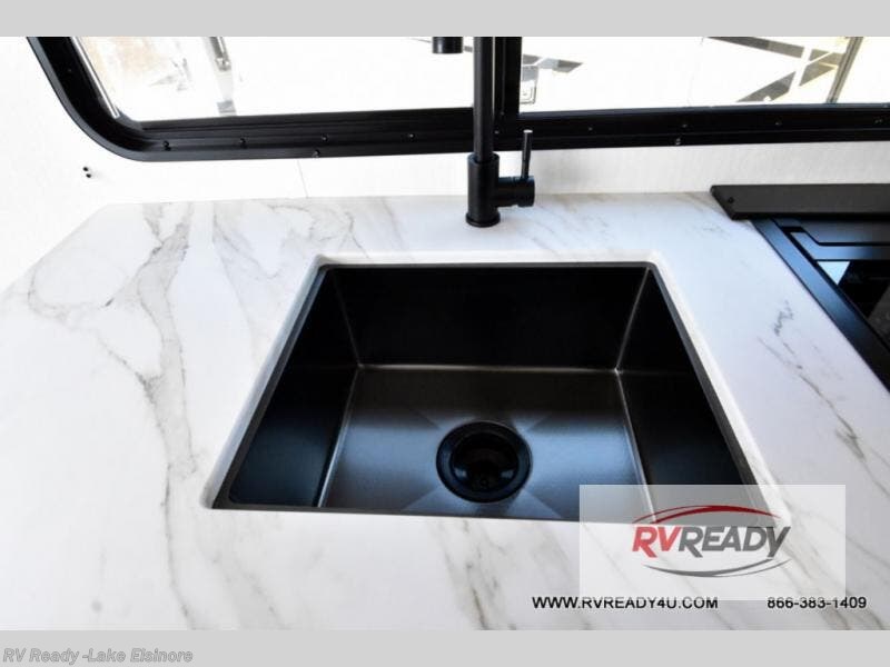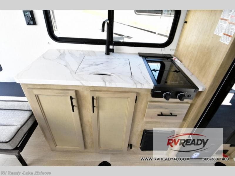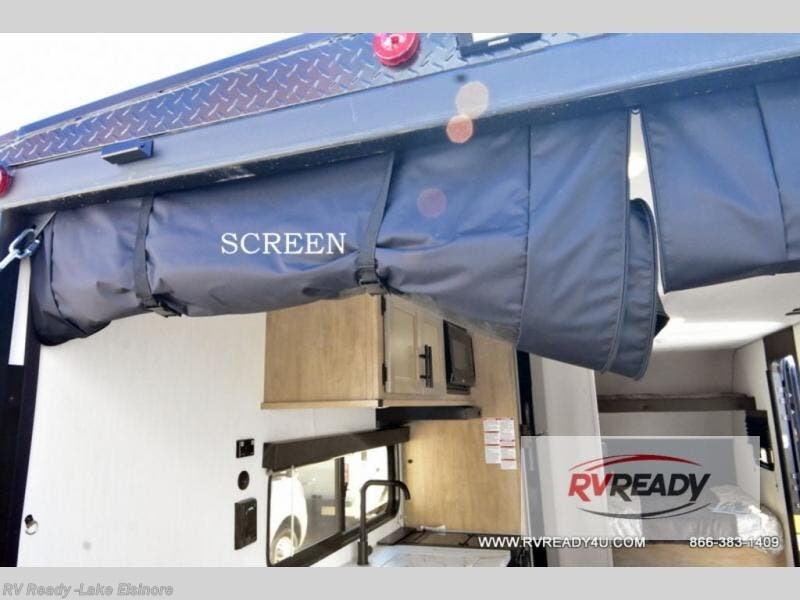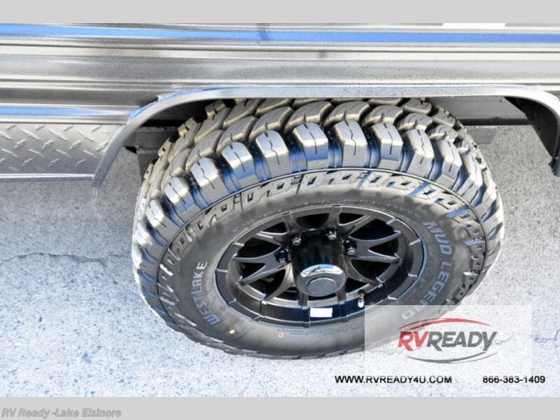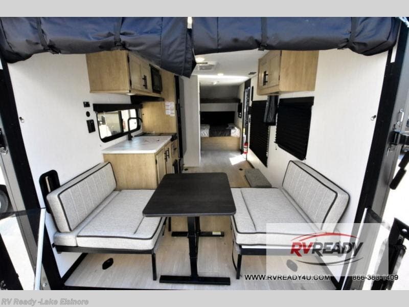 Sleeping for five and up to 13' 11" for your toys makes for an exciting adventure. The rear ramp door makes it easy to load and unload your toys, and once you are camped and the toys are removed, you can set up the dinette in back with removeable table. At night, this can double as sleeping space for two more tired campers. Up front, a queen bed with bunk above, plus storage. A tub/shower will keep everyone feeling their best, and the modern chef's kitchen will allow you to keep everyone fueled and ready for fun! There is also outside storage up front and a 12' awning for added living space outside to enjoy.