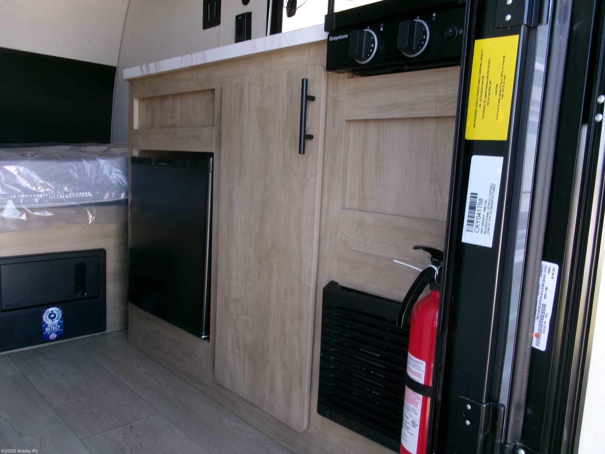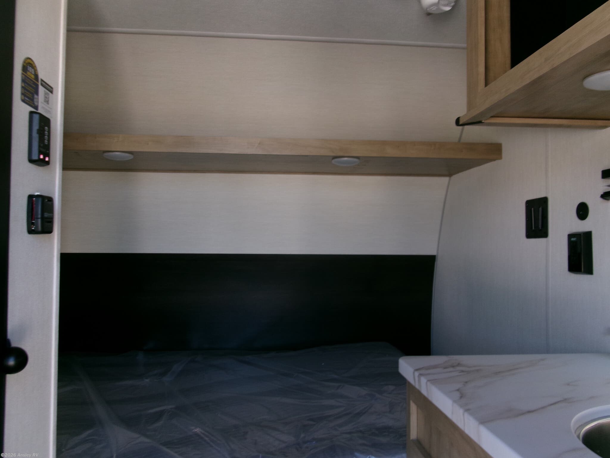 Featuring a compact, no-frills layout that keeps everything within reach. At the front of the unit, the queen bed sits as the main feature of the space, providing a simple and comfortable place to rest without any separate living area. Just beside the bed, the small kitchen setup includes a conveniently placed microwave, making it easy to heat up meals while maximizing the limited space. Above the kitchenette, overhead cabinets offer essential storage for your belongings, helping you stay organized in this efficient layout. With its straightforward design and all-in-one front layout, built for easy, practical camping without unnecessary extras.
