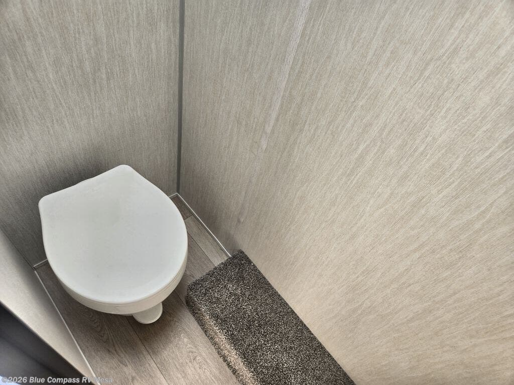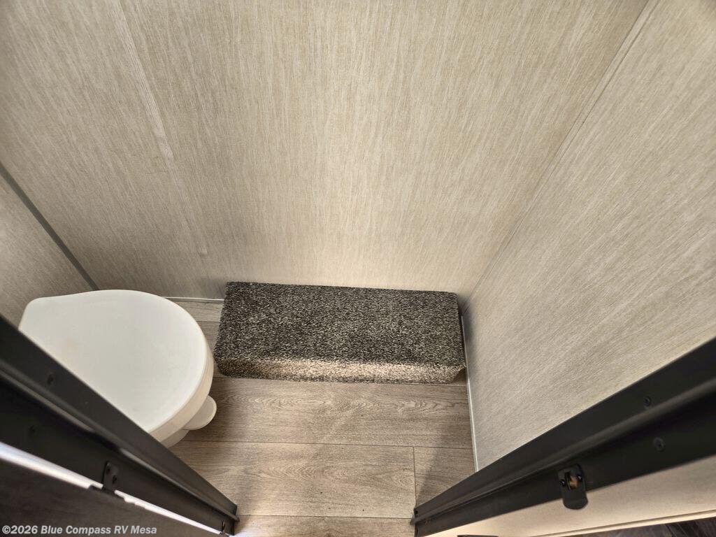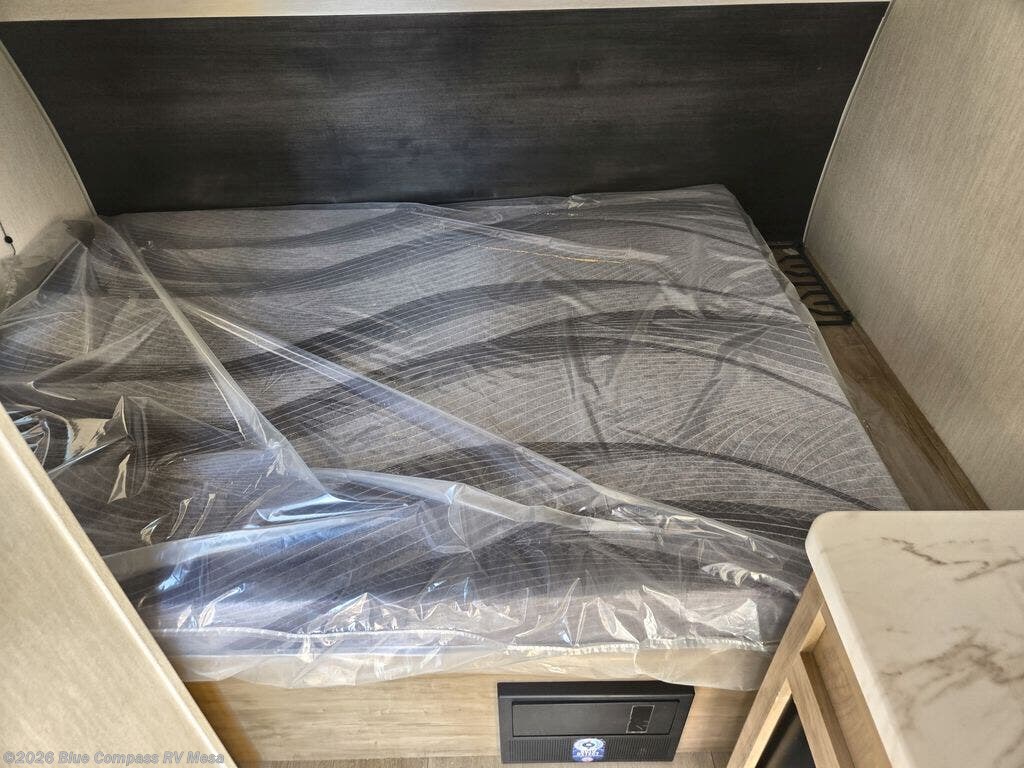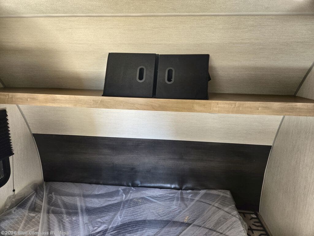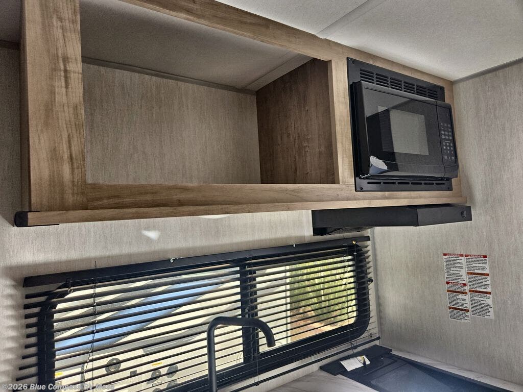Featuring a compact, no-frills layout that keeps everything within reach. At the front of the unit, the queen bed sits as the main feature of the space, providing a simple and comfortable place to rest without any separate living area. Just beside the bed, the small kitchen setup includes a conveniently placed microwave, making it easy to heat up meals while maximizing the limited space. Above the kitchenette, overhead cabinets offer essential storage for your belongings, helping you stay organized in this efficient layout. With its straightforward design and all-in-one front layout, built for easy, practical camping without unnecessary extras.