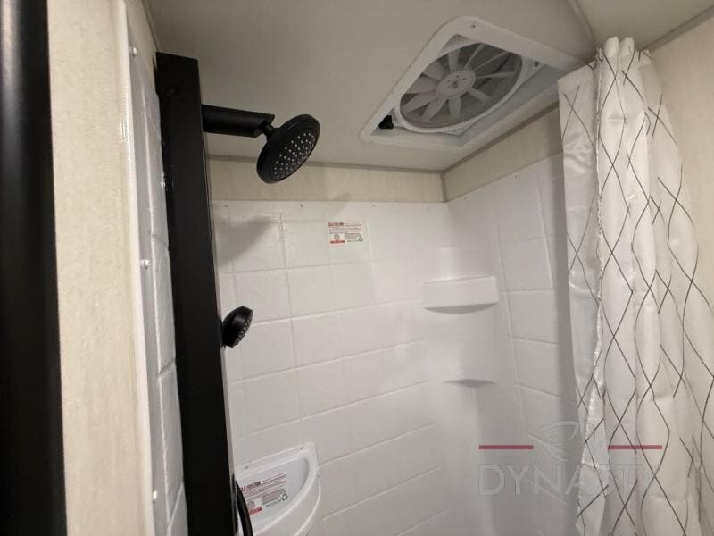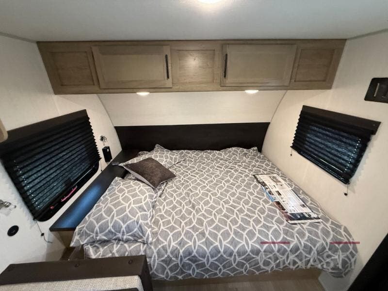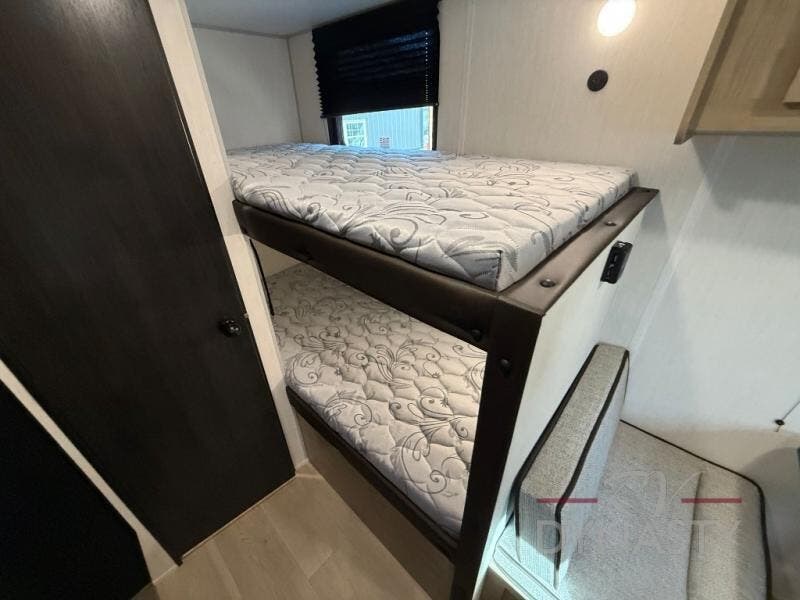 The whole family can sleep comfortably in this travel trailer! It has a set of bunk beds for the kids or guests to sleep on, and you can sleep comfortably on the front queen bed with overhead cabinets and a shelf. There is even an exterior storage plus door that accesses the storage space under the bottom bunk. The chef will enjoy preparing their best home cooked meals either indoors with the cooktop or at the outside mini kitchen while staying protected by the 12' power awning!