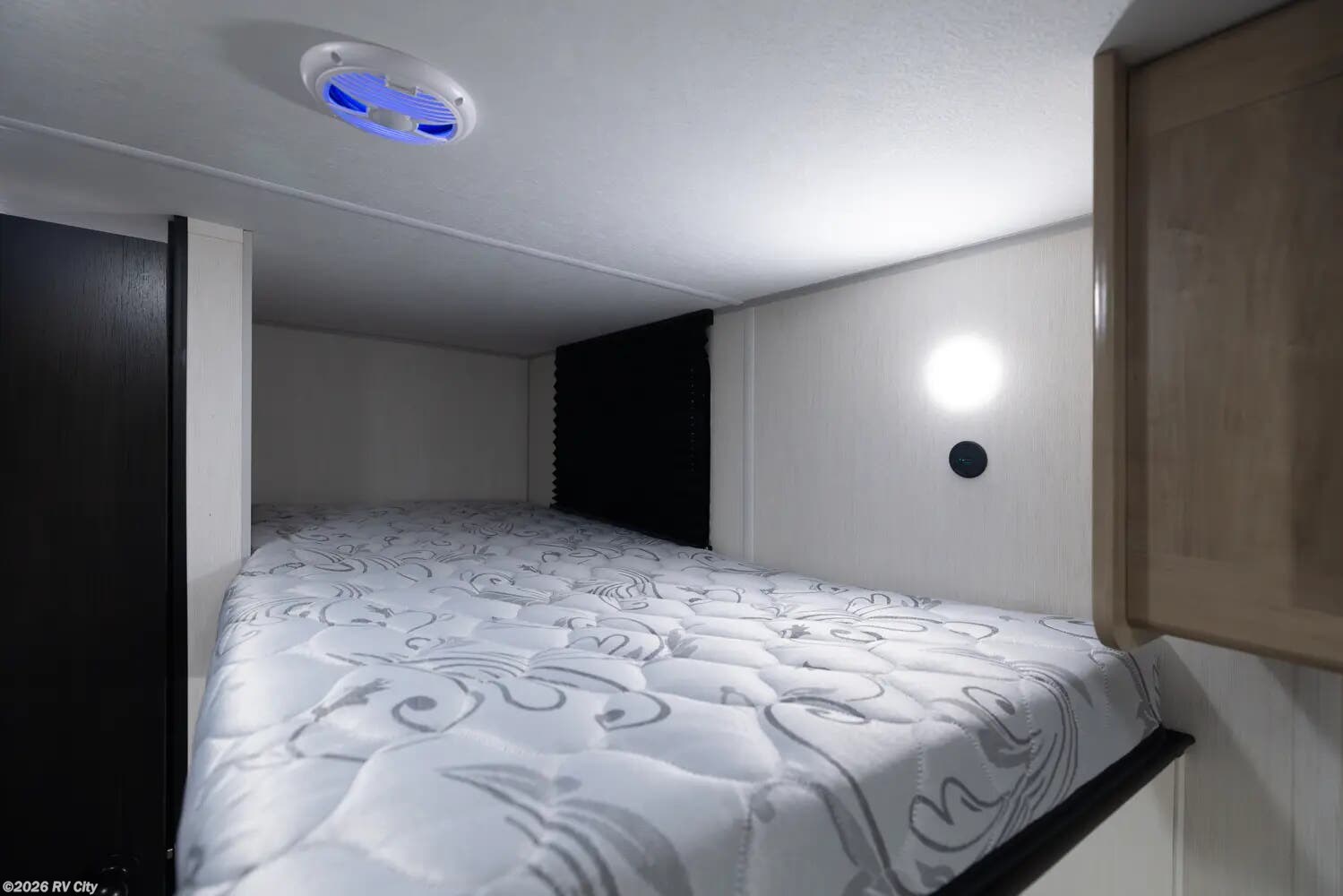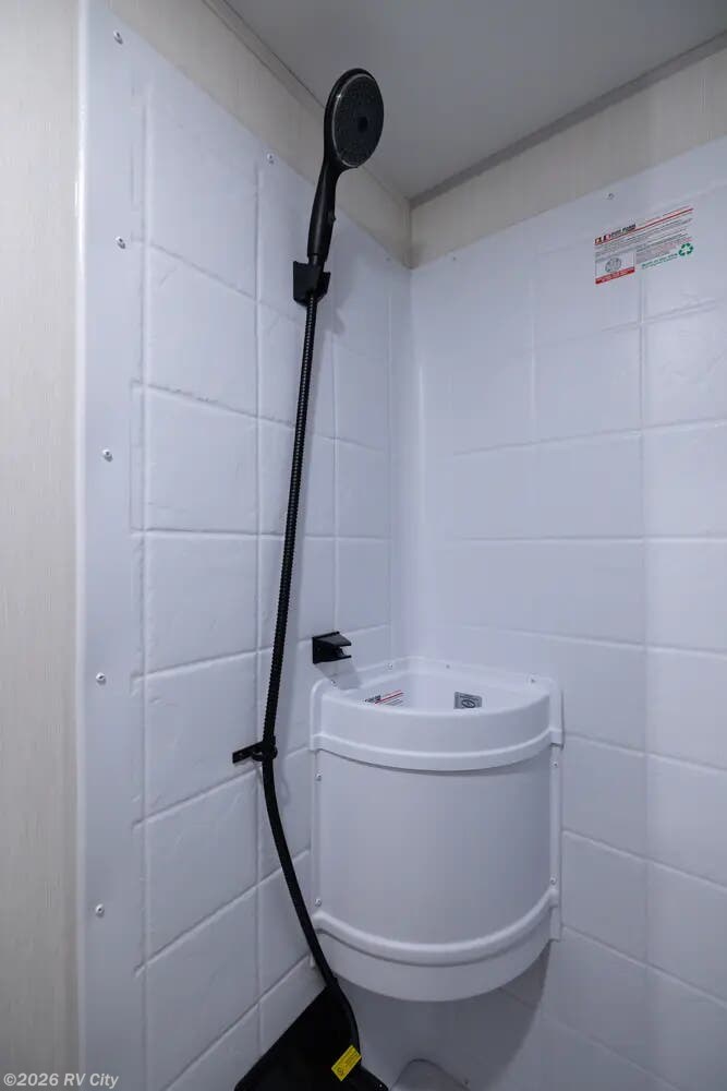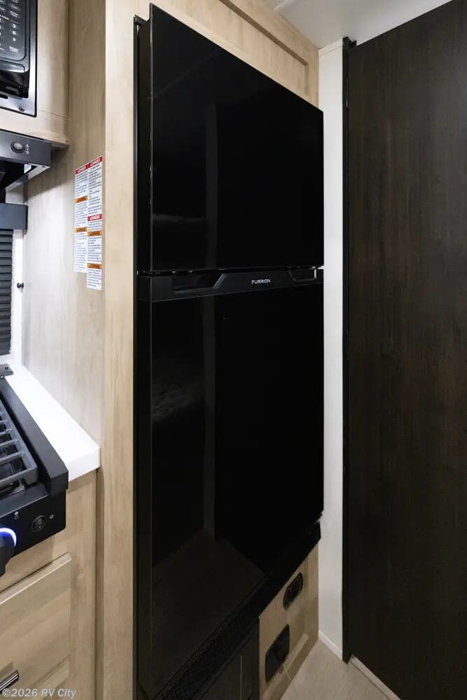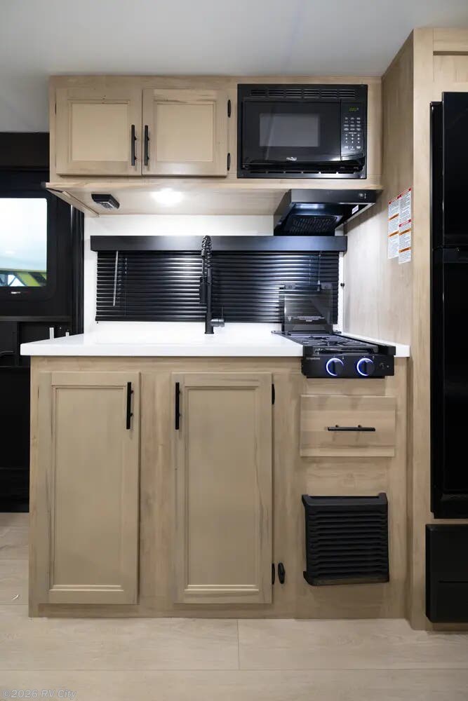 Providing sleeping for as many as 5, this family friendly trailer has a large kitchen with a flush mount glass cooktop, huge sink, ample counter space, and a 10.3 cu.ft. double door refrigerator. There is storage throughout the trailer with a large exterior pack and play door to access storage under the bottom bunk. Exterior features include full-size power awning, mini kitchen, MORryde stable step, RVQ quick connect system, standard coach stabilizing system, and LED lighting.