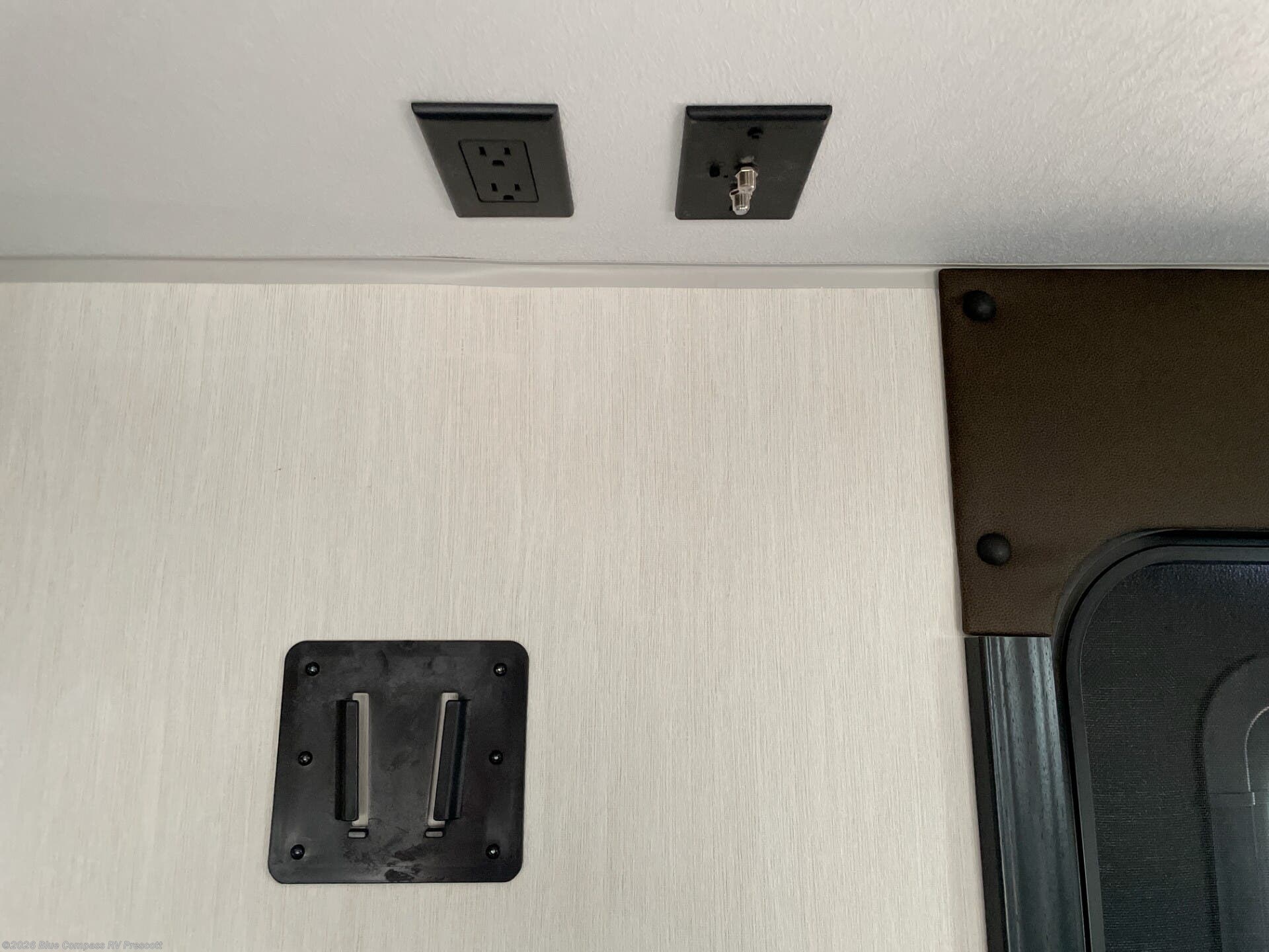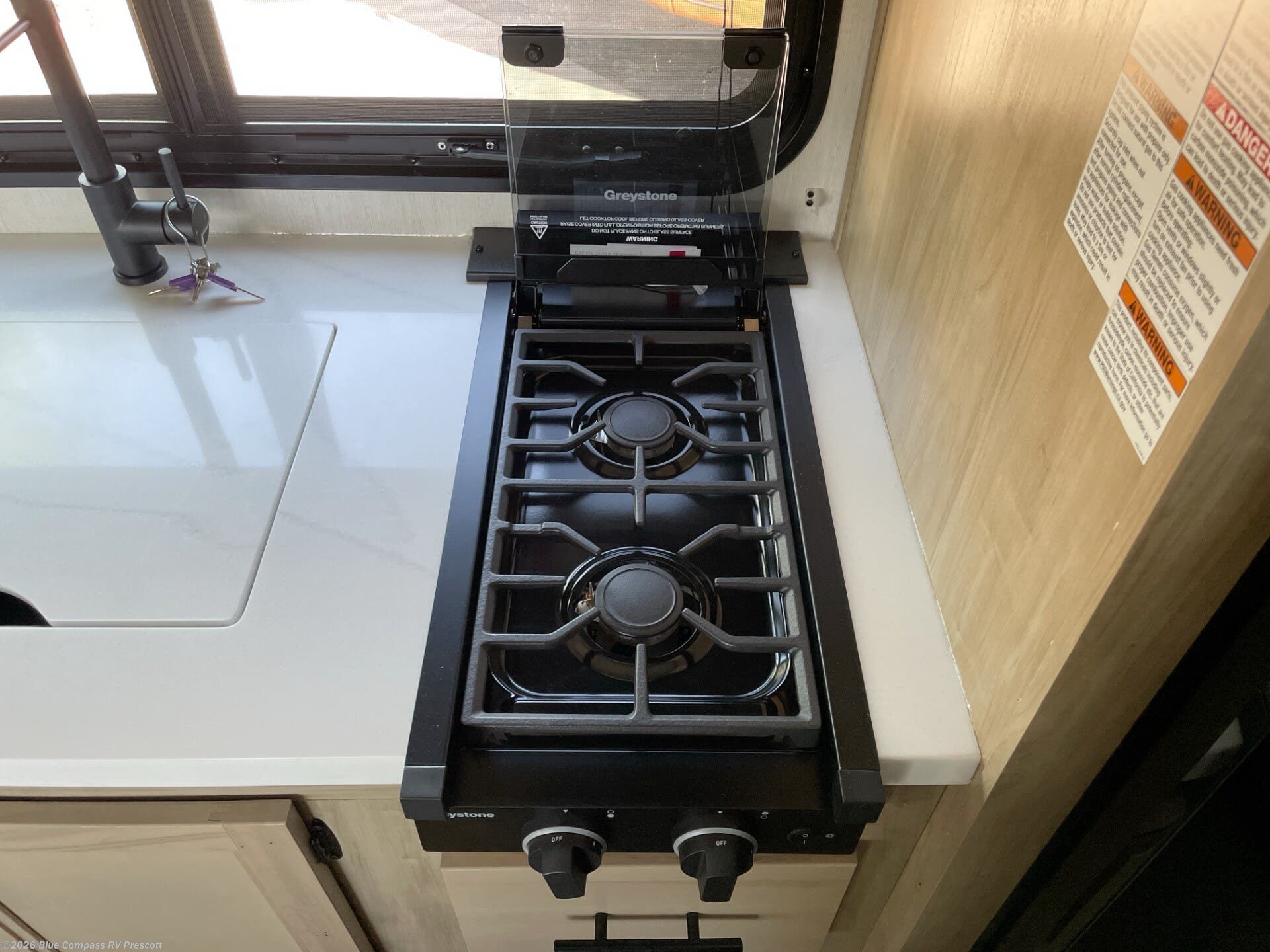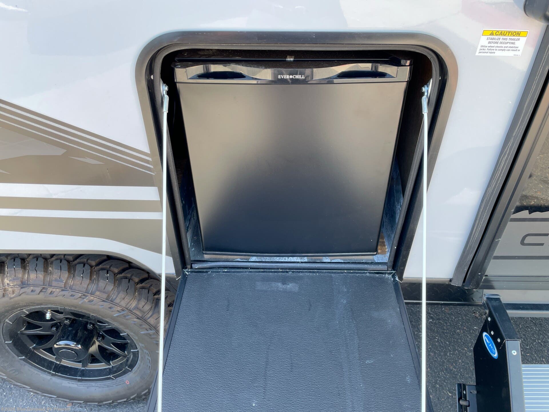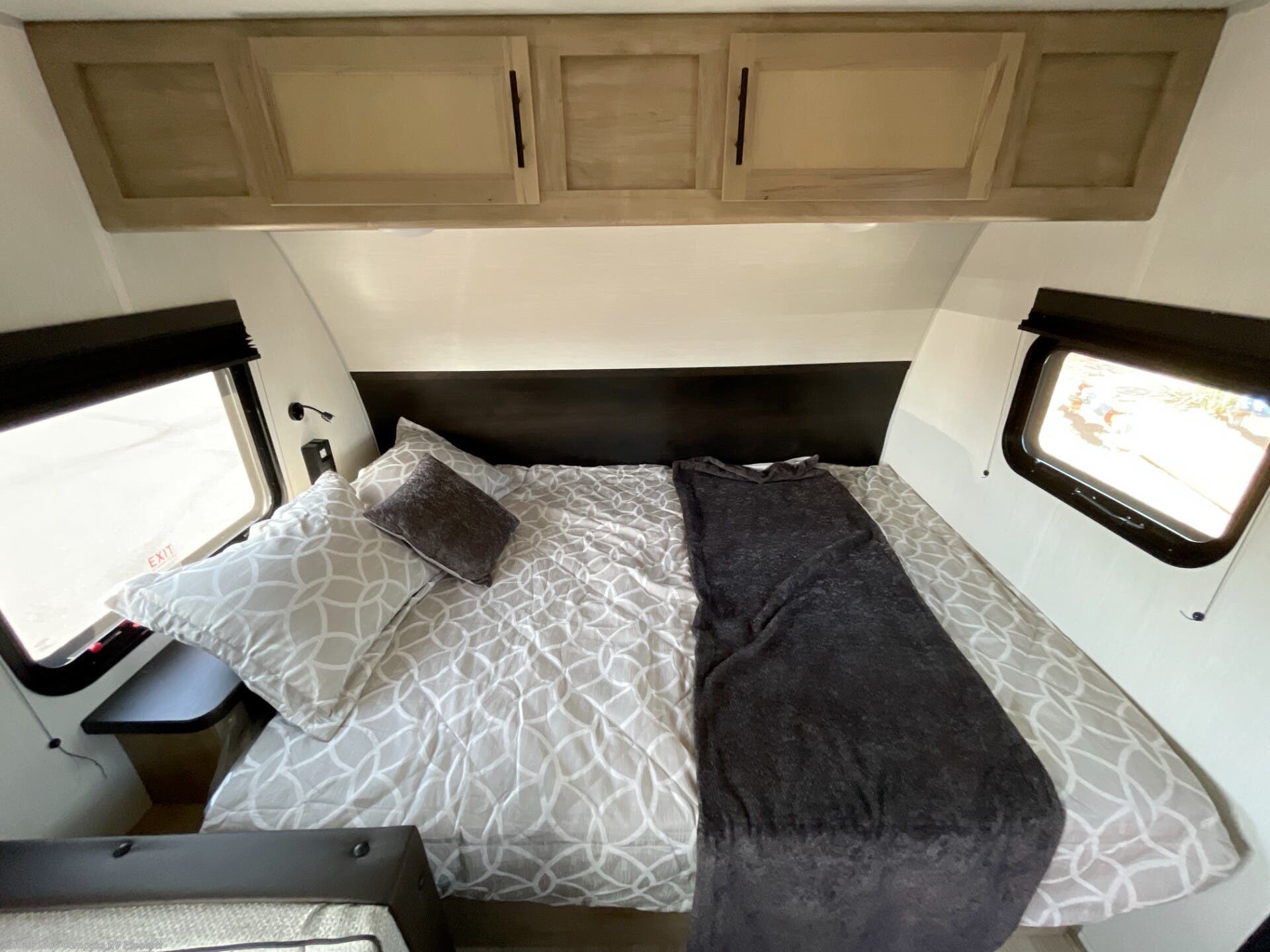 The whole family can sleep comfortably in this travel trailer! It has a set of bunk beds for the kids or guests to sleep on, and you can sleep comfortably on the front queen bed with overhead cabinets and a shelf. There is even an exterior storage plus door that accesses the storage space under the bottom bunk. The chef will enjoy preparing their best home cooked meals either indoors with the cooktop or at the outside mini kitchen while staying protected by the 12' power awning!