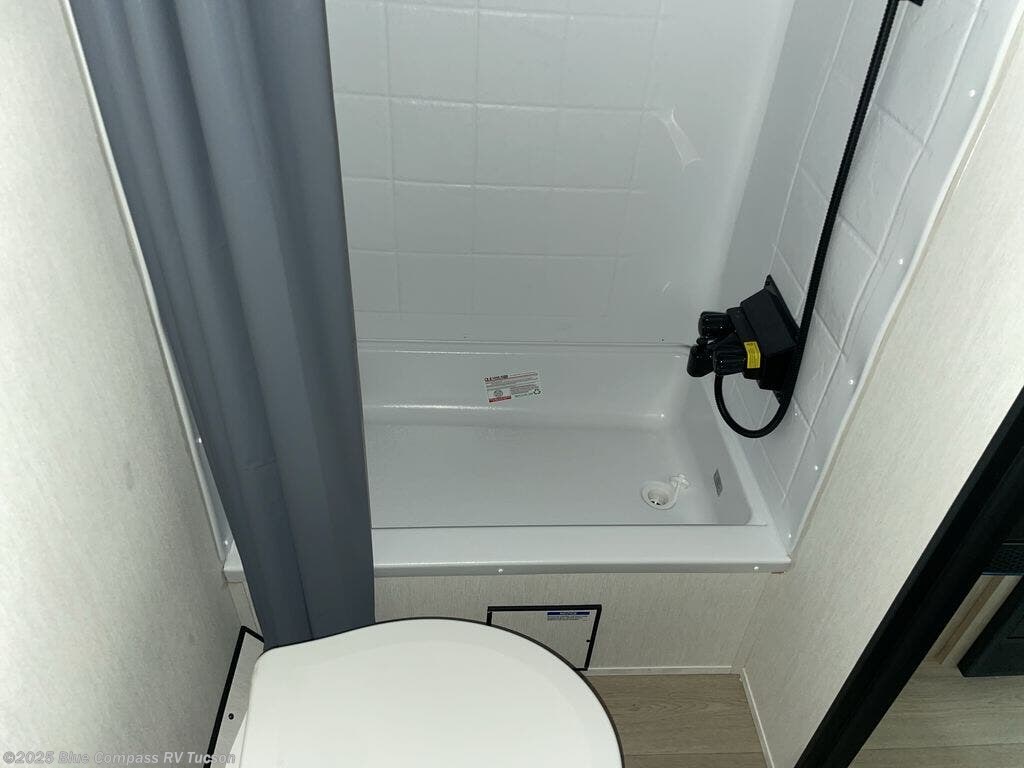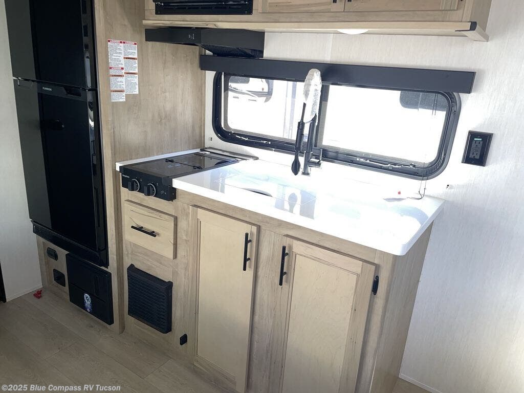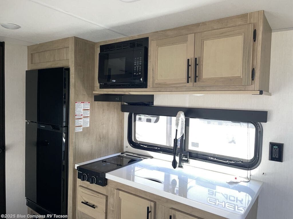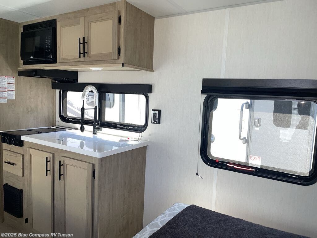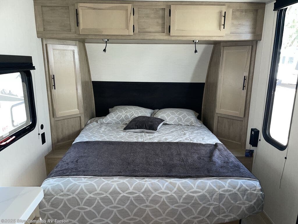 You will love camping in this travel trailer with your own walk-around queen bed up front, plus a full rear bathroom with a tub/shower, toilet, and sink. Fill your bellies with the perishables stored in the refrigerator and cook them on the cooktop. You could even prepare a meal while breathing in some fresh air at the outside mini kitchen while staying protected by the 12' awning. This travel trailer also includes outside storage to keep camp gear tucked away!