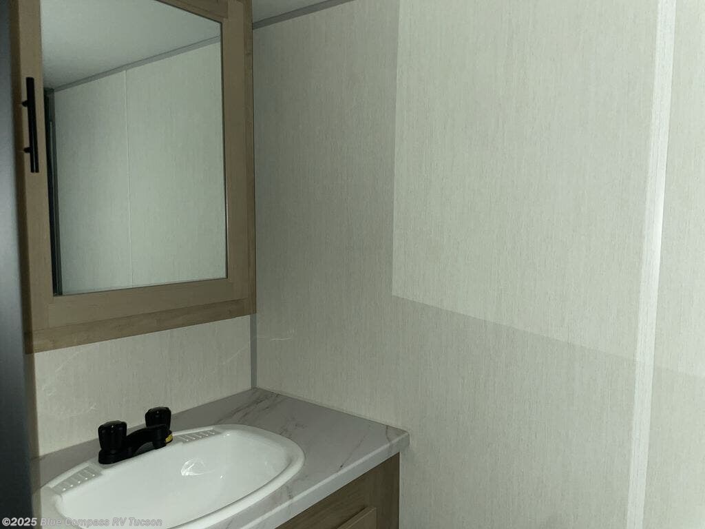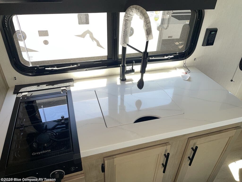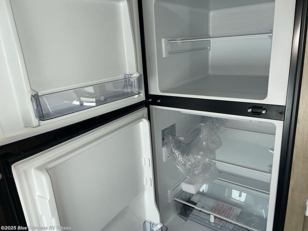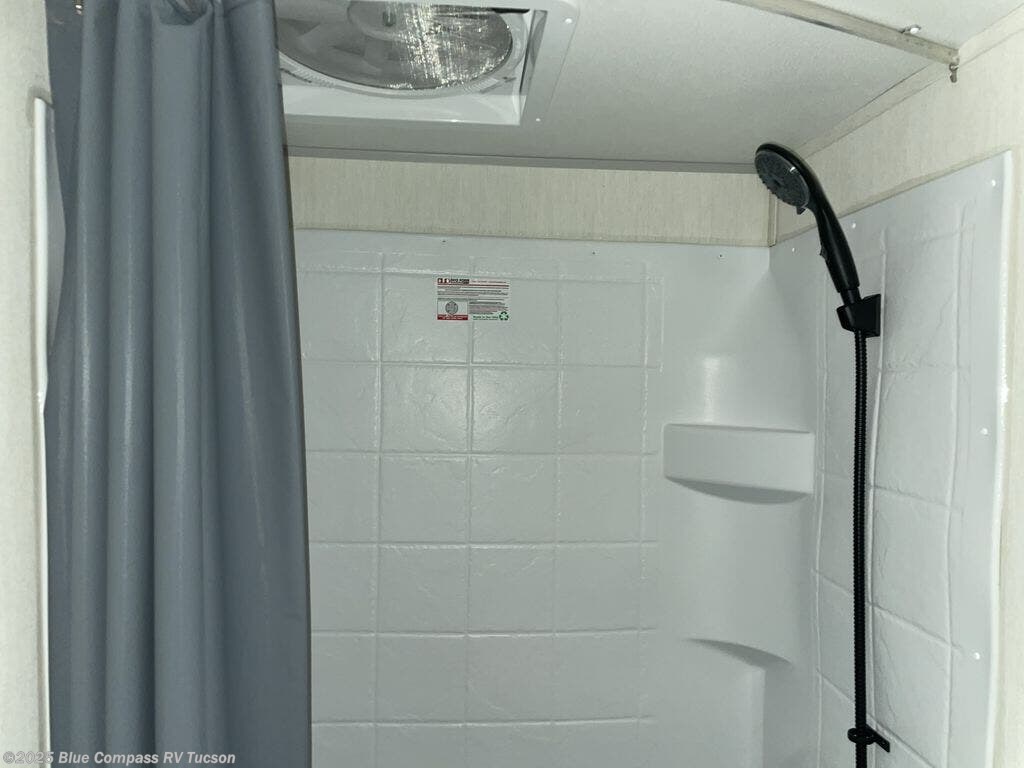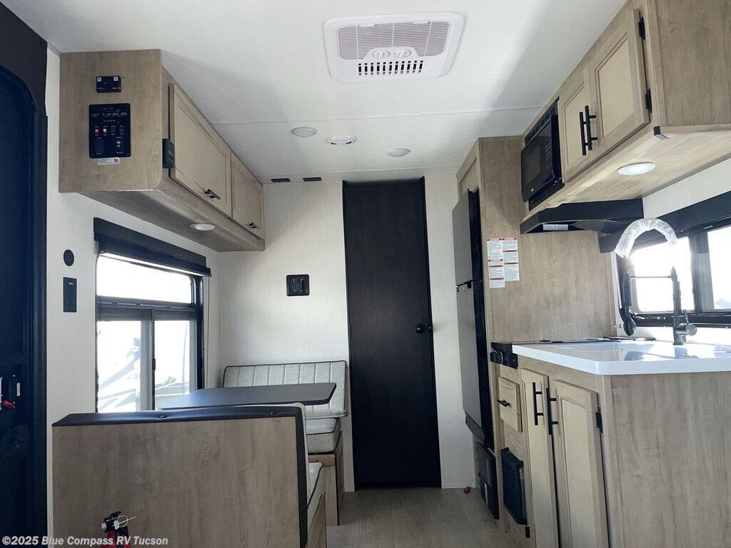 You will love camping in this travel trailer with your own walk-around queen bed up front, plus a full rear bathroom with a tub/shower, toilet, and sink. Fill your bellies with the perishables stored in the refrigerator and cook them on the cooktop. You could even prepare a meal while breathing in some fresh air at the outside mini kitchen while staying protected by the 12' awning. This travel trailer also includes outside storage to keep camp gear tucked away!
