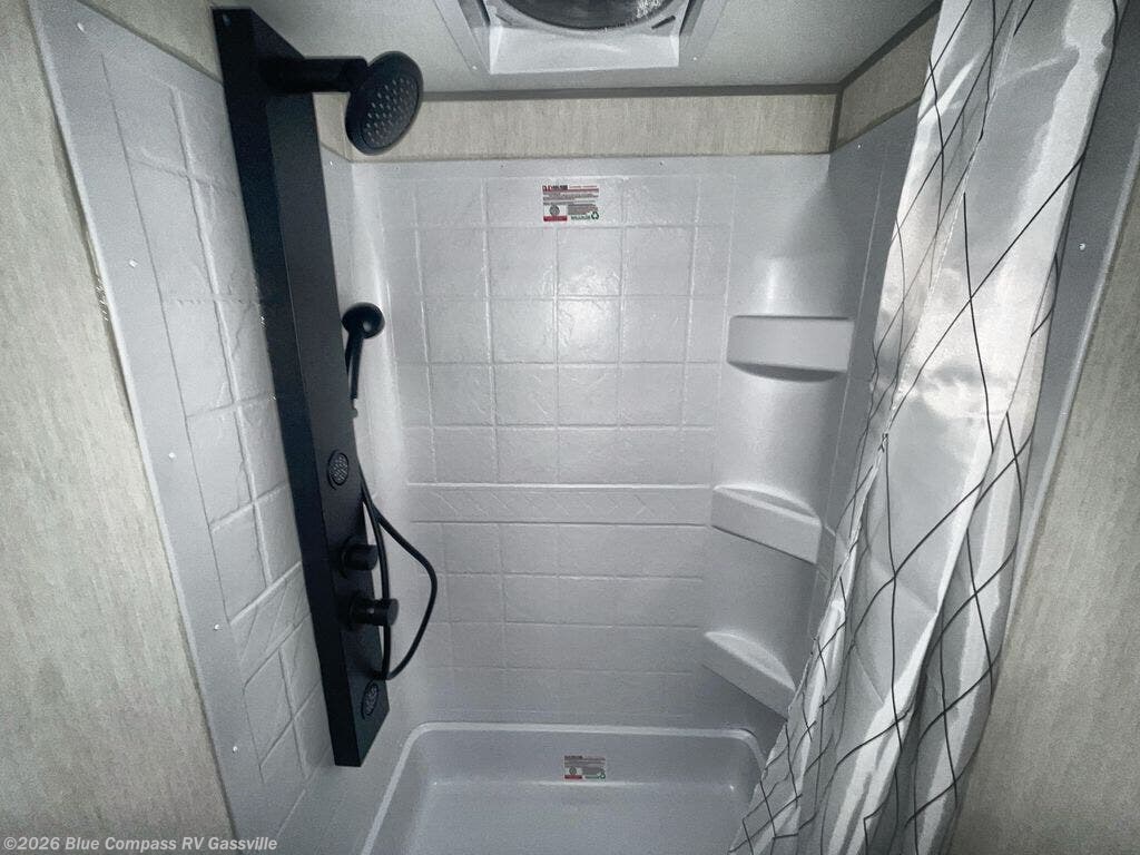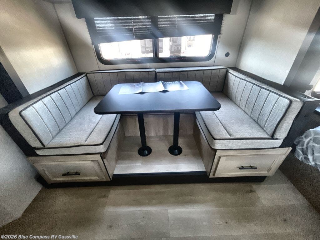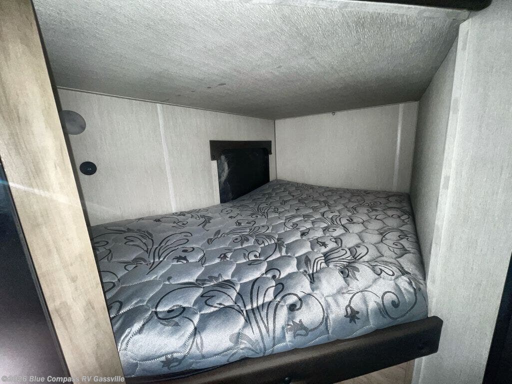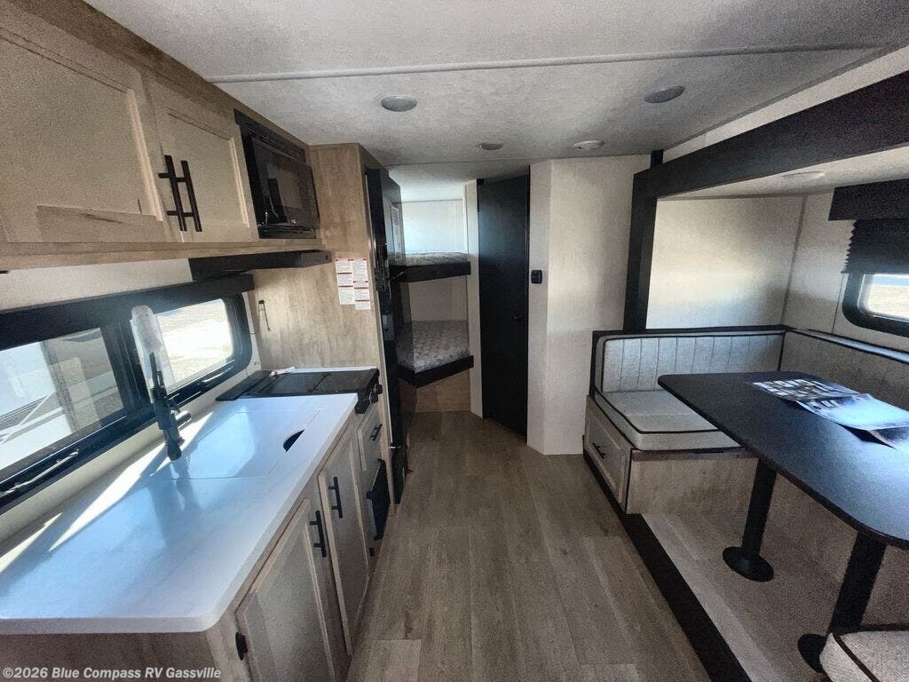This family travel trailer is ready to head to the campground whenever you are! The kiddos can sleep on the set of double-size bed bunks, and you can sleep on the front queen bed, plus the U-shaped dinette slide can also transform into an extra sleeping space when you aren't using it to enjoy a meal. You can prepare your delicious meals on the range or at the outside mini kitchen and stay protected by the awning. The exterior not only has outside storage and an outside TV mount but also features an outside storage plus door for access to the storage space underneath the bottom bunk bed. The rear corner bath allows everyone to stay clean and refreshed while you camp.