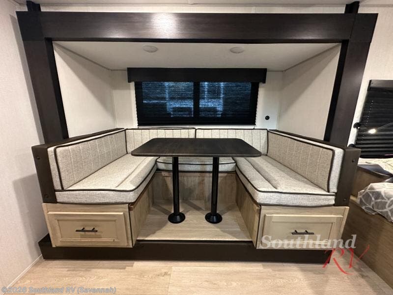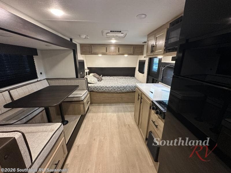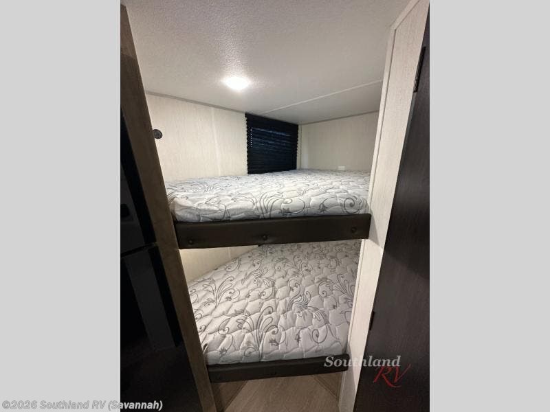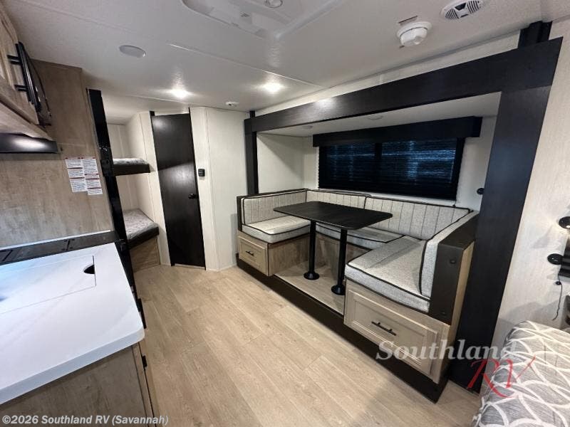This family travel trailer is ready to head to the campground whenever you are! The kiddos can sleep on the set of double-size bed bunks, and you can sleep on the front queen bed, plus the U-shaped dinette slide can also transform into an extra sleeping space when you aren't using it to enjoy a meal. You can prepare your delicious meals on the range or at the outside mini kitchen and stay protected by the awning. The exterior not only has outside storage and an outside TV mount but also features an outside storage plus door for access to the storage space underneath the bottom bunk bed. The rear corner bath allows everyone to stay clean and refreshed while you camp.