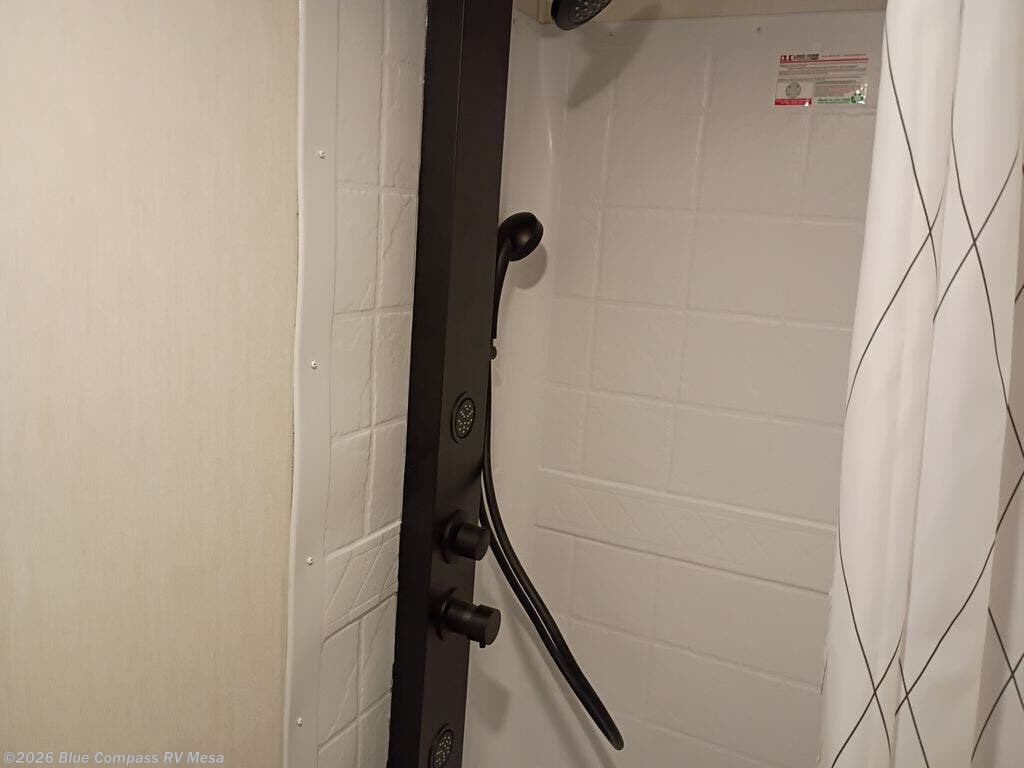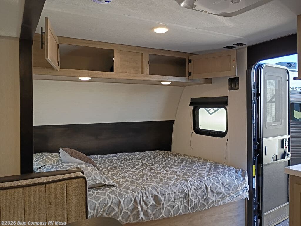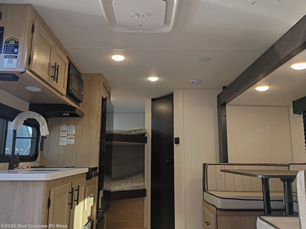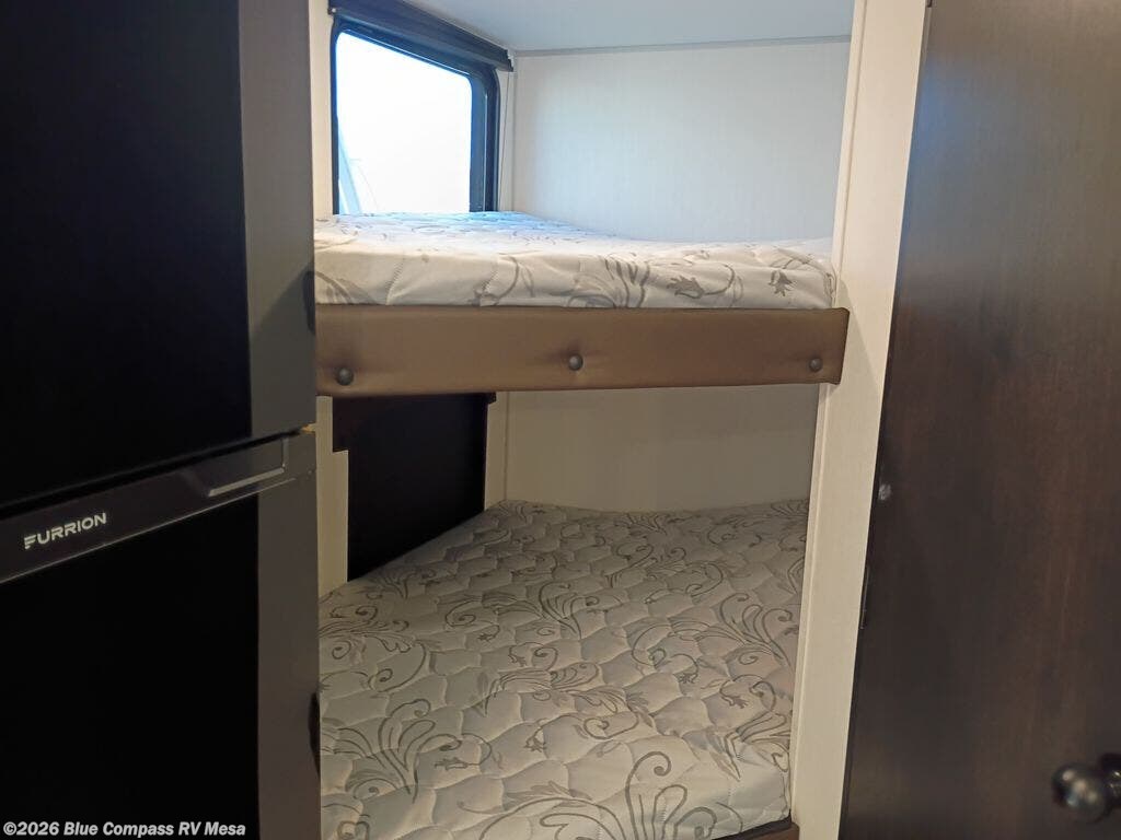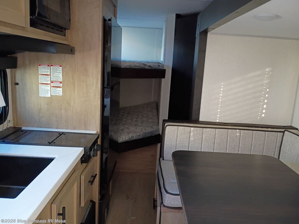 This family travel trailer is ready to head to the campground whenever you are! The kiddos can sleep on the set of double-size bed bunks, and you can sleep on the front queen bed, plus the U-shaped dinette slide can also transform into an extra sleeping space when you aren't using it to enjoy a meal. You can prepare your delicious meals on the range or at the outside mini kitchen and stay protected by the awning. The exterior not only has outside storage and an outside TV mount but also features an outside storage plus door for access to the storage space underneath the bottom bunk bed. The rear corner bath allows everyone to stay clean and refreshed while you camp.