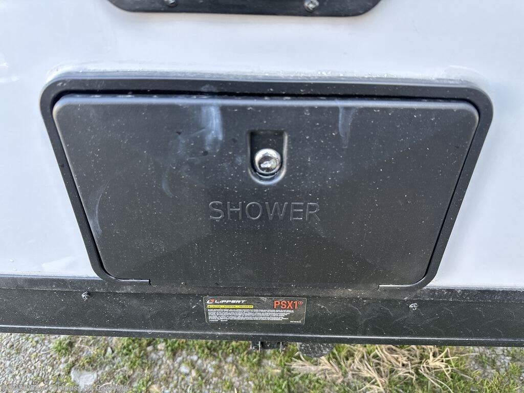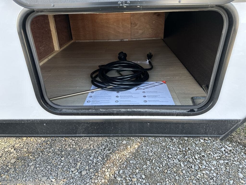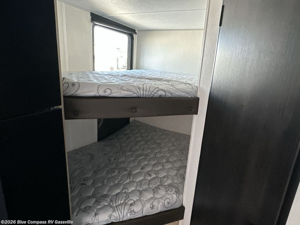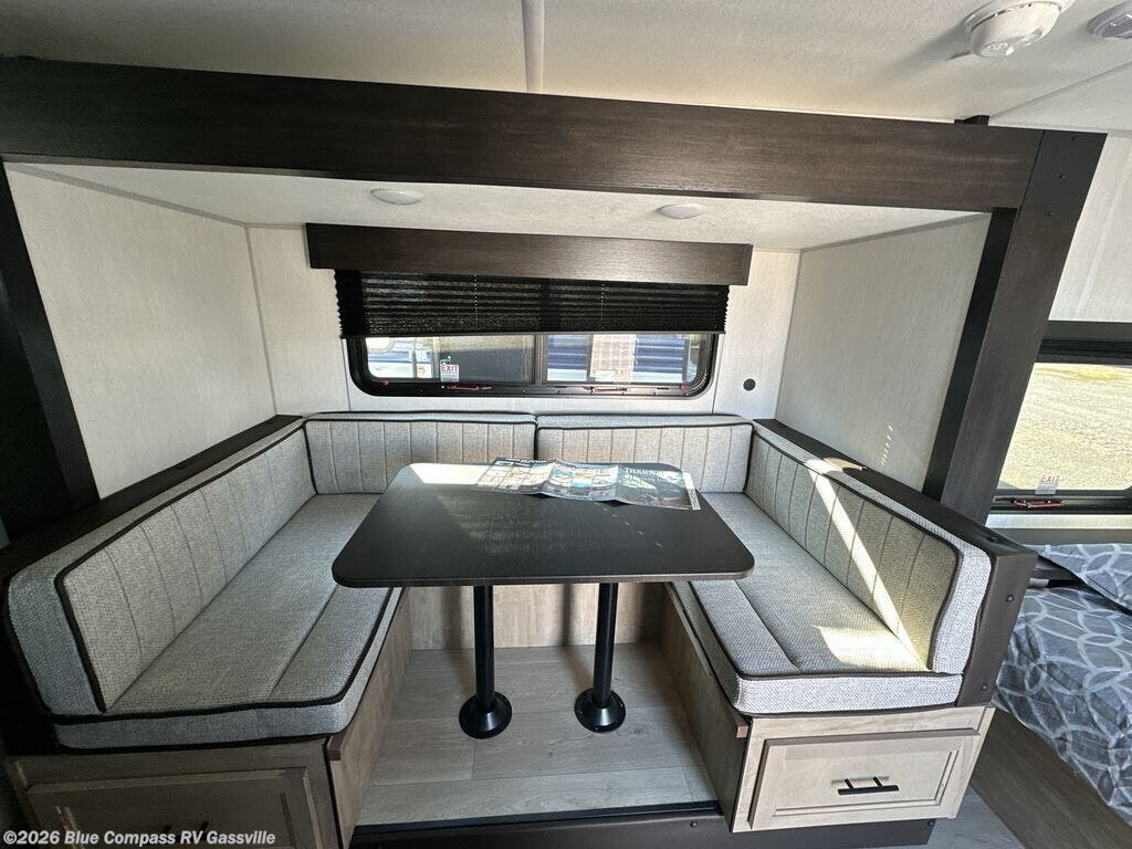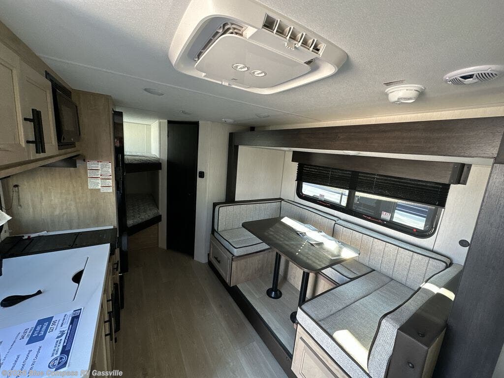 This family travel trailer is ready to head to the campground whenever you are! The kiddos can sleep on the set of double-size bed bunks, and you can sleep on the front queen bed, plus the U-shaped dinette slide can also transform into an extra sleeping space when you aren't using it to enjoy a meal. You can prepare your delicious meals on the range or at the outside mini kitchen and stay protected by the awning. The exterior not only has outside storage and an outside TV mount but also features an outside storage plus door for access to the storage space underneath the bottom bunk bed. The rear corner bath allows everyone to stay clean and refreshed while you camp.