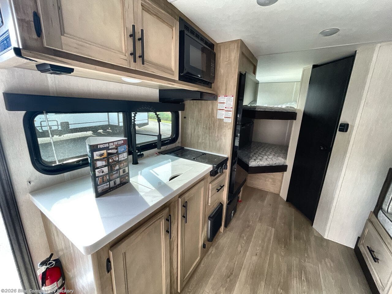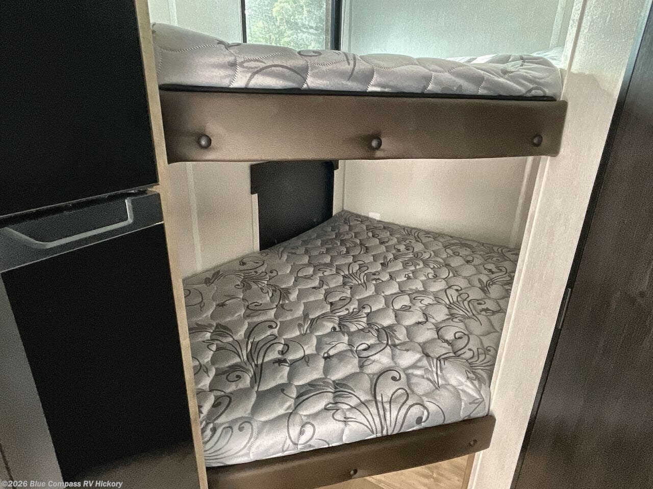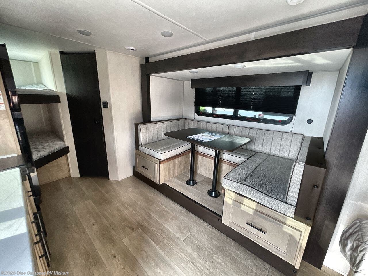 This family travel trailer is ready to head to the campground whenever you are! The kiddos can sleep on the set of double-size bed bunks and you can sleep on the front queen bed, plus the U-shaped dinette slide can also transform into an extra sleeping space when you aren't using it to enjoy a meal. You can prepare your delicious meals on the flushmount range or at the outside mini kitchen and stay protected by the power awning. The exterior not only has outside storage and an outside TV mount, but also features an outside storage plus door for access to the storage space underneath the bottom bunk bed. The rear corner bath allows everyone to stay clean and refreshed while you camp.