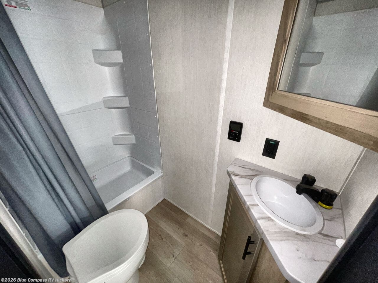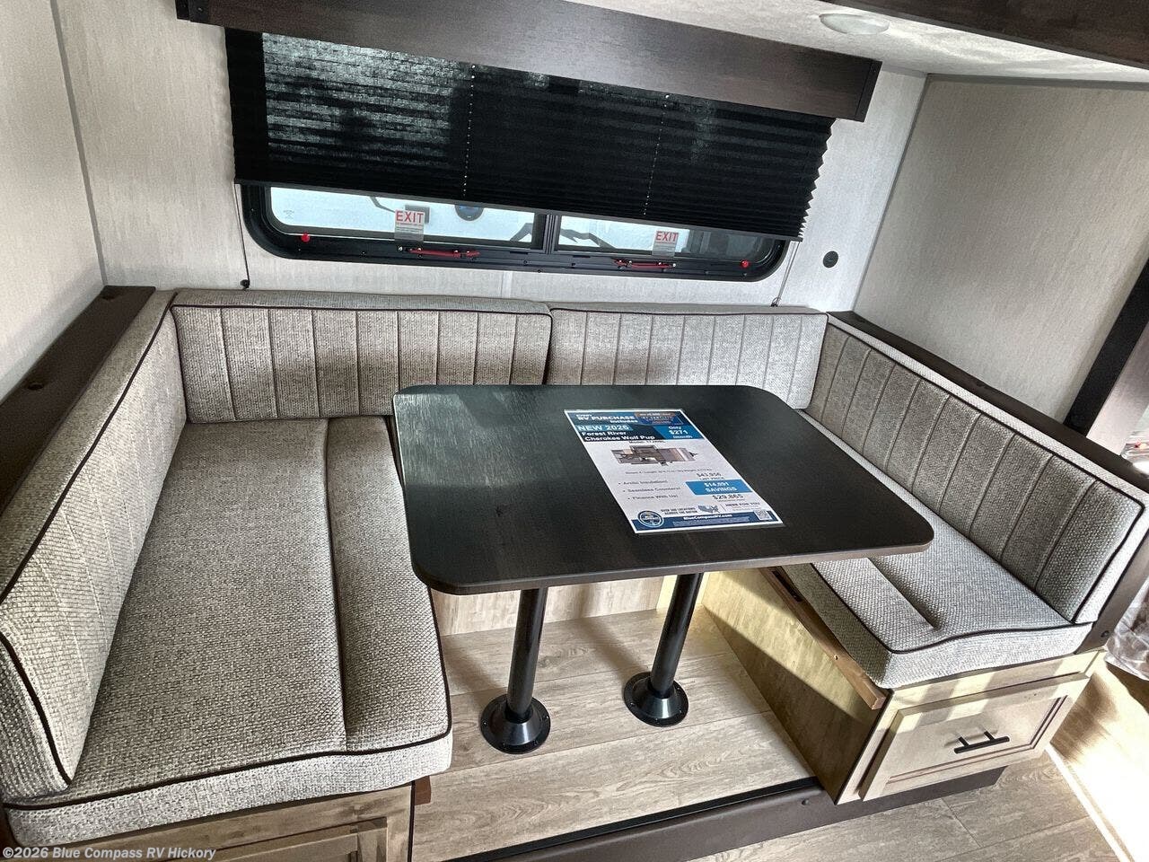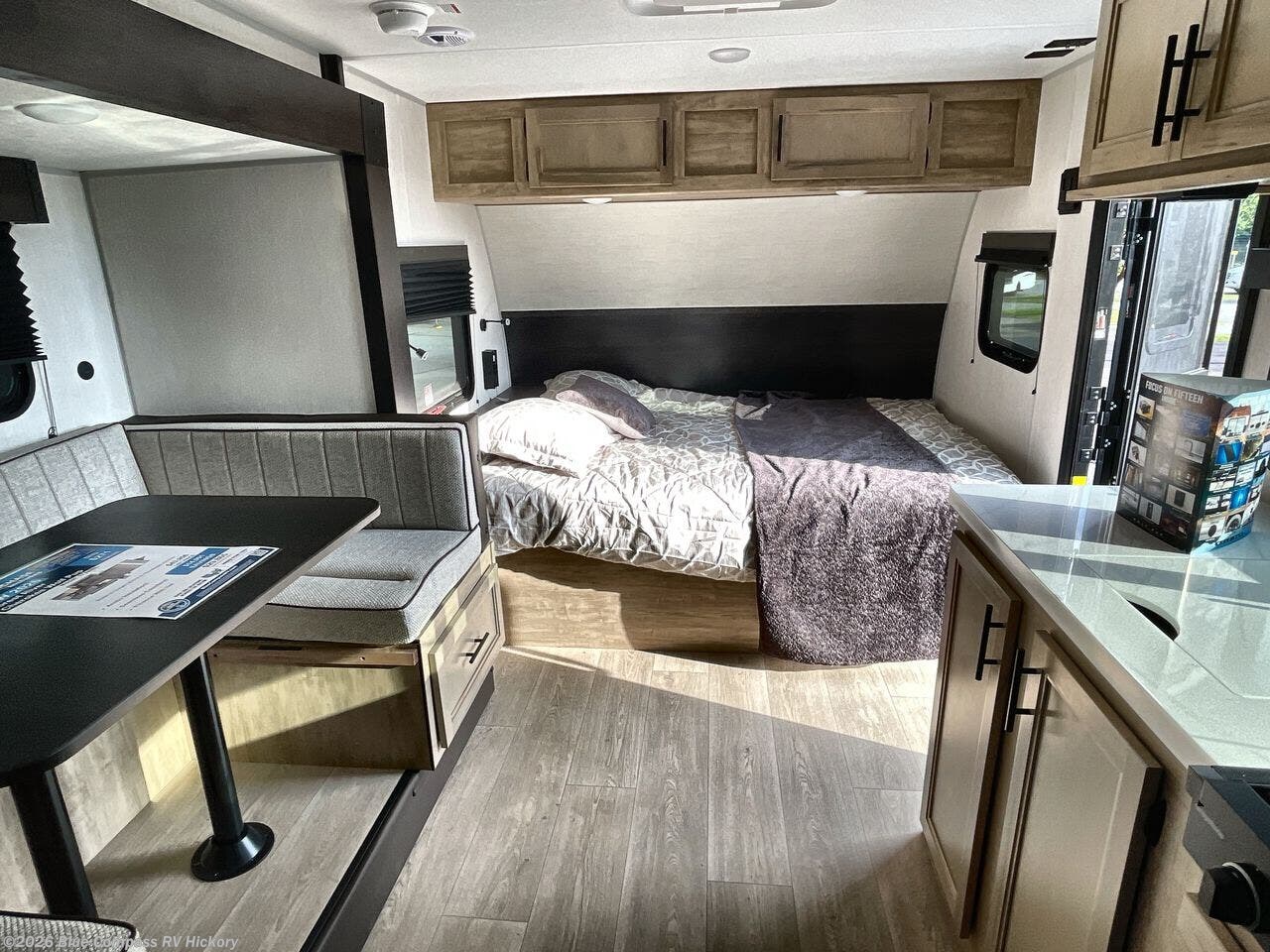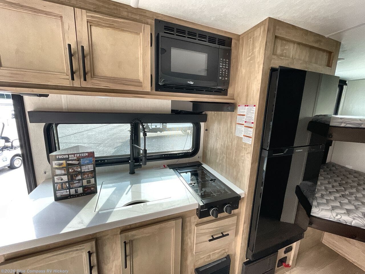 This family travel trailer is ready to head to the campground whenever you are! The kiddos can sleep on the set of double-size bed bunks and you can sleep on the front queen bed, plus the U-shaped dinette slide can also transform into an extra sleeping space when you aren't using it to enjoy a meal. You can prepare your delicious meals on the flushmount range or at the outside mini kitchen and stay protected by the power awning. The exterior not only has outside storage and an outside TV mount, but also features an outside storage plus door for access to the storage space underneath the bottom bunk bed. The rear corner bath allows everyone to stay clean and refreshed while you camp.