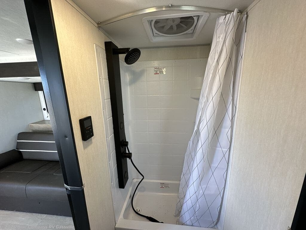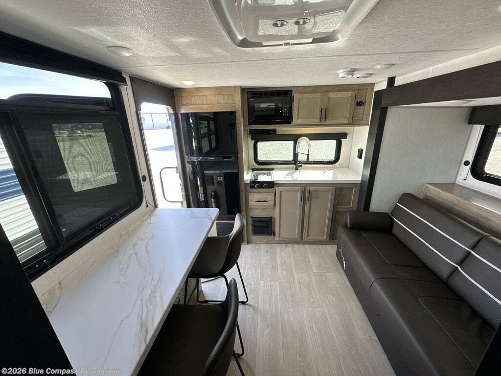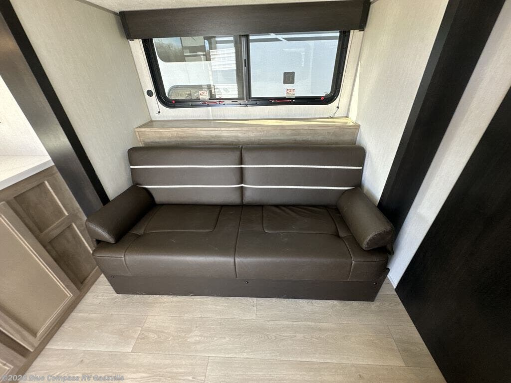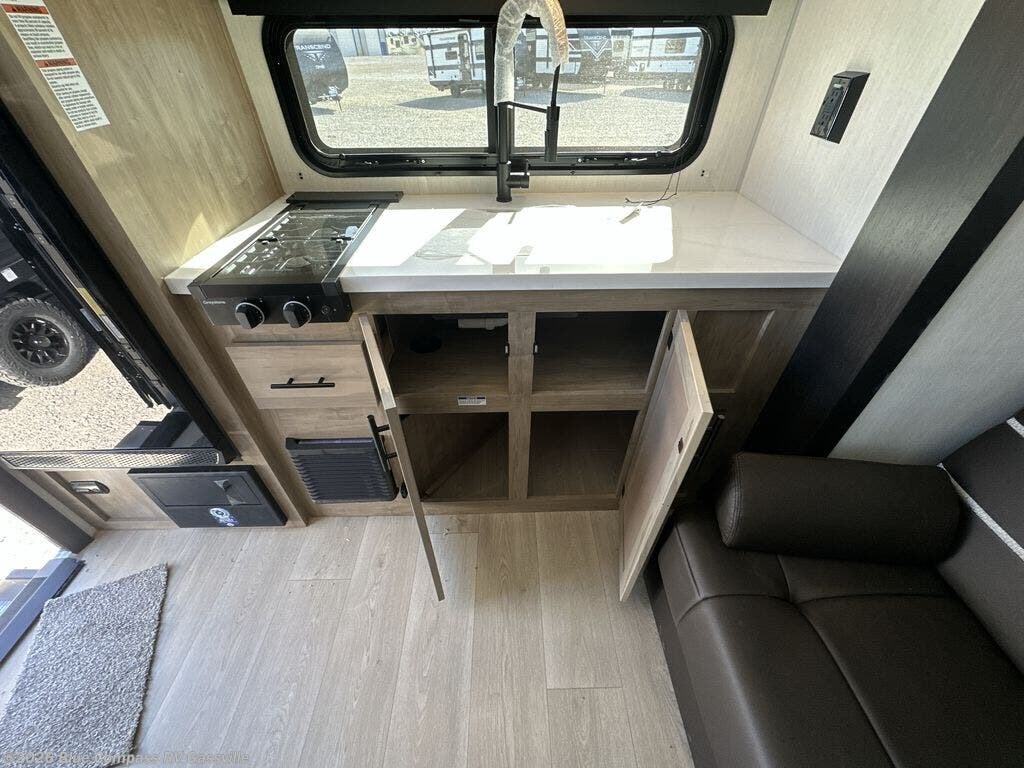 Convenient camping is found with this lightweight travel trailer! Once you arrive at your destination, put out the power awning, then make lunch on the exterior mini kitchen. Inside, you can dine at the bar top with stools, freshen up in the tub/shower, and sleep soundly on the queen bed in the master bedroom. There is also a sofa slide out to provide additional seating, sleeping, and interior space! And you're sure to find plenty of storage spaces both inside and outside, including a rear storage rack!