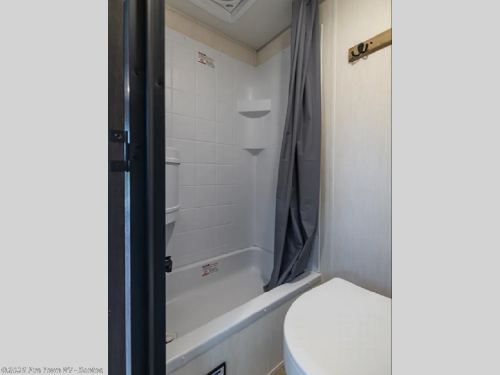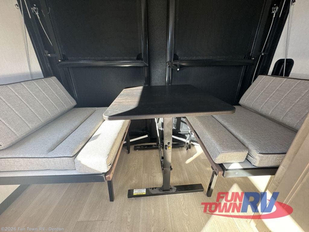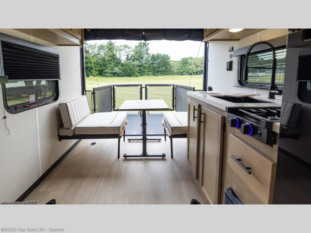 Load up your favorite off-road toys with the ramp door into the 9' 4" garage with 13' 11" total cargo space when you utilize the space up front! Enjoy all of the at home features like a fully equipped kitchen with a cooktop, refrigerator, and a microwave. Comfortably eat your delicious meals at the rear dinette with a removable table for convenience. The private bathroom has a tub/shower for you to freshen up in the morning after getting a good night's rest on the front queen bed which also has a bunk bed above it too. There is also outside storage for your hiking or riding gear!