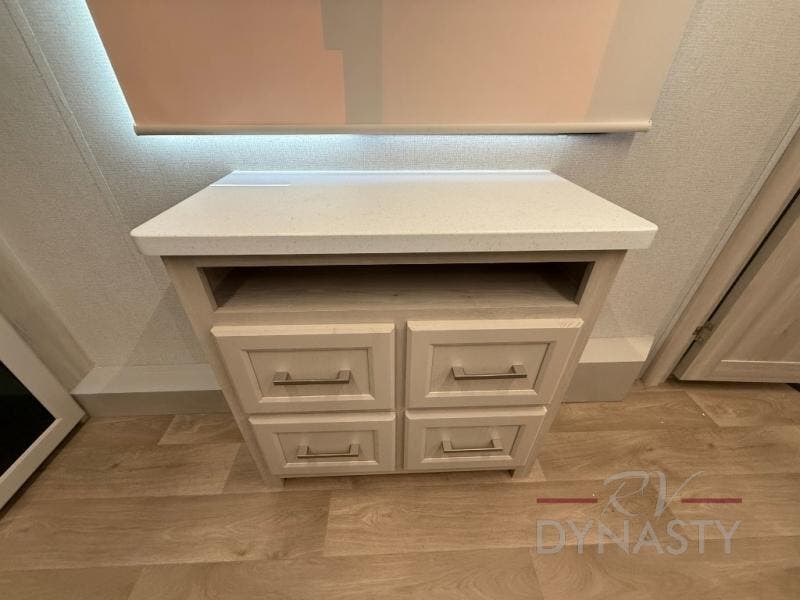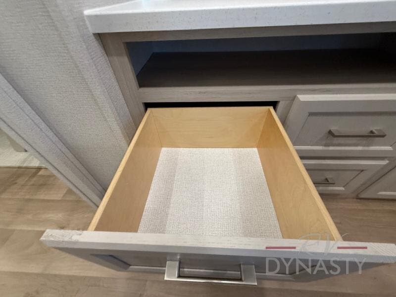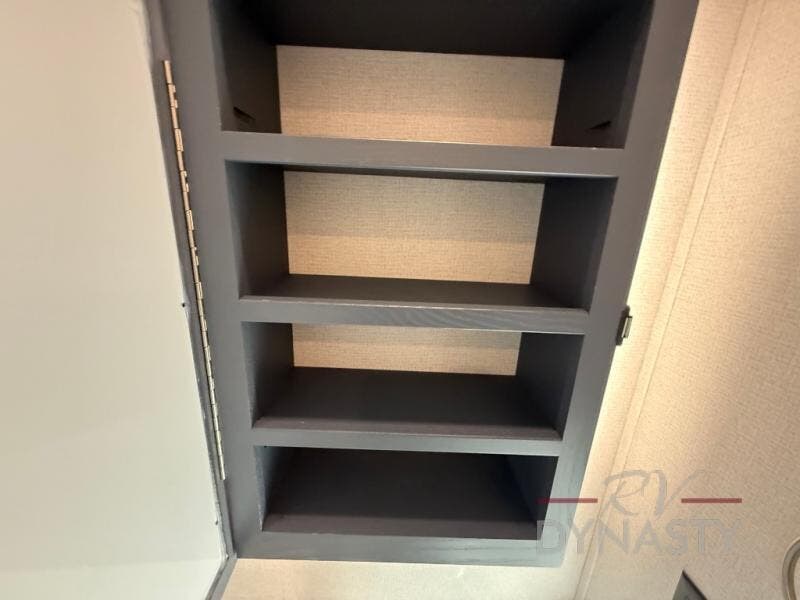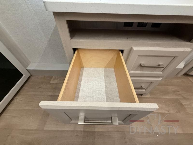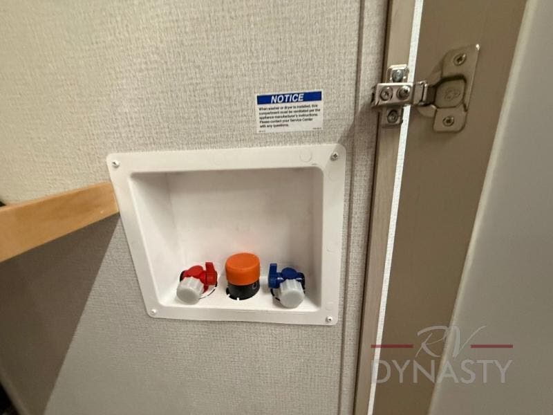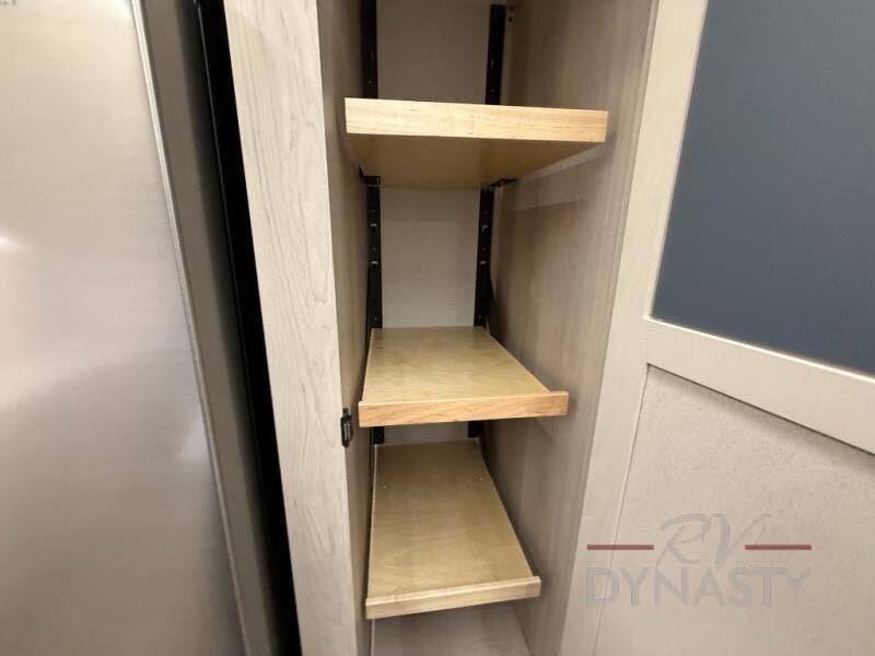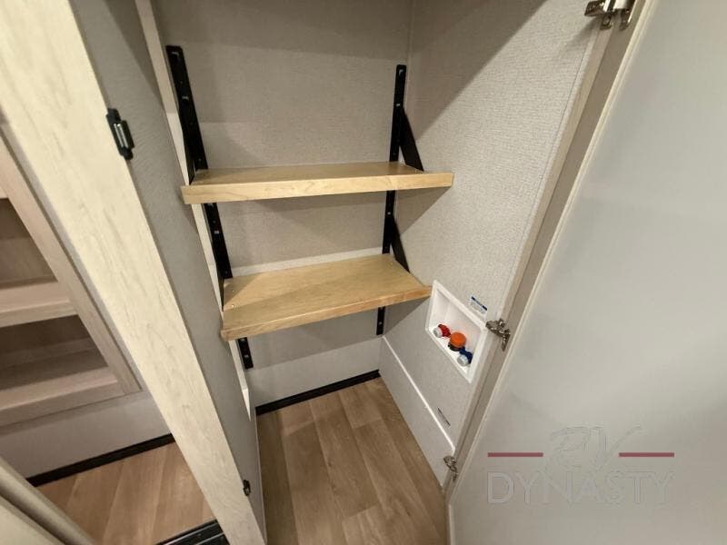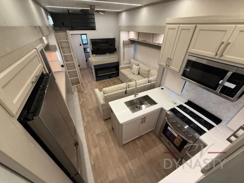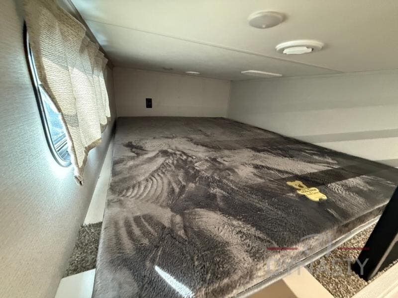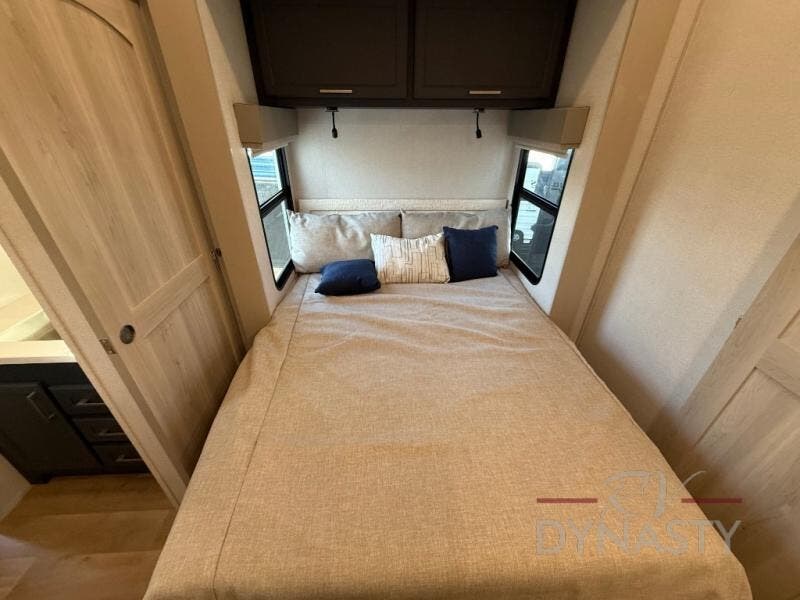 Camping with friends and family just got a whole lot easier in this spacious fifth wheel! Up front, you'll find a private bedroom with a queen bed slide out, a dresser, a wardrobe with a shelf, plus washer and dryer prep if you plan to go full-time. The master bedroom towards the back includes a queen bed slide out, a wardrobe and a dresser, plus a full rear bath with a unique rear entry door. There is also a 60" x 72" queen loft bed above this rear room for added sleeping or storage space! Everyone can meet in the middle kitchen and living room that includes a pull-out table with chairs, an L-shaped sofa, and an entertainment center with a fireplace.