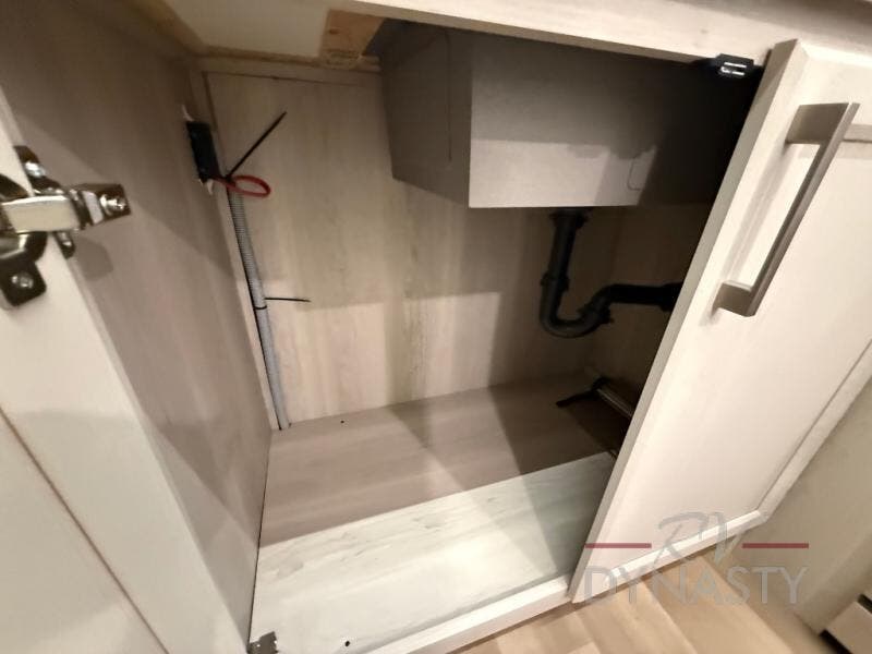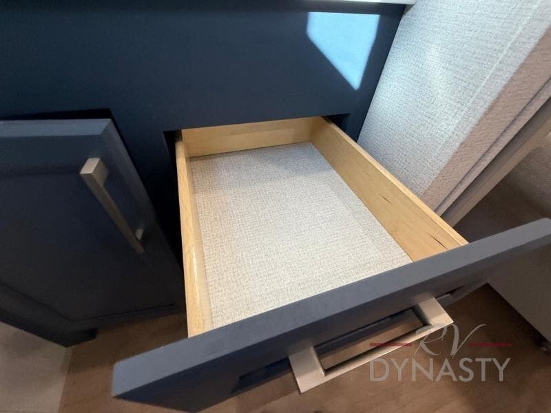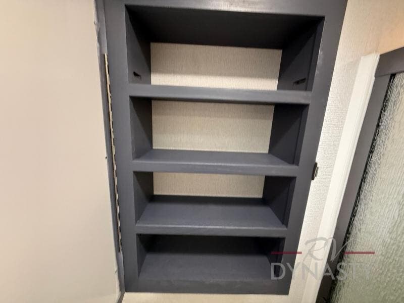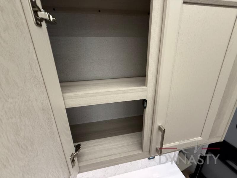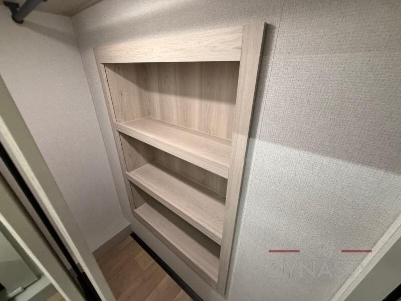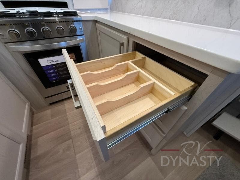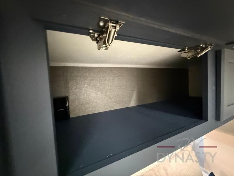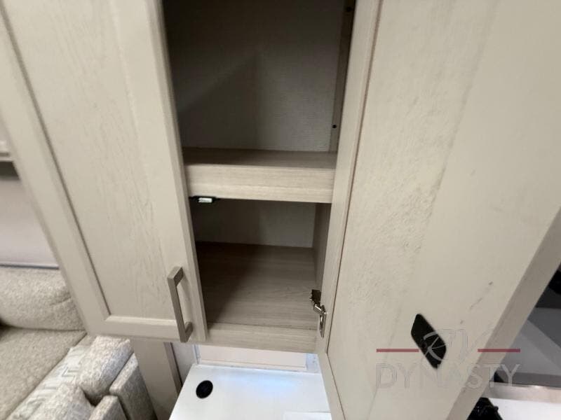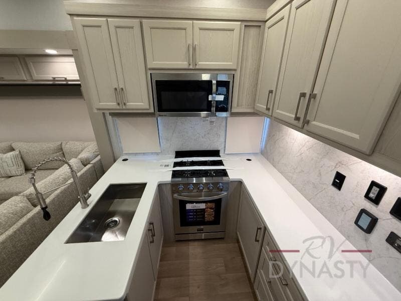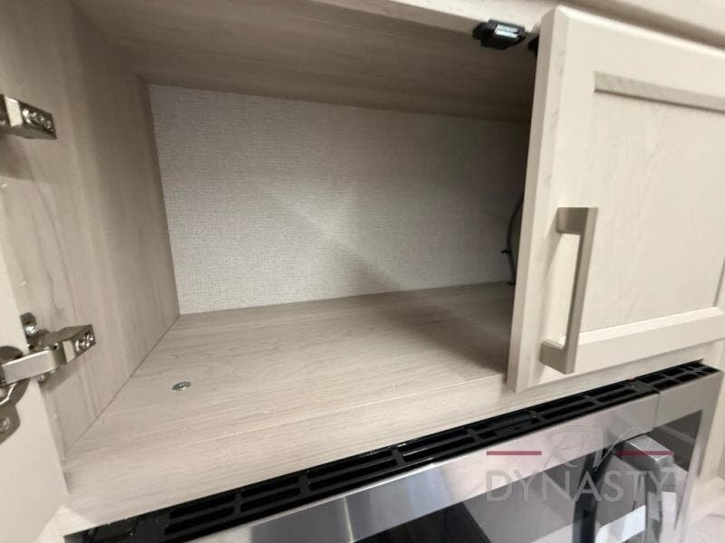 Camping with friends and family just got a whole lot easier in this spacious fifth wheel! Up front, you'll find a private bedroom with a queen bed slide out, a dresser, a wardrobe with a shelf, plus washer and dryer prep if you plan to go full-time. The master bedroom towards the back includes a queen bed slide out, a wardrobe and a dresser, plus a full rear bath with a unique rear entry door. There is also a 60" x 72" queen loft bed above this rear room for added sleeping or storage space! Everyone can meet in the middle kitchen and living room that includes a pull-out table with chairs, an L-shaped sofa, and an entertainment center with a fireplace.