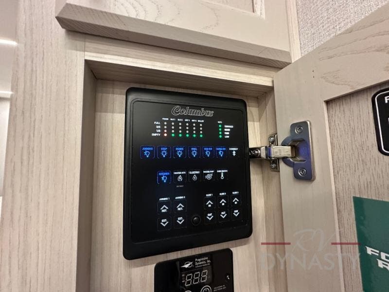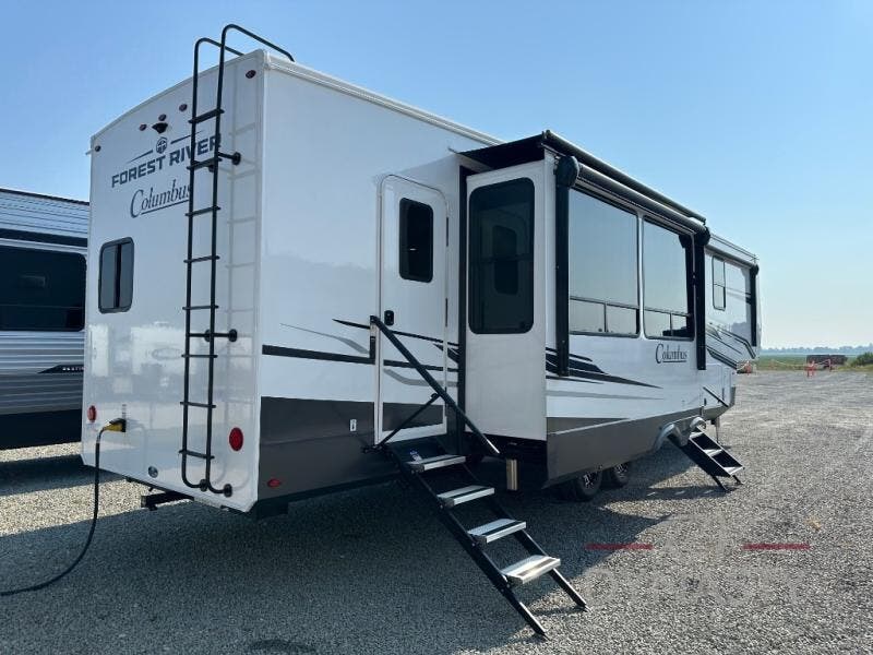 Experience a different camping life with residential furnishings and high-end features in each one of these Forest River Columbus fifth wheels! Durable construction begins with a 101" wide body, an all-welded aluminum frame superstructure, and high-gloss fiberglass vacuum bonded walls and slide out ends with dual Azdel. You will appreciate the Lippert axles, MORryde CRE 3000 suspension system, and 16" wheels with nitrogen-filled tires for a smooth tow from home to campground. Additional exterior features include a tire pressure monitoring system, a heated utility convenience center, an outside sprayer, and slam latch on all the storage doors. Inside, you'll be met with many luxurious amenities, including residential style crown molding throughout, roller day/night shades, upgraded true solid surface countertops in the bath and kitchen, plus solid wood steps.