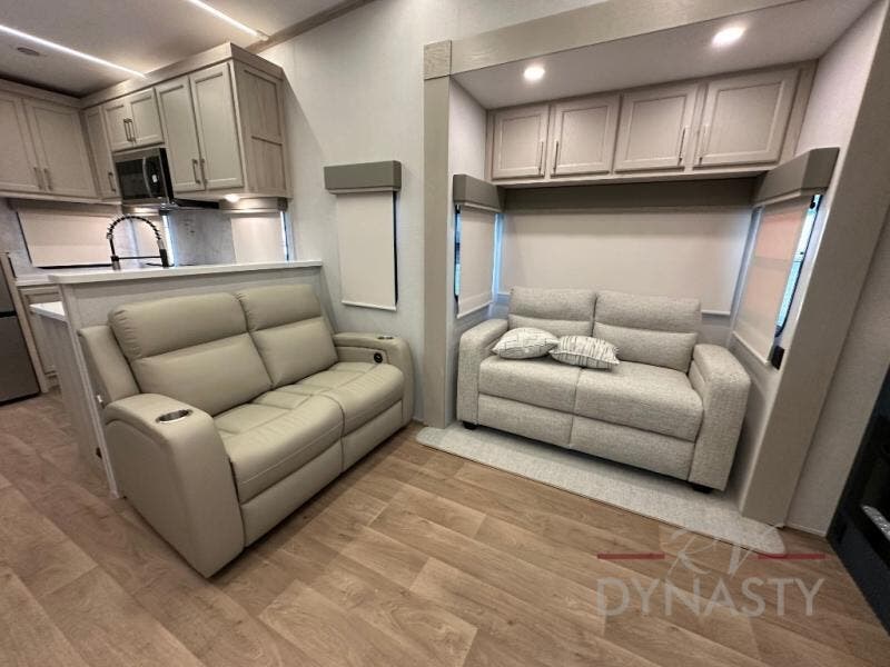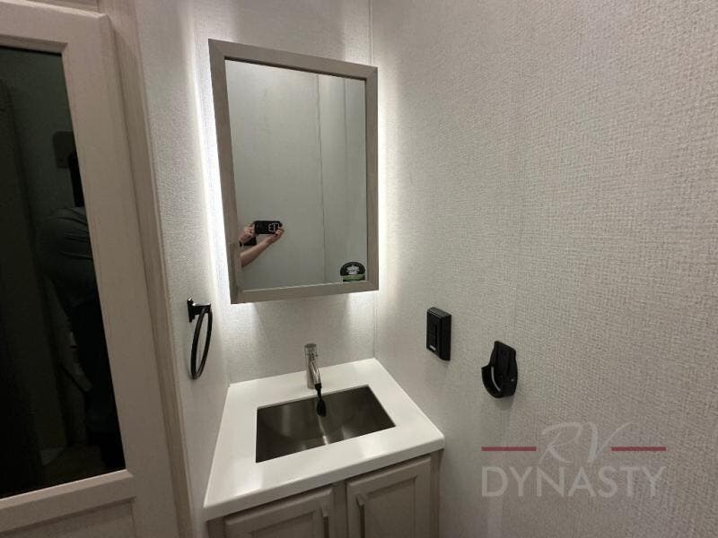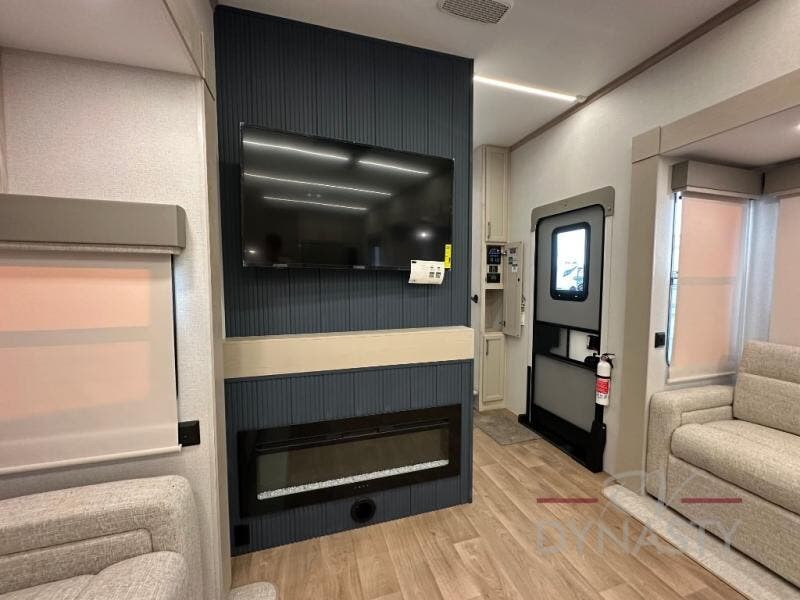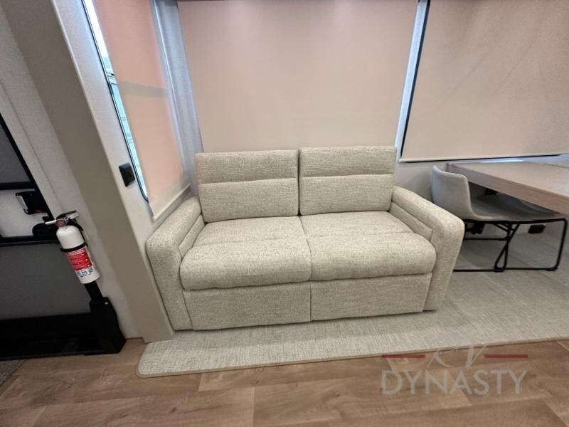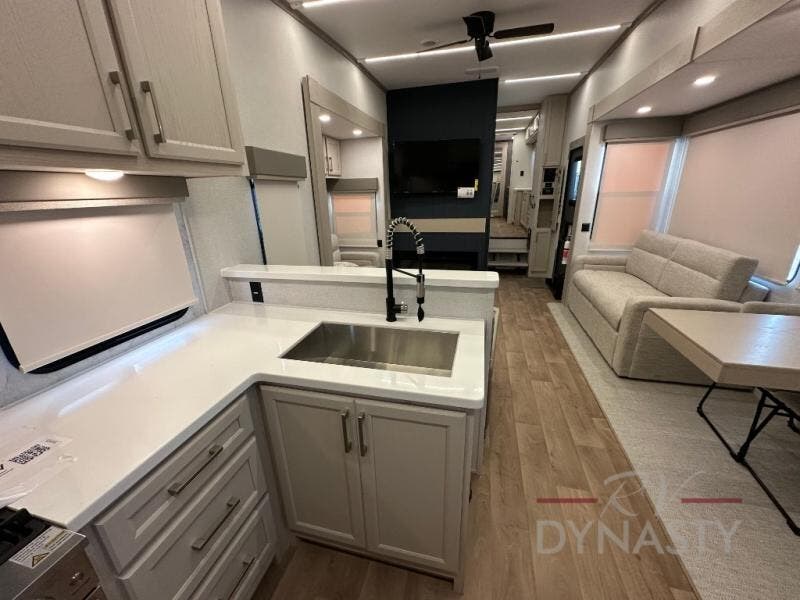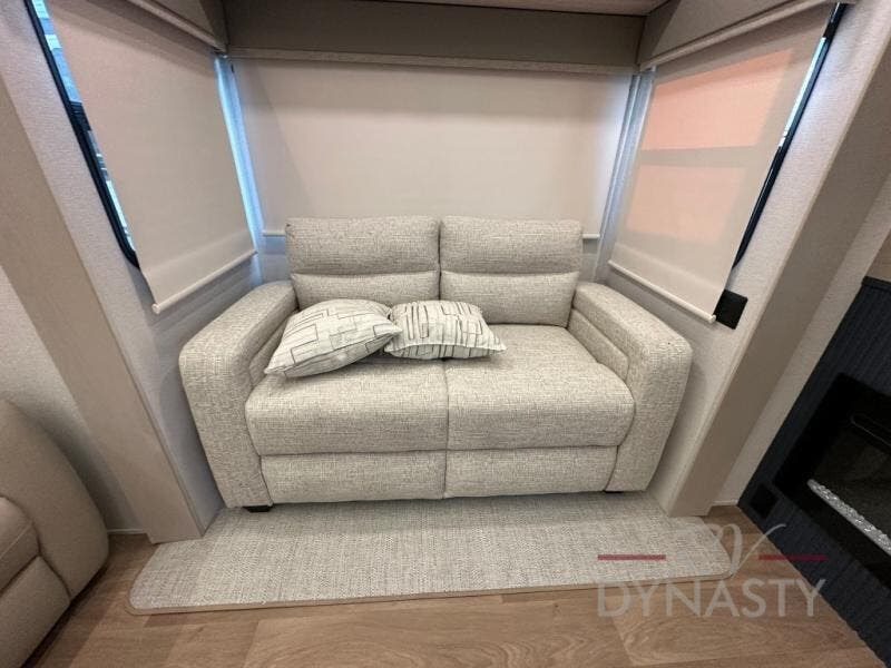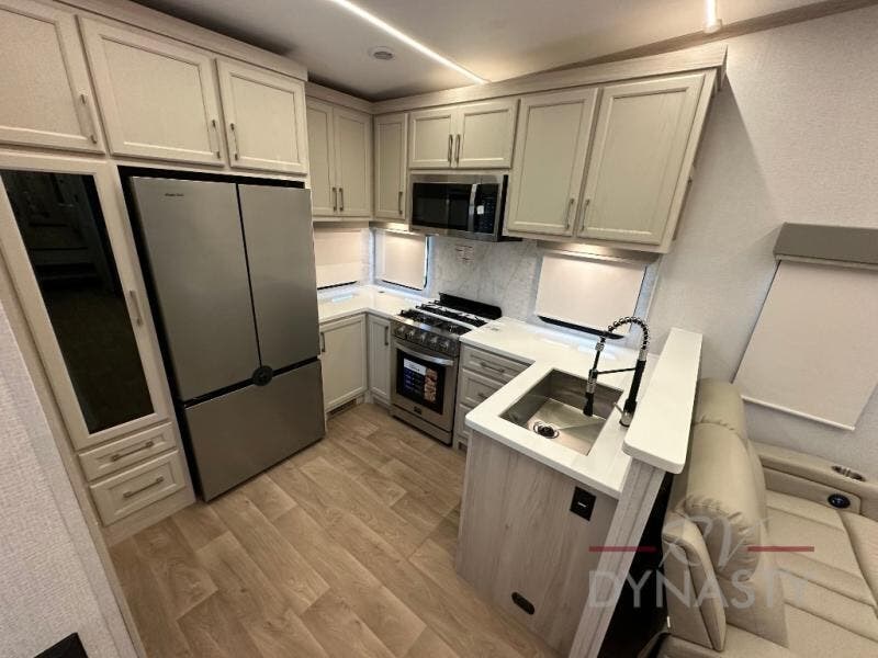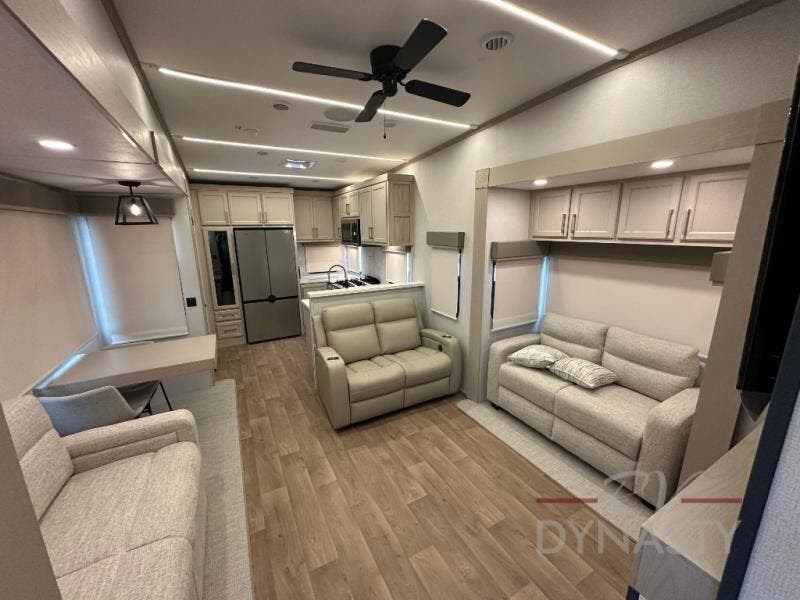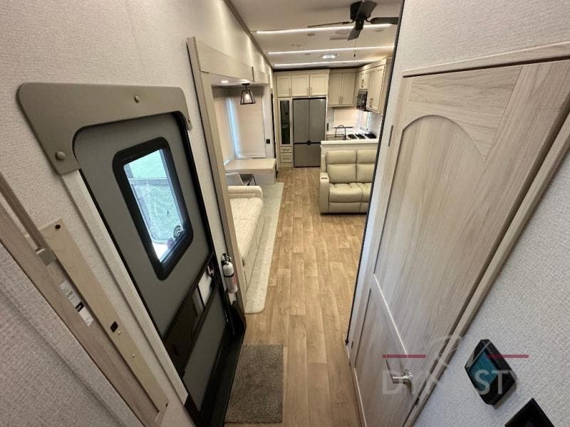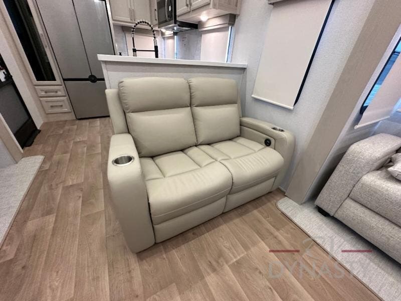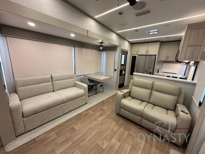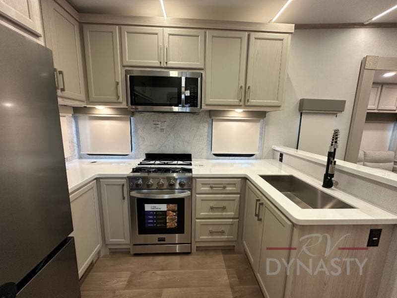 You won't believe all that this fifth wheel has to offer! Starting with the rear kitchen which has plenty of countertop space to prepare your delicious meals, a gas cooktop with a stainless steel 24" oven to cook them, and a large single bowl stainless steel sink for easy clean up. The living area has opposing sofas and a theater seat with USB charging and storage across from an entertainment center with 50" Smart TV. The half bathroom is close to the living area so you can get back to watching your movie faster. You will feel right at home sleeping in the master suite on a slide out king bed across from a dresser and hamper to keep your space tidy, plus entrance into the front full bathroom. Inside the bathroom, you will find a vanity with dual sinks for two to get ready at once, a spacious shower with a seat, and a walk-in closet for clothes, shoes, and more!