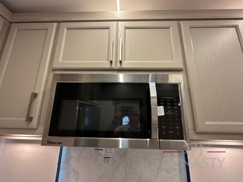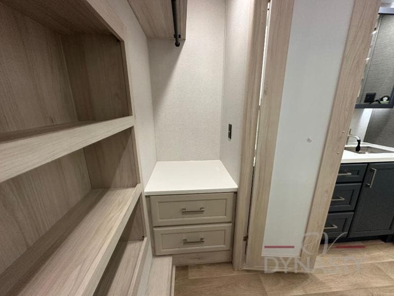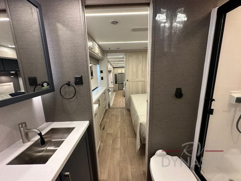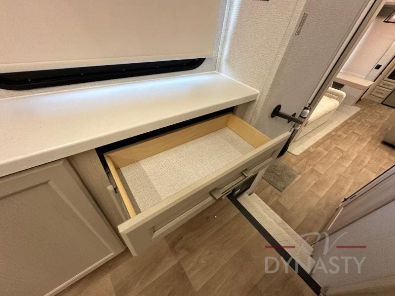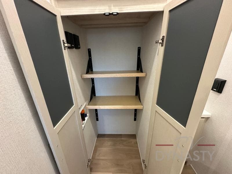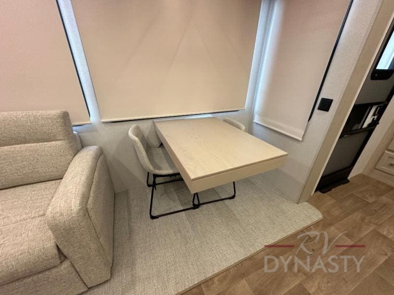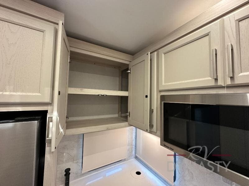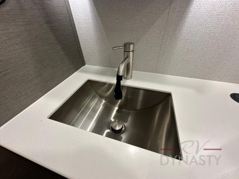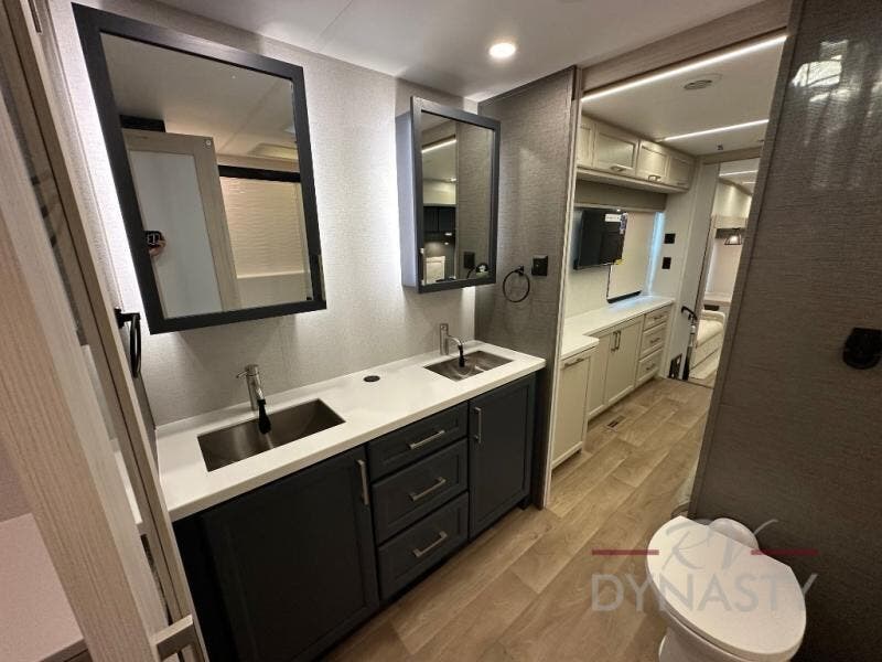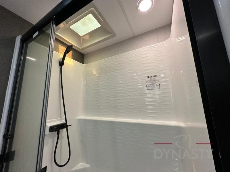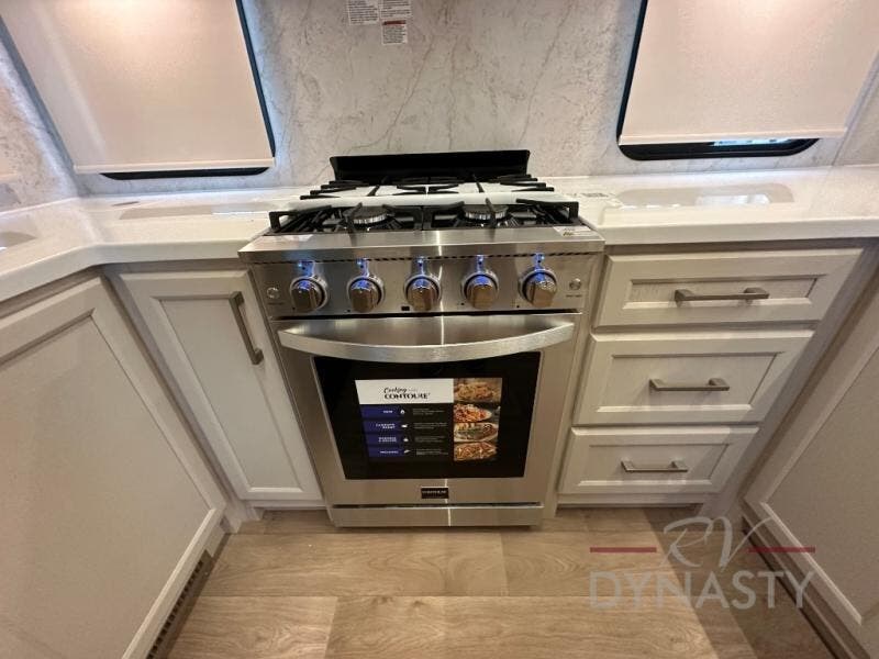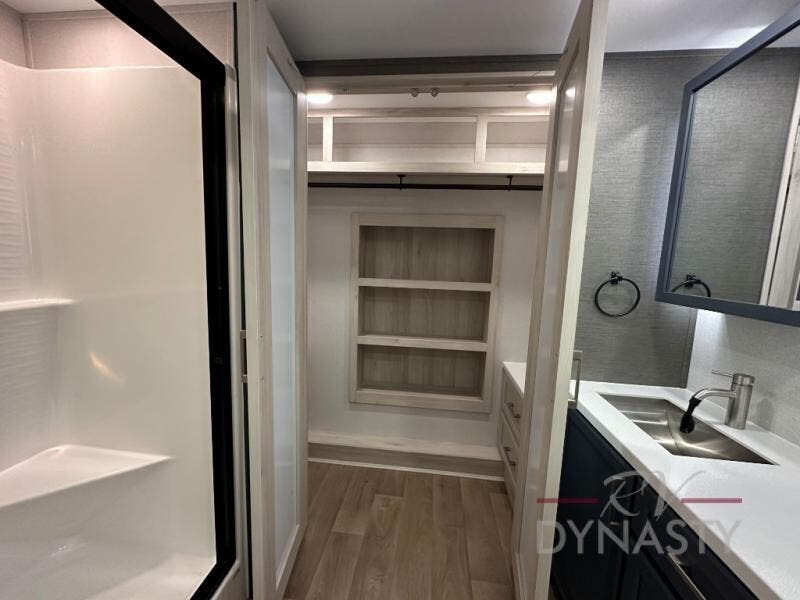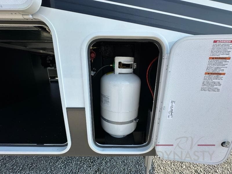 You won't believe all that this fifth wheel has to offer! Starting with the rear kitchen which has plenty of countertop space to prepare your delicious meals, a gas cooktop with a stainless steel 24" oven to cook them, and a large single bowl stainless steel sink for easy clean up. The living area has opposing sofas and a theater seat with USB charging and storage across from an entertainment center with 50" Smart TV. The half bathroom is close to the living area so you can get back to watching your movie faster. You will feel right at home sleeping in the master suite on a slide out king bed across from a dresser and hamper to keep your space tidy, plus entrance into the front full bathroom. Inside the bathroom, you will find a vanity with dual sinks for two to get ready at once, a spacious shower with a seat, and a walk-in closet for clothes, shoes, and more!