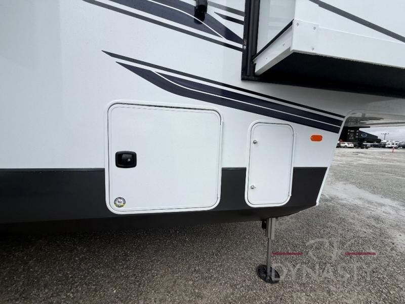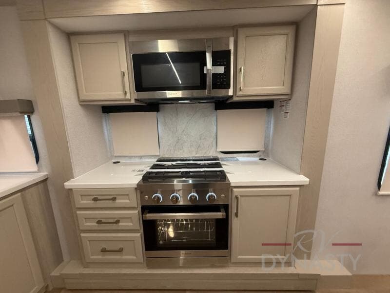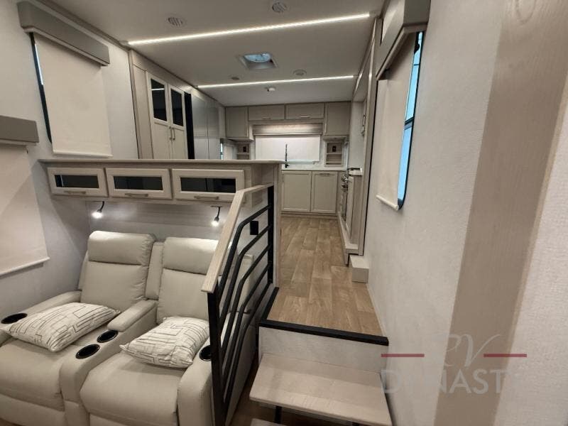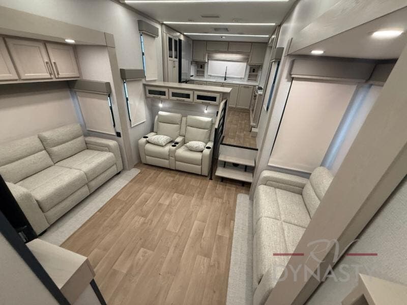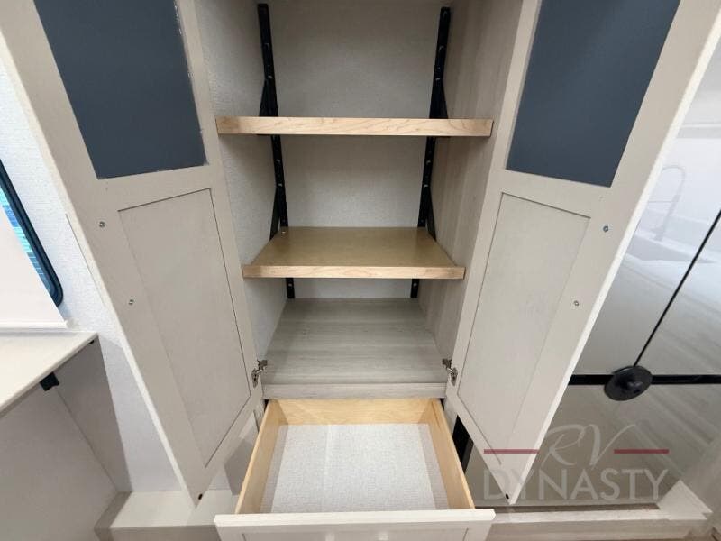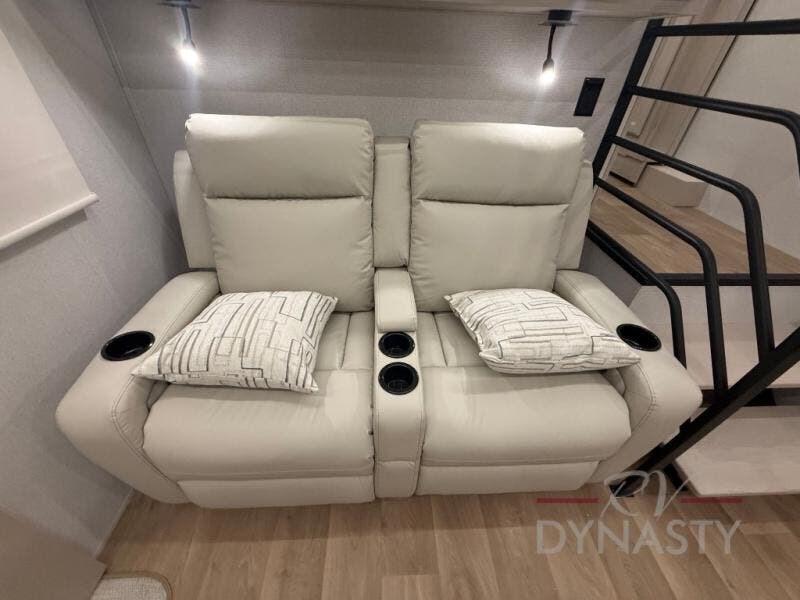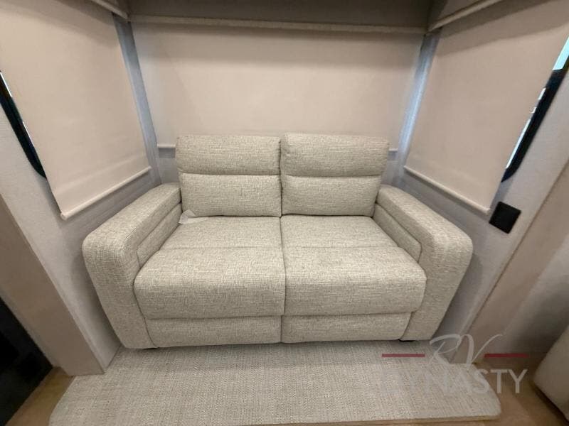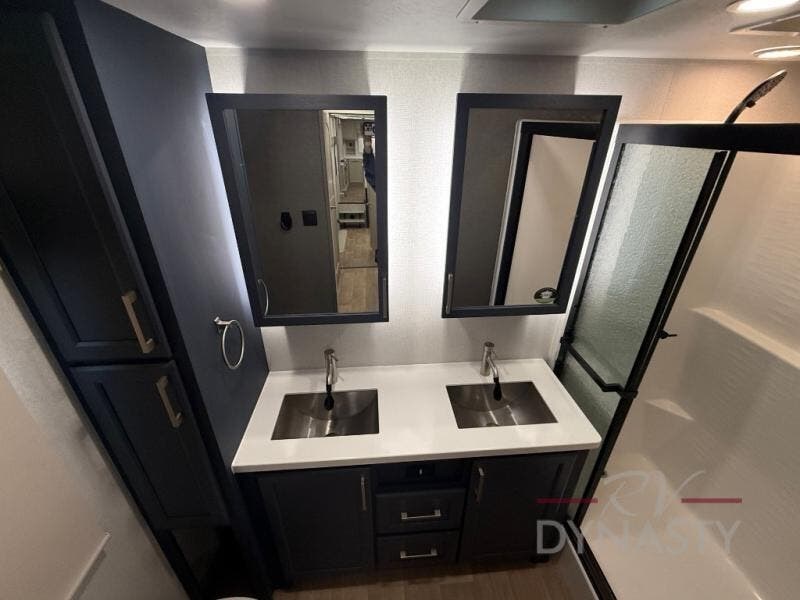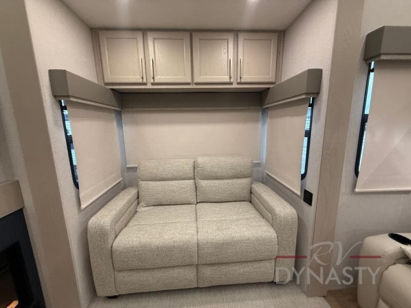 The front kitchen in this fifth wheel is a chef's dream come true while camping! There is generous counter space up front and beside the range, plus a pantry and 12V refrigerator with an ice maker. There is also a hi-top table with two bar stools that overlooks the living area. Inside the living area there are opposing sofa sleeper slides and power theater seating across from an entertainment center with a 50" Smart TV. A mid-coach half bath is easily accessible, and the full rear bath with dual bath sinks will create a master bedroom you are sure to love. There is a king bed slide out, a wardrobe, hamper, and a TV/storage.