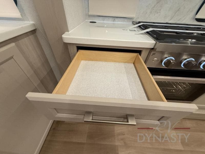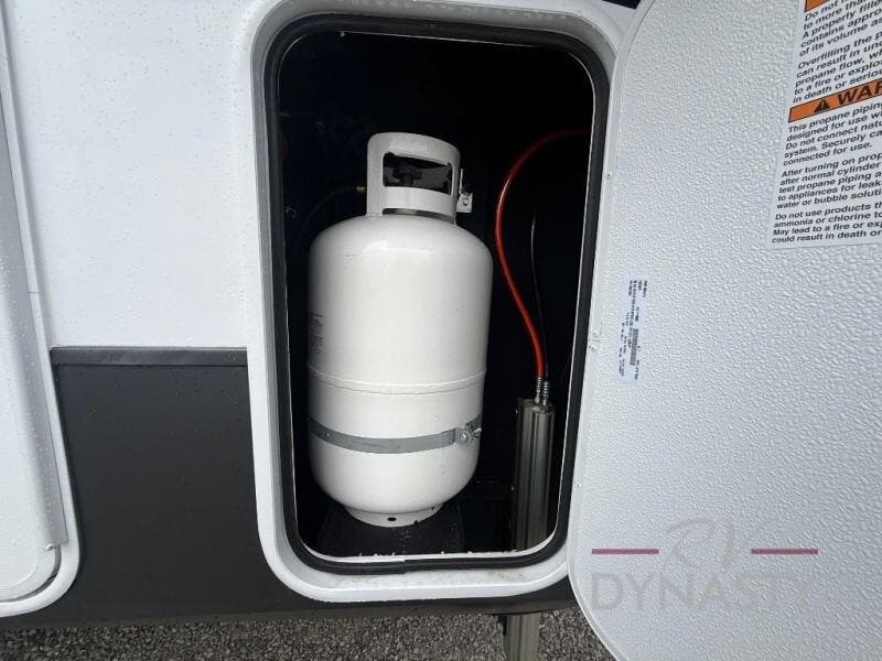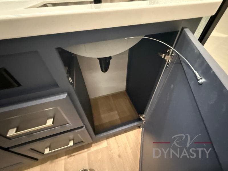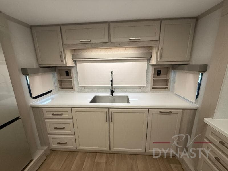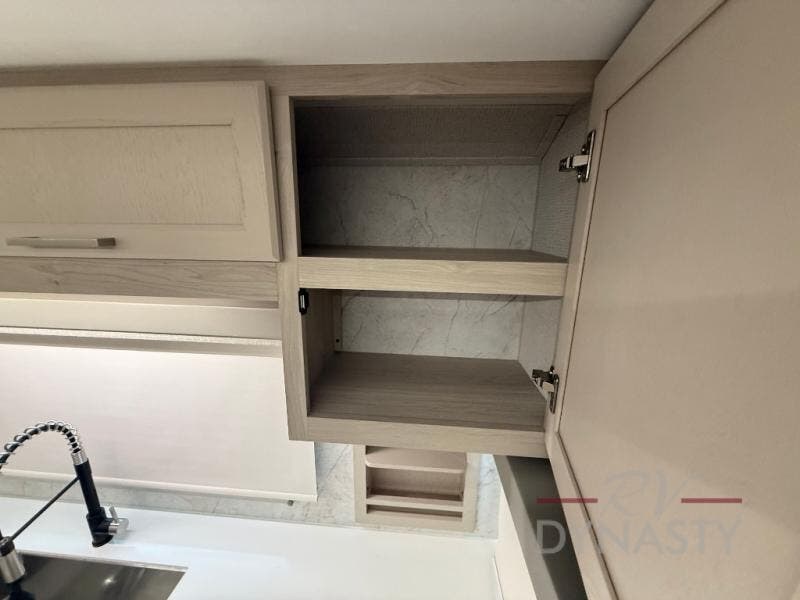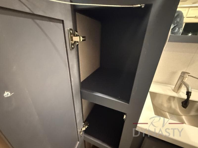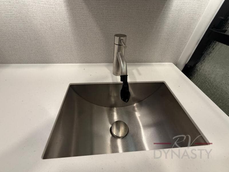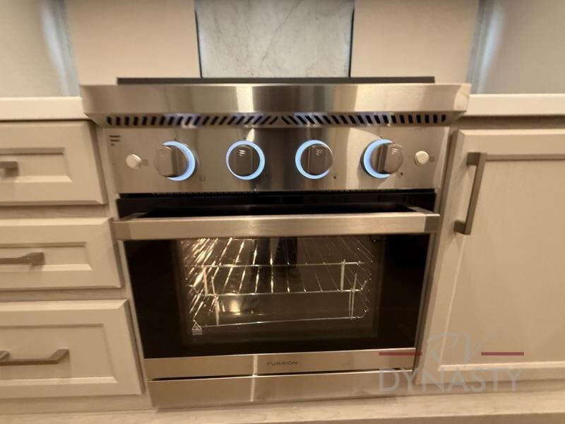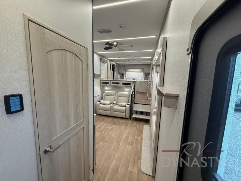 The front kitchen in this fifth wheel is a chef's dream come true while camping! There is generous counter space up front and beside the range, plus a pantry and 12V refrigerator with an ice maker. There is also a hi-top table with two bar stools that overlooks the living area. Inside the living area there are opposing sofa sleeper slides and power theater seating across from an entertainment center with a 50" Smart TV. A mid-coach half bath is easily accessible, and the full rear bath with dual bath sinks will create a master bedroom you are sure to love. There is a king bed slide out, a wardrobe, hamper, and a TV/storage.