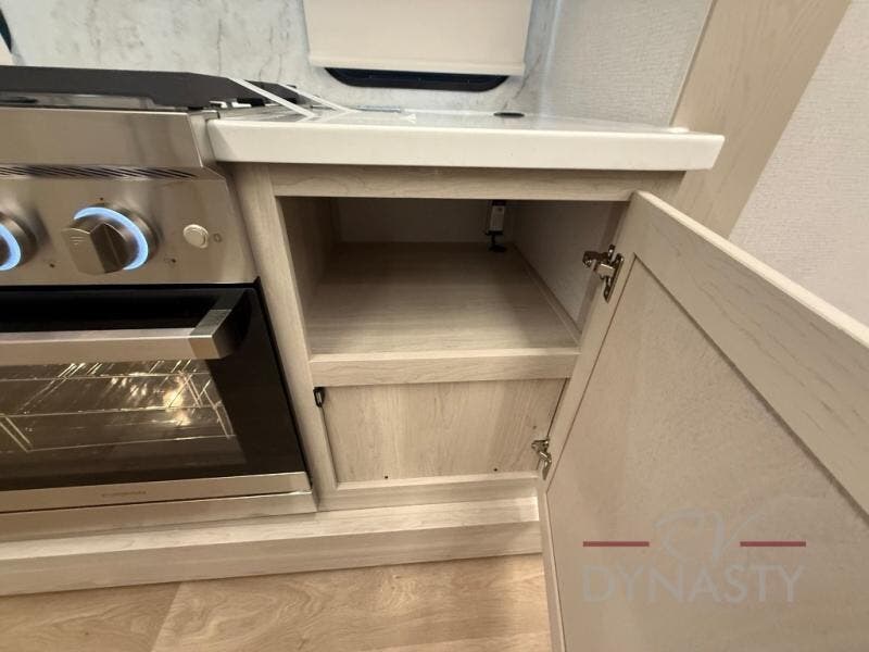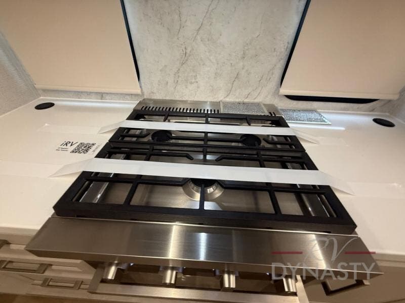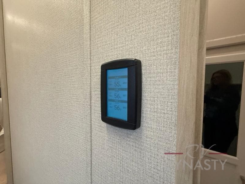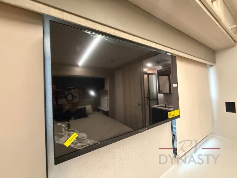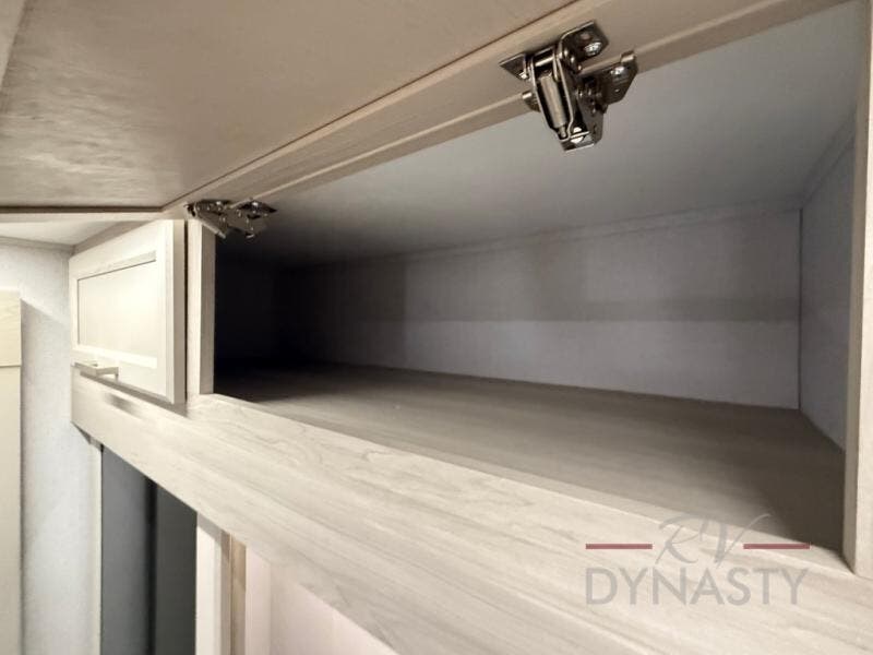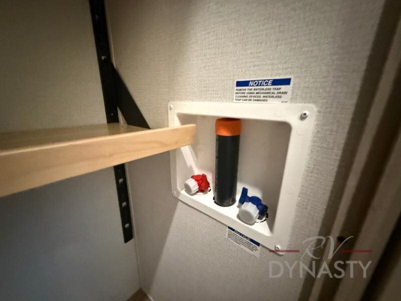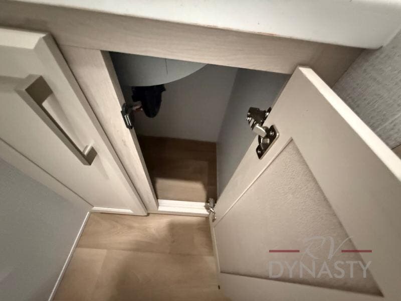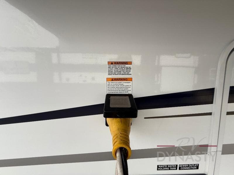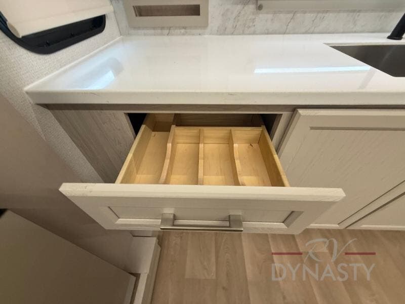The front kitchen in this fifth wheel is a chef's dream come true while camping! There is generous counter space up front and beside the range, plus a pantry and 12V refrigerator with an ice maker. There is also a hi-top table with two bar stools that overlooks the living area. Inside the living area there are opposing sofa sleeper slides and power theater seating across from an entertainment center with a 50" Smart TV. A mid-coach half bath is easily accessible, and the full rear bath with dual bath sinks will create a master bedroom you are sure to love. There is a king bed slide out, a wardrobe, hamper, and a TV/storage.