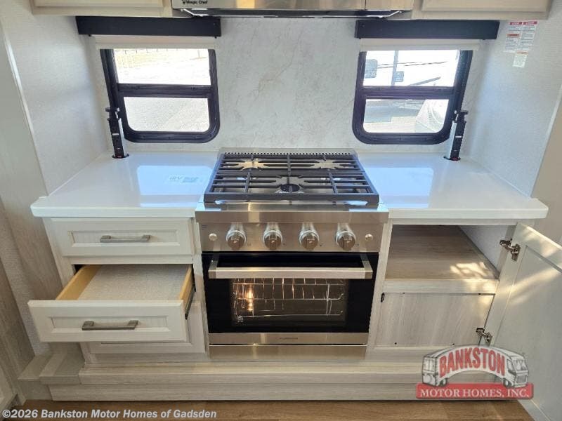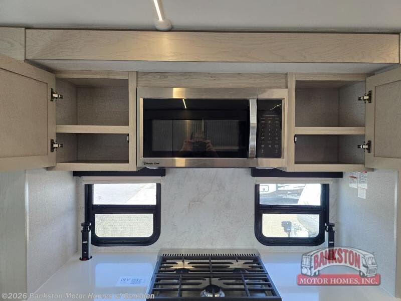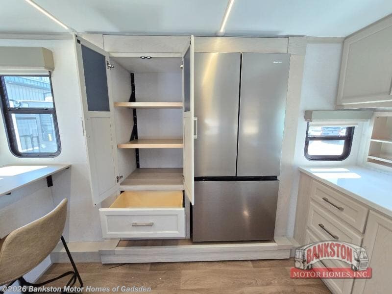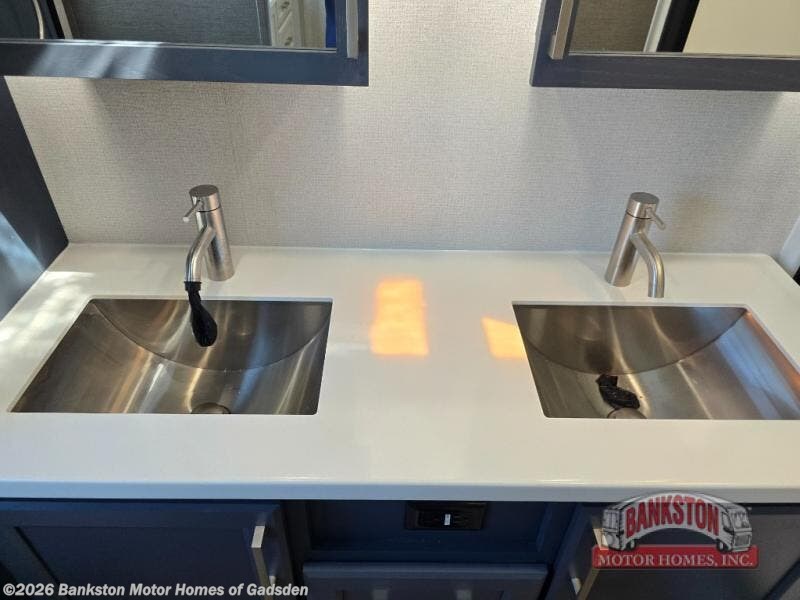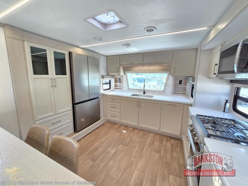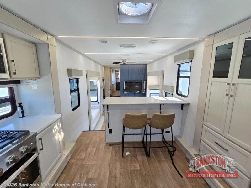 The front kitchen in this fifth wheel is a chef's dream come true while camping! There is generous counter space up front and beside the range, plus a pantry and 12V refrigerator with an ice maker. There is also a hi-top table with two bar stools that overlooks the living area. Inside the living area there are opposing sofa sleeper slides and power theater seating across from an entertainment center with a 50" Smart TV. A mid-coach half bath is easily accessible, and the full rear bath with dual bath sinks will create a master bedroom you are sure to love. There is a king bed slide out, a wardrobe, hamper, and a TV/storage.