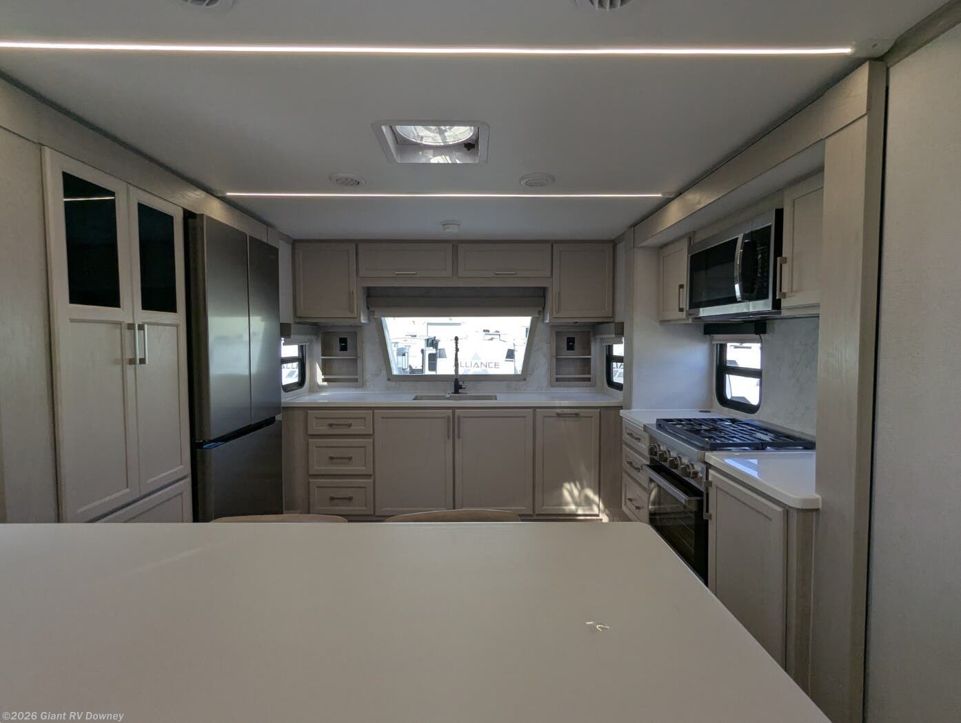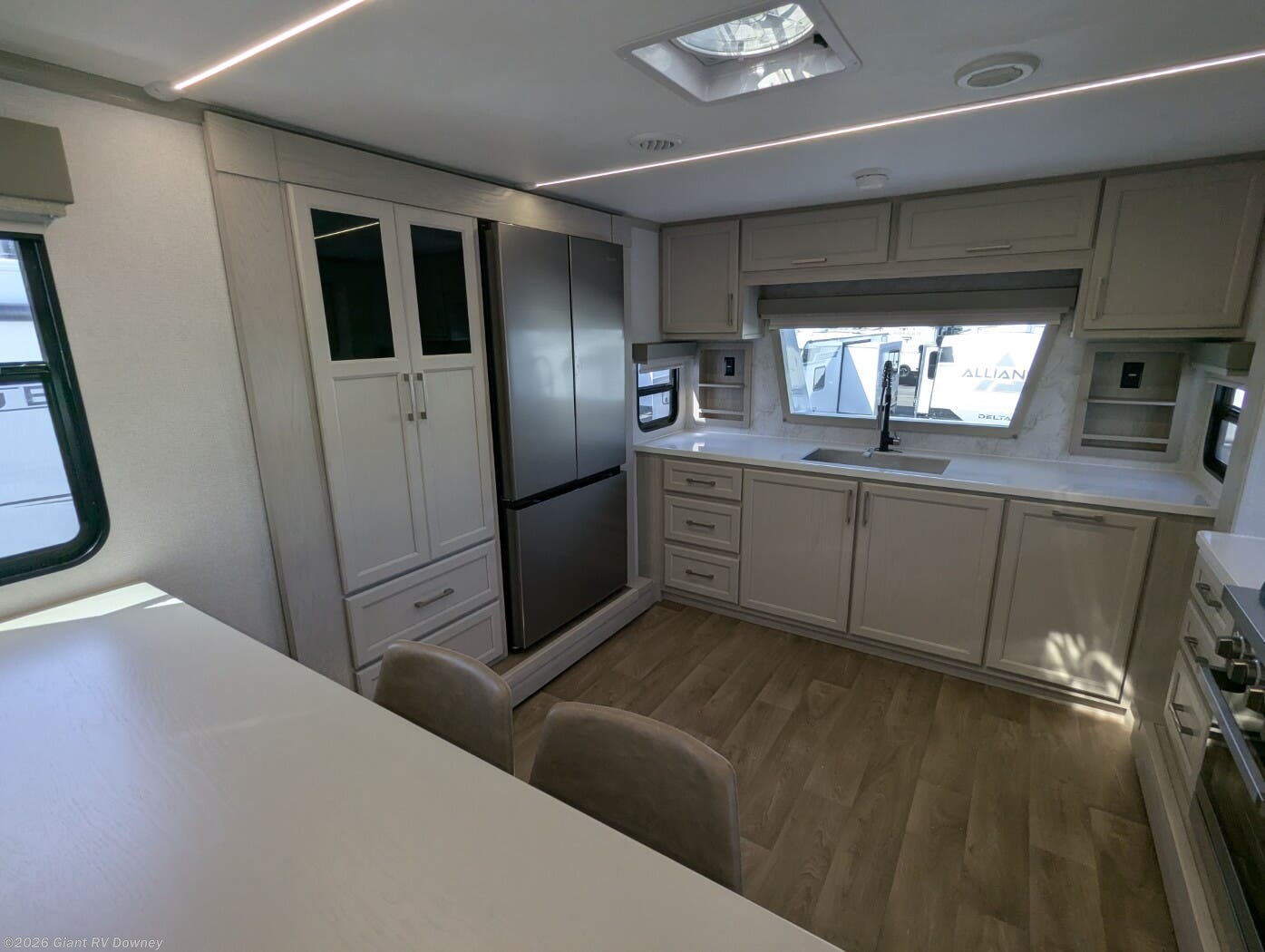 Front Kitchen Floorplan: Sleeps up to 6 with a front kitchen featuring long solid surface countertops, bar seating, large pantry, and opposing slideouts for an open, residential-style galley and living area.