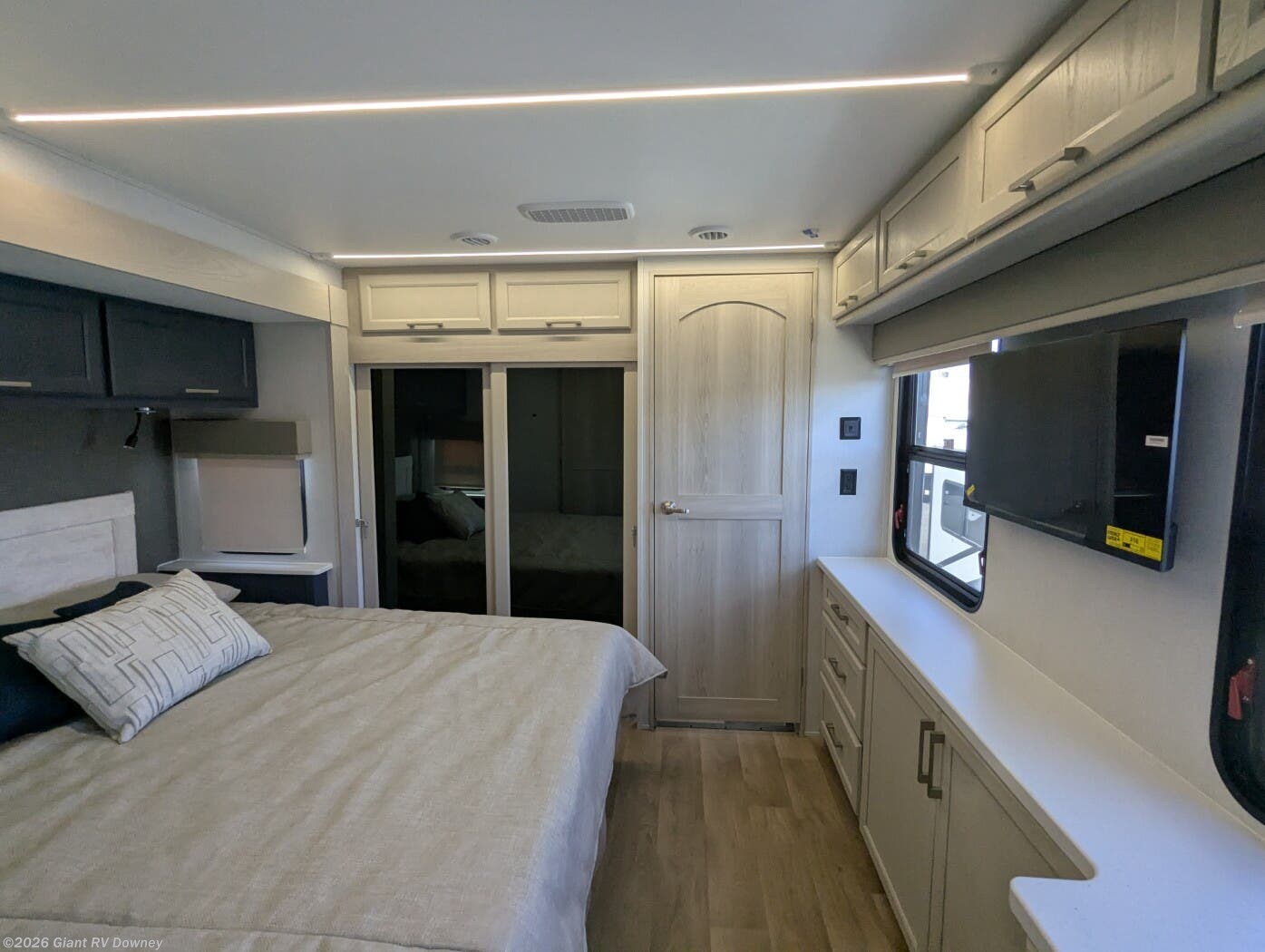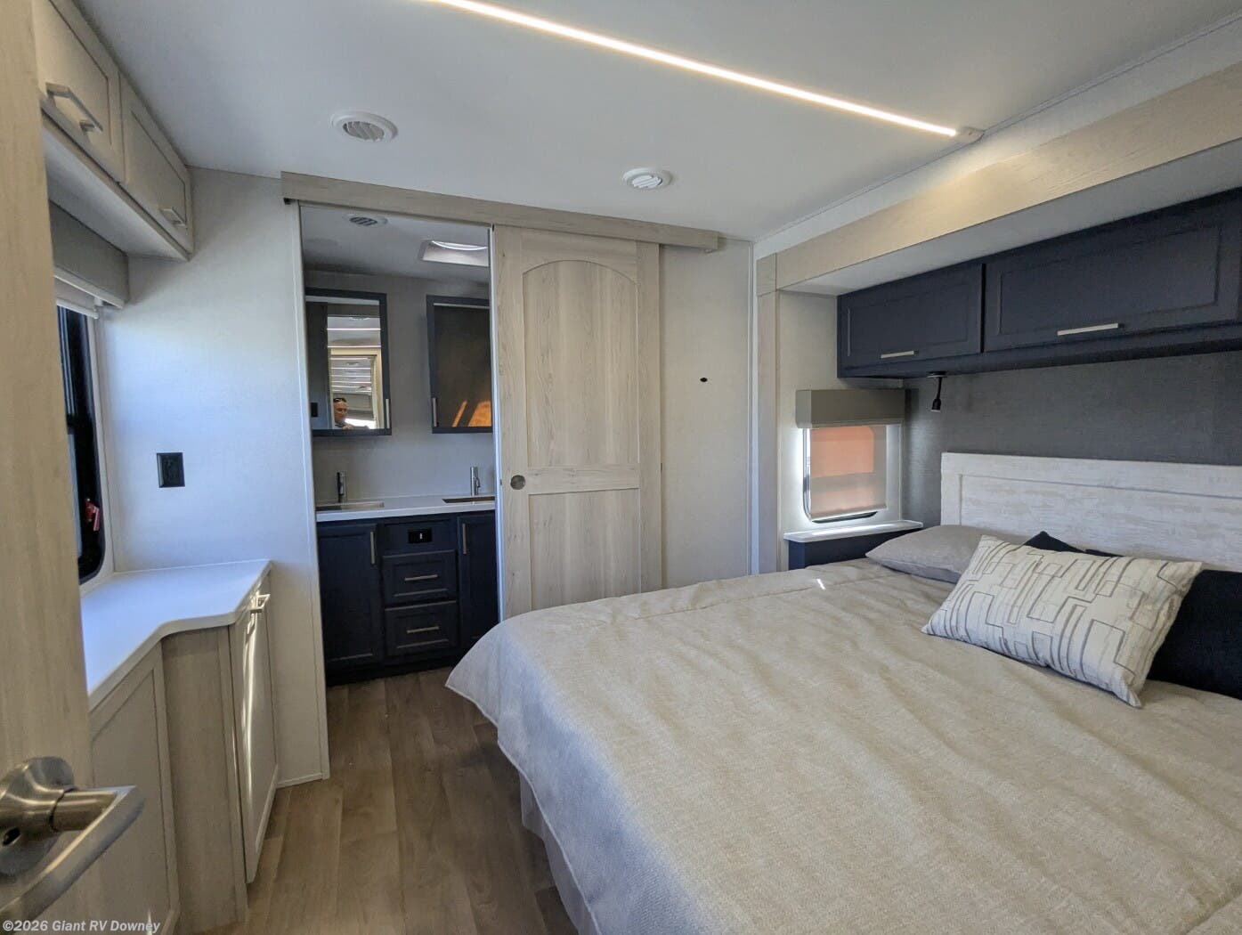 Rear Master Suite Retreat: Private rear bedroom with king bed slideout, wardrobe closets on both sides, dresser, overhead cabinets, and direct access to the full rear bath with dual sinks and shower.