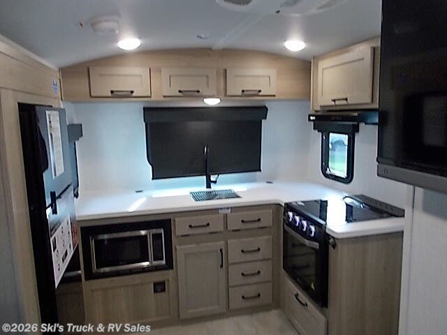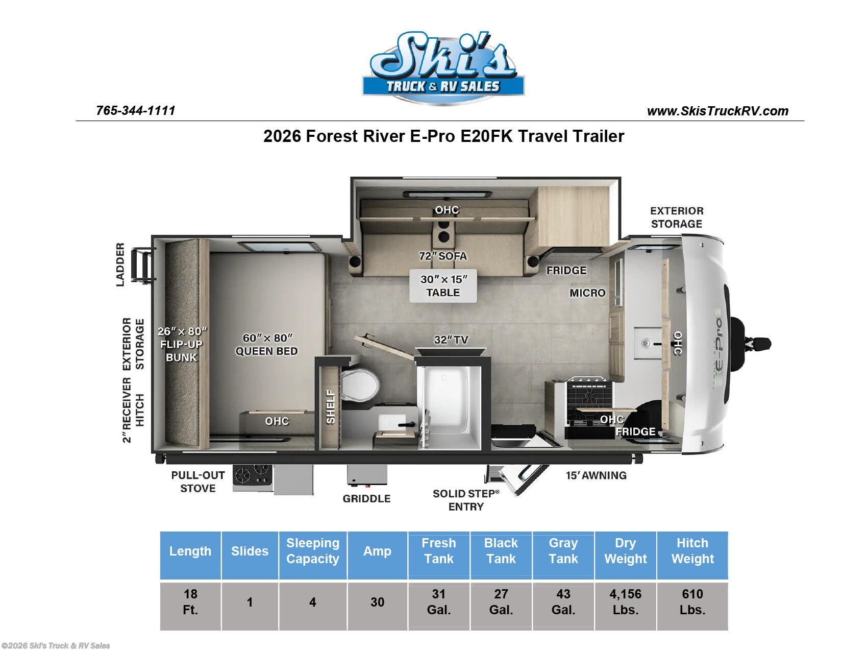 2026 Forest River E-Pro E20FK Travel Trailer; *THIS UNIT AVAILABLE TO ORDER* 18 Foot; 1 Slide w/Topper; Sleeps 4; Hitch Weight: 610 Lbs.; Dry Weight: 4156 Lbs.; 30 Amp; Power Tongue Jacks; Manual Stabilizer Jacks; 31 Gal. Fresh Water Cap.; 27 Gal. Black Water Cap.; 43 Gal. Gray Water Cap.; Two 20 Lbs. Propane Tanks; 13,500 BTU AC; 20,000 BTU Furnace; 5 C.F. (12V) Refrigerator; 6 Gal. Gas/Elec. Water Heater w/Quick Recovery; Microwave; 3-Burner Stove/Oven; One TV Jack; 32 In. Smart TV w/Stereo; Speakers; Power Pro Voice Activated Control Panel; Stainless Steel Sink; Jack-knife Sofa w/30 x 15 In. Table; Queen Bed; Single Flip-Up Bunks; One Bathroom with Shower/Tub; Porcelain Foot Flush Toilet; 15 Foot Power Awning with LED Lights; Solar (200W) Package w/1800W Inverter; Backup Camera Prep.; Outside Kitchen with Griddle and Grill; Exterior Storage; Foldup Steps; Grab Handle; Roof Ladder; Rear Hitch; Screenshot; Key Alike System; Magnetic Door Holders; Black Tank Flush; Heated Tanks; Vacuum Laminated Walls; Fiberglass Cap; Frameless Tinted Windows; Roller Shades; Aluminum Wheels; Spare Tire; Tire Monitoring System; One Year Limited Warranty; Financing Available; Great Travel Trailer for the Price: $30,461. Call Skis Truck & RV Sales at 765-344-1111 or visit us at for more information.