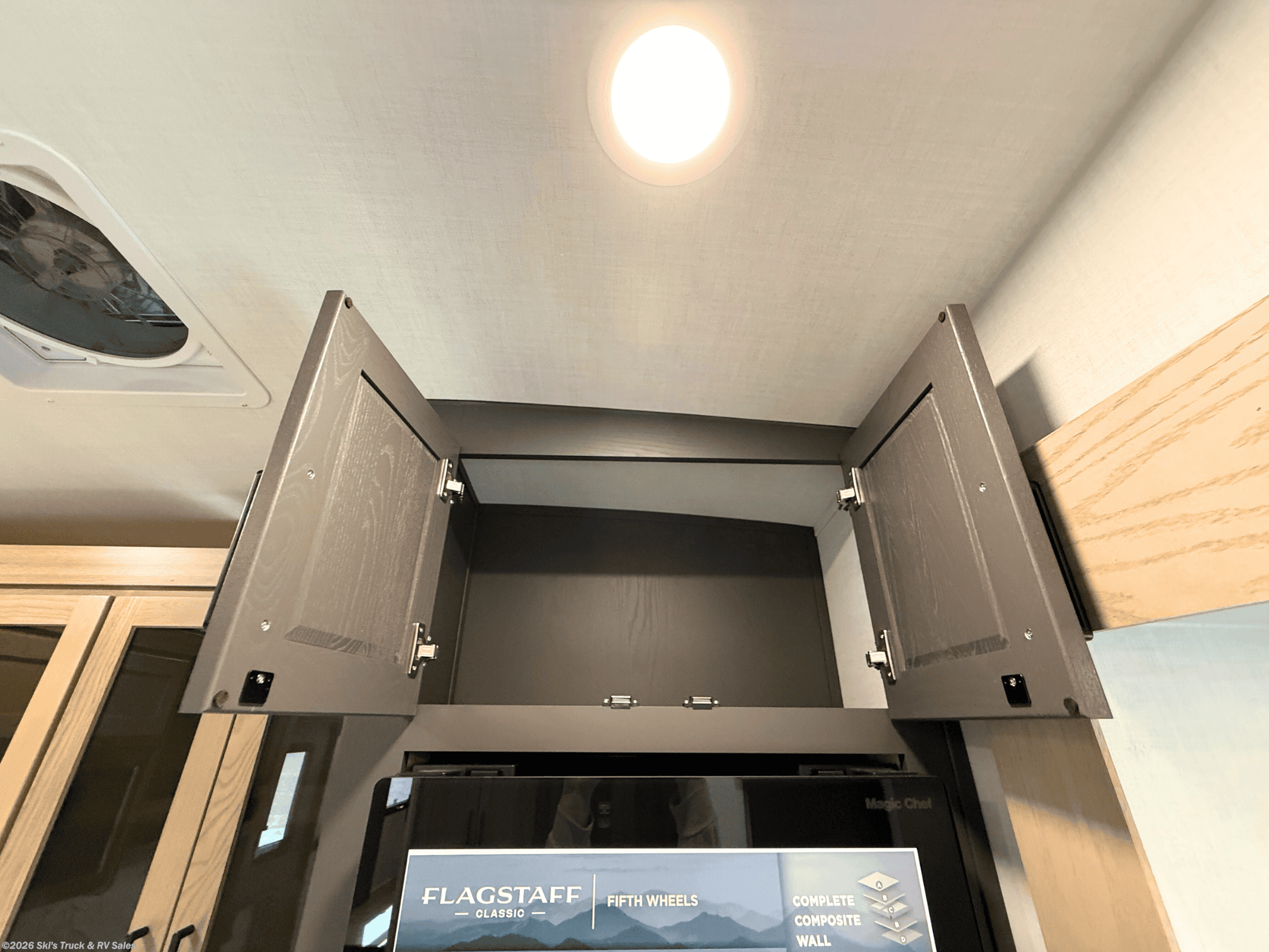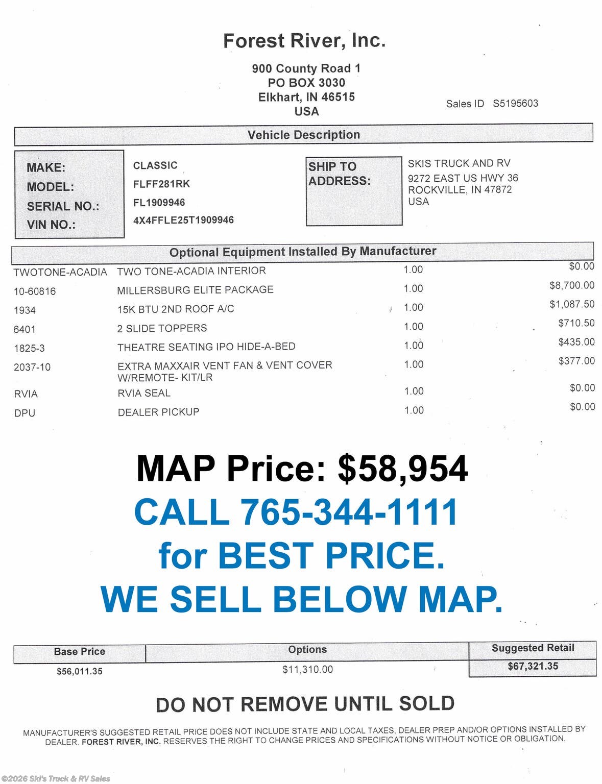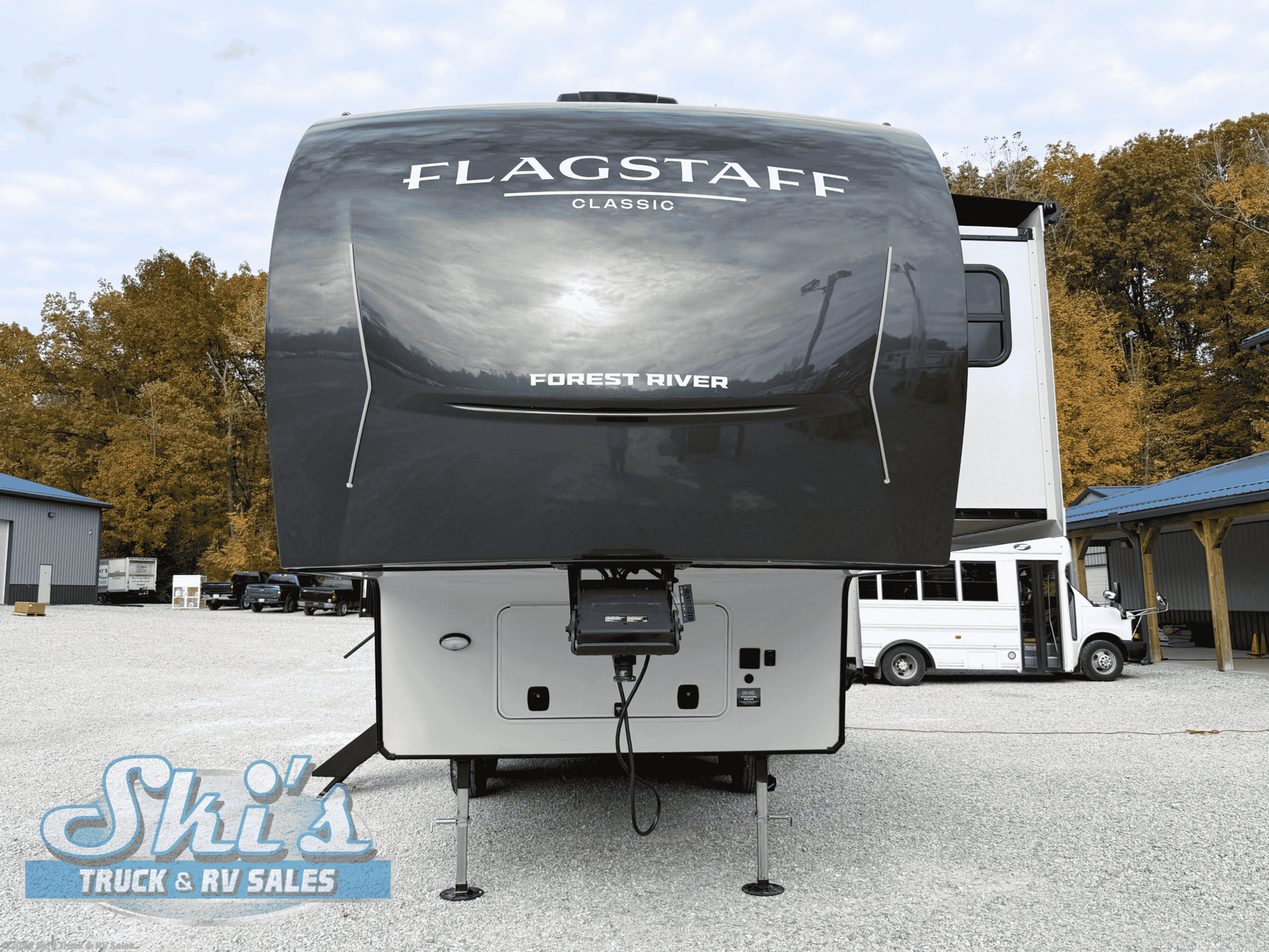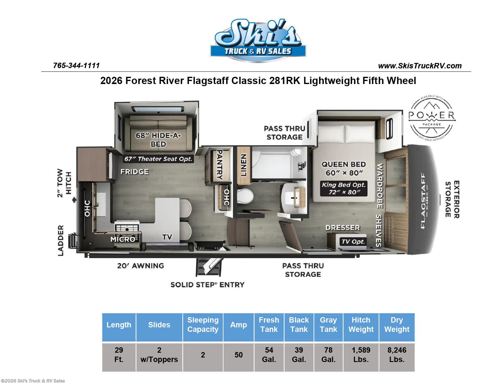 2026 Forest River Flagstaff Classic 281RK Lightweight Fifth Wheel; 29 Foot; 2 Slides w/Toppers; Sleeps 2; Hitch Weight: 1589 Lbs.; Dry Weight: 8246 Lbs.; 50 Amp; Auto Leveling; 54 Gal. Fresh Water Cap.; 39 Gal. Black Water Cap.; 78 Gal. Gray Water Cap.; One 30 Lbs. Propane Tank; Two ACs: 15,000 / 15,000 BTUs; 35,000 BTU Furnace; 10 C.F. (12V) Refrigerator; 12 Gal. Gas/Elec. Water Heater; Microwave; 3-Burner Stove/Oven; Three TV Jacks; 40 In. TV; 30 In. TV; Speakers; Kitchen Island w/Chairs; Pantry; Stainless Steel Sink; Solid Surface Countertops; Tongue and Groove Plywood Flooring; Theater Seats; Queen Bed; One Bathroom with Shower/Sitting Area; 20 Foot Power Awning with LED Lights; 200 Amp Solar Package; Outside Shower; Exterior Storage; Foldup Steps; Grab Handle; Roof Ladder; Magnetic Door Holders; CURT Rota Flex Hitch; Heated Tanks; Frameless Windows; Roller Shades; 6-Sided Aluminum Frame; Battery Disconnect; Black Tank Flush; Goodyear Tires; Aluminum Wheels; Spare Tire; Tire Monitoring; One Year Limited Warranty; Financing Available; Super Lightweight Fifth Wheel for the Price: $58,954* (*MAP PRICE LISTED HERE. WE SELL BELOW MAP PRICE. CALL 765-344-1111 FOR BEST DEAL.). Call Skis Truck & RV Sales at 765-344-1111 or visit us at for more information.