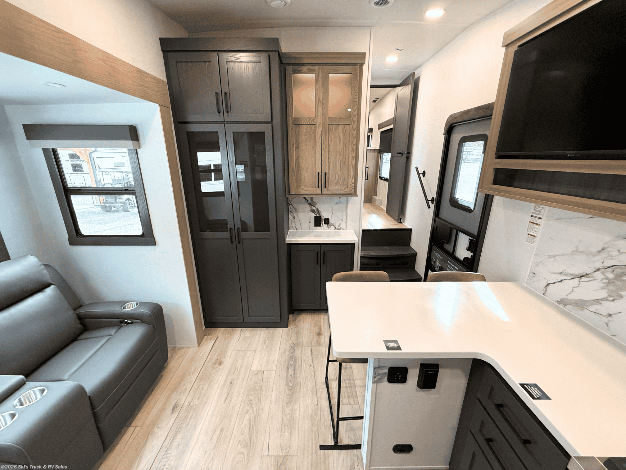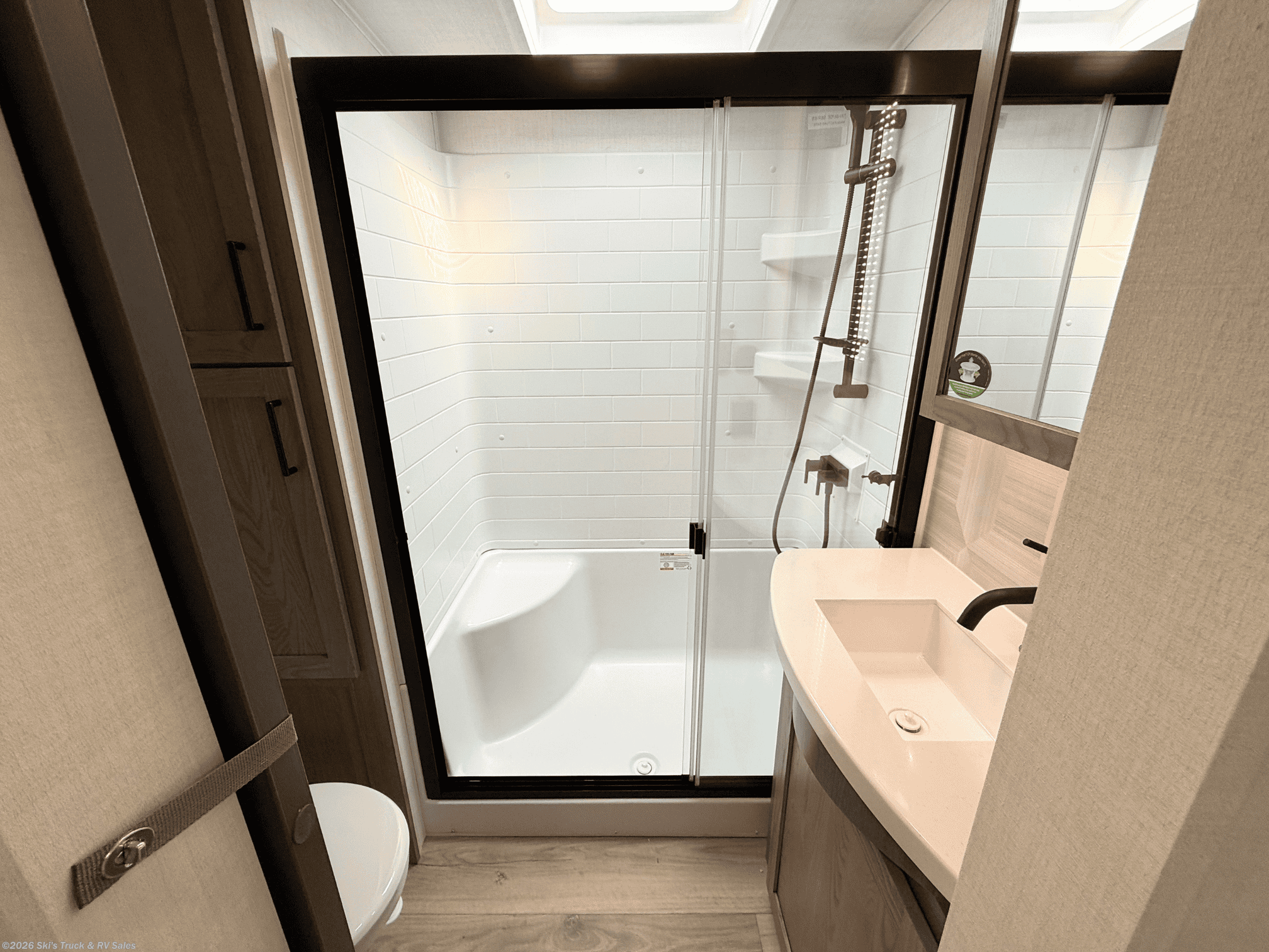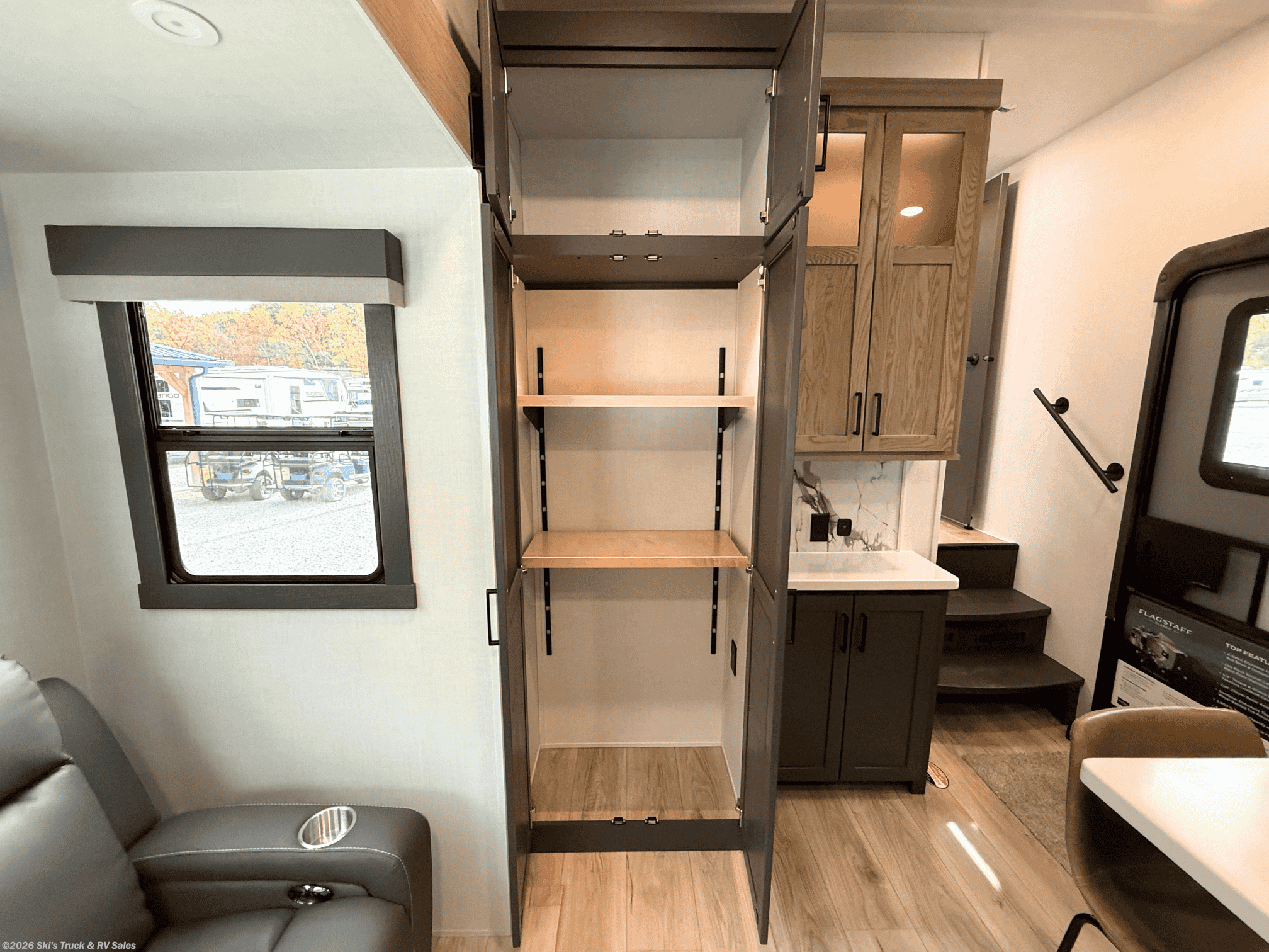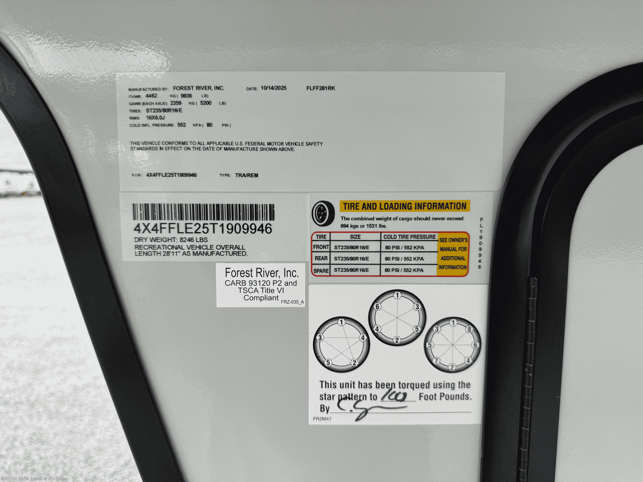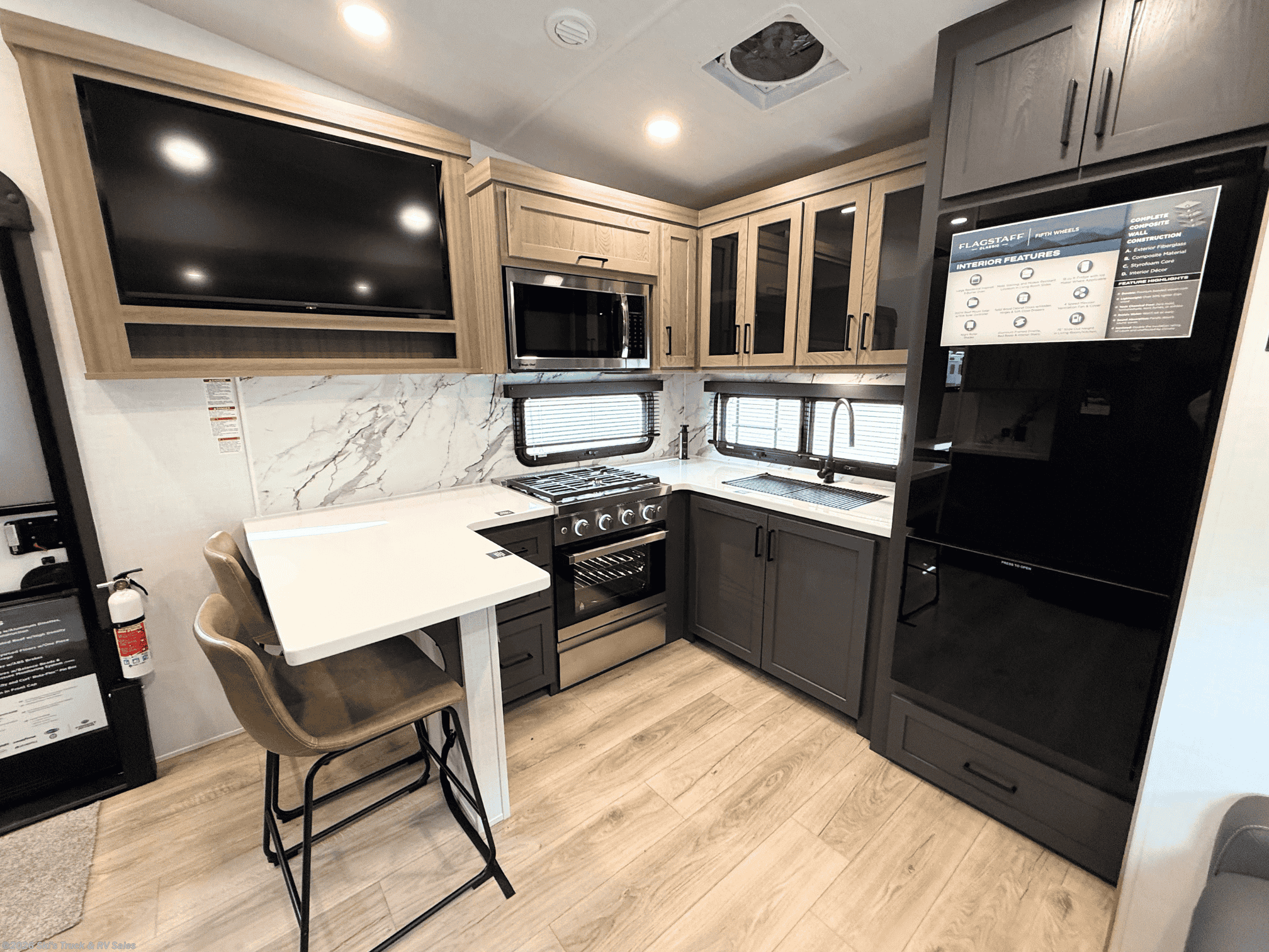 2026 Forest River Flagstaff Classic 281RK Lightweight Fifth Wheel; 29 Foot; 2 Slides w/Toppers; Sleeps 2; Hitch Weight: 1589 Lbs.; Dry Weight: 8246 Lbs.; 50 Amp; Auto Leveling; 54 Gal. Fresh Water Cap.; 39 Gal. Black Water Cap.; 78 Gal. Gray Water Cap.; One 30 Lbs. Propane Tank; Two ACs: 15,000 / 15,000 BTUs; 35,000 BTU Furnace; 10 C.F. (12V) Refrigerator; 12 Gal. Gas/Elec. Water Heater; Microwave; 3-Burner Stove/Oven; Three TV Jacks; 40 In. TV; 30 In. TV; Speakers; Kitchen Island w/Chairs; Pantry; Stainless Steel Sink; Solid Surface Countertops; Tongue and Groove Plywood Flooring; Theater Seats; Queen Bed; One Bathroom with Shower/Sitting Area; 20 Foot Power Awning with LED Lights; 200 Amp Solar Package; Outside Shower; Exterior Storage; Foldup Steps; Grab Handle; Roof Ladder; Magnetic Door Holders; CURT Rota Flex Hitch; Heated Tanks; Frameless Windows; Roller Shades; 6-Sided Aluminum Frame; Battery Disconnect; Black Tank Flush; Goodyear Tires; Aluminum Wheels; Spare Tire; Tire Monitoring; One Year Limited Warranty; Financing Available; Super Lightweight Fifth Wheel for the Price: $58,954* (*MAP PRICE LISTED HERE. WE SELL BELOW MAP PRICE. CALL 765-344-1111 FOR BEST DEAL.). Call Skis Truck & RV Sales at 765-344-1111 or visit us at for more information.