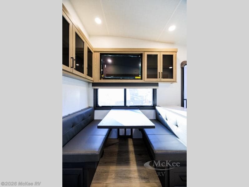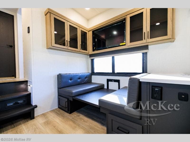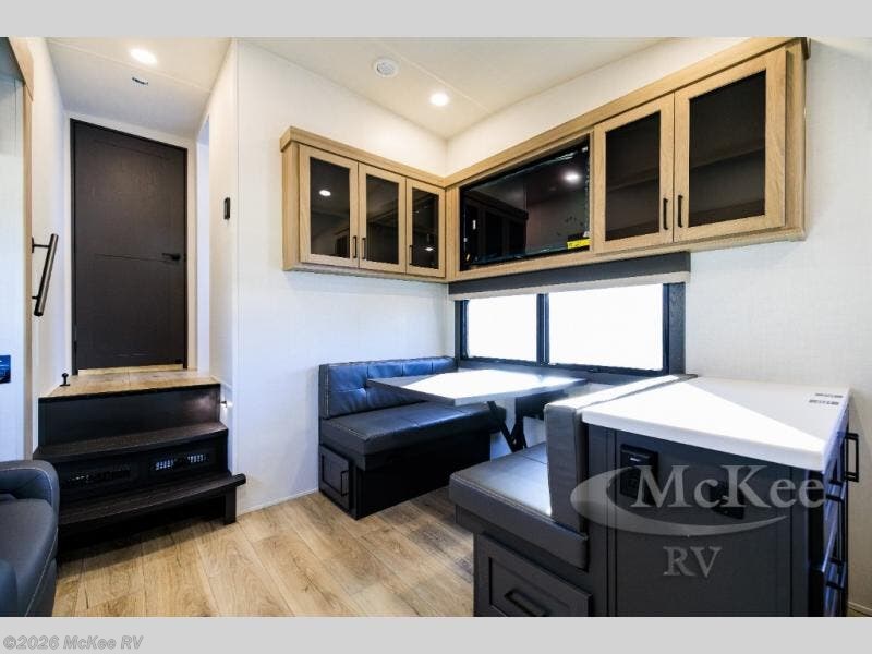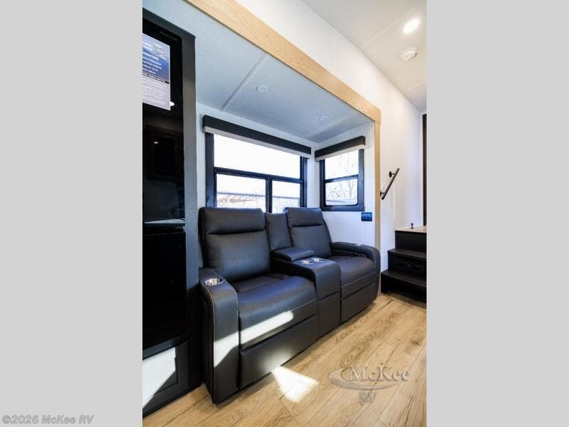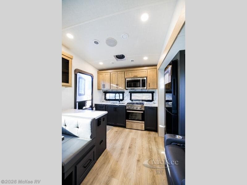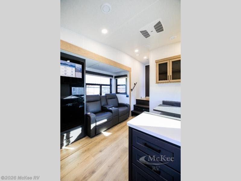 This rear kitchen fifth wheel is the perfect couple's trailer with space for an overnight guest on the booth dinette. There is a front private bedroom with a queen bed where you'll get a great night's rest, and in the morning you can relax on the theater seat with your coffee. The chef of your group will appreciate ample counter space to prep meals, and if the weather is nice, you might want to take your plate outdoors to eat under the 20' power awning.
