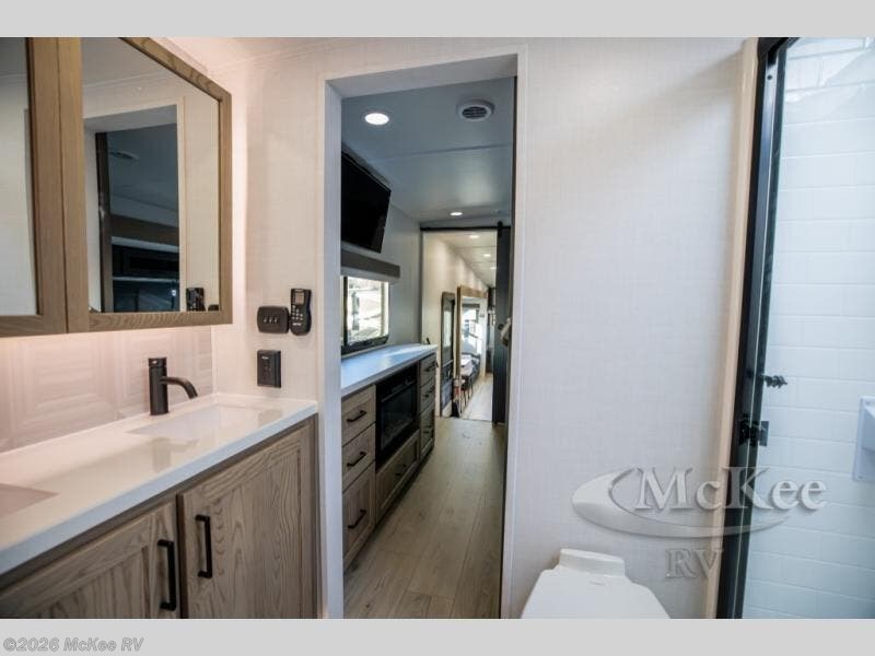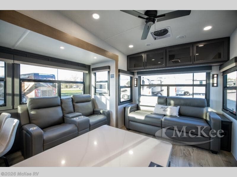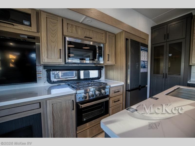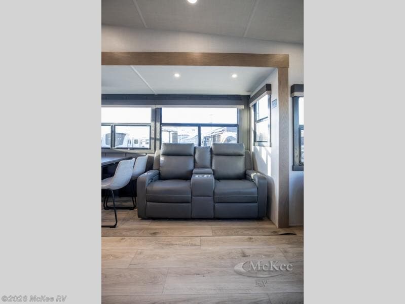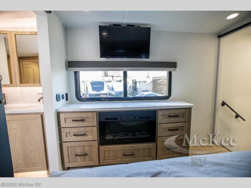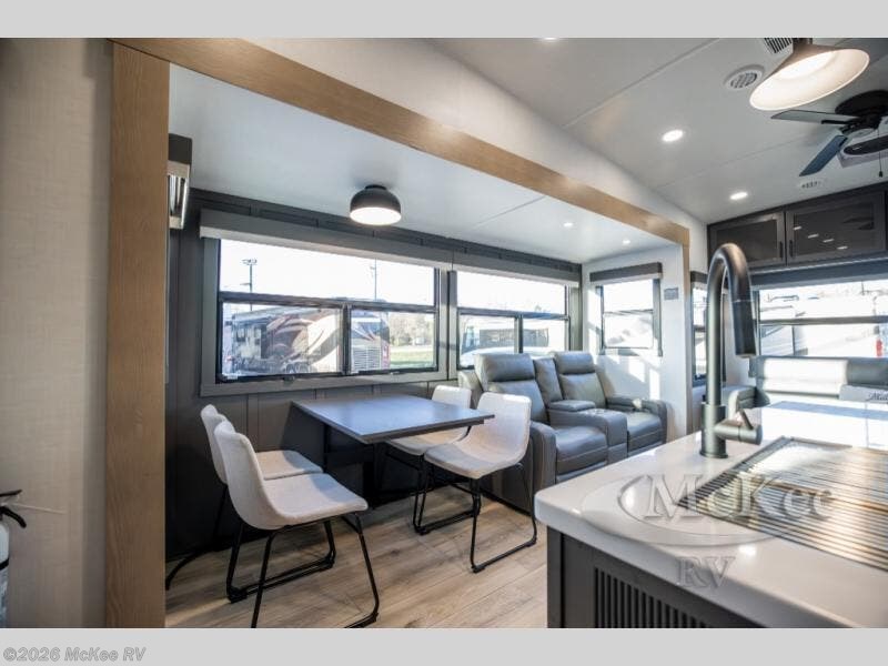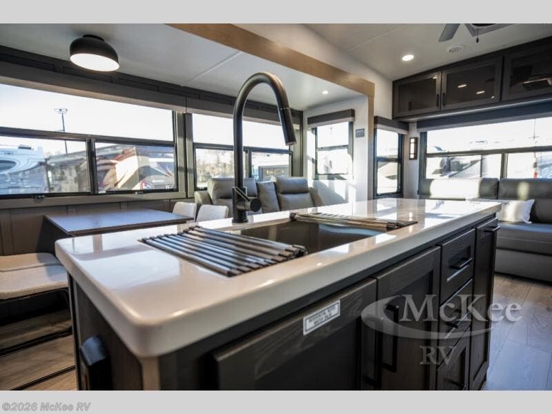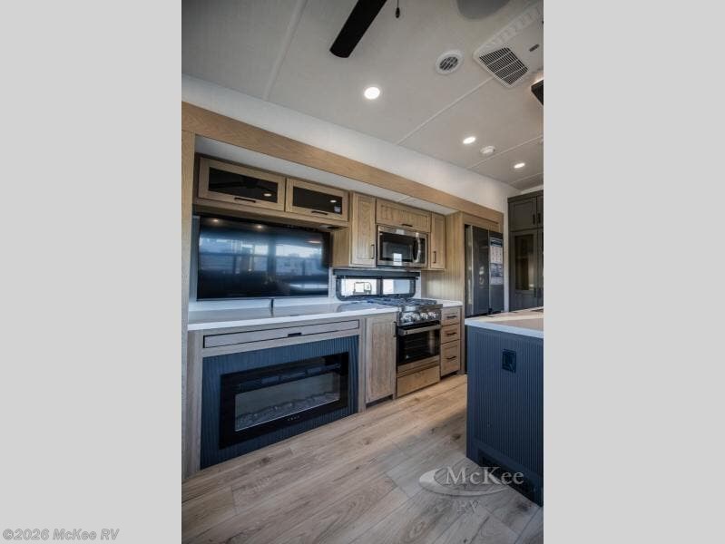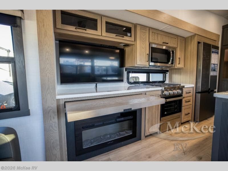 You can't go wrong when choosing this spacious fifth wheel! The master bedroom features a king bed slide out, wardrobe, and a dresser with a fireplace, and the full front bath is sure to bring comfort. There are dual bath sinks here, tons of storage, and even washer and dryer prep if you choose to add these appliances. The mid-coach half bath will come in handy if you have guests staying over on the rear hide-a-bed sofa. You'll also find a theater seat and a rotating table and chairs where you can dine and relax each day, plus there is a large kitchen island so the chef of your group has plenty of prep space. A Smart TV and fireplace will make your space feel more like home, and there is a pull-out desk here if you need to get some work done!