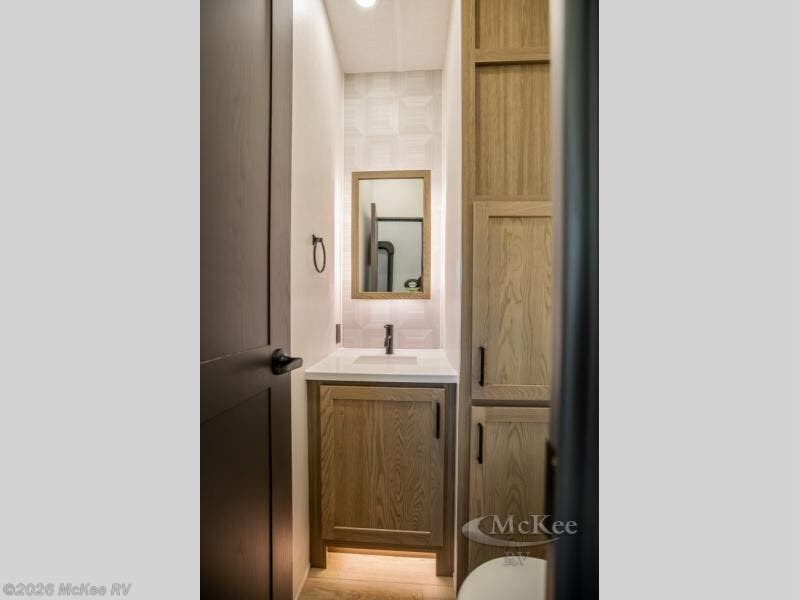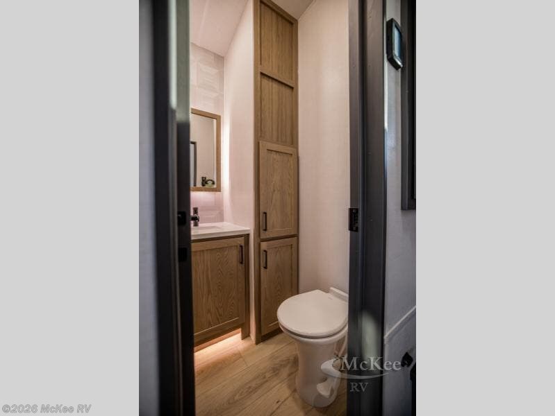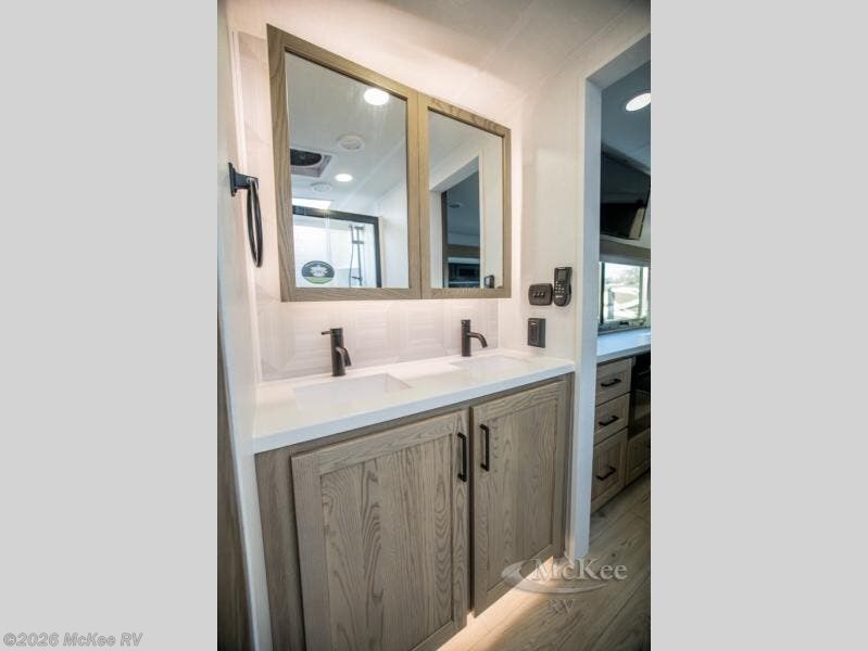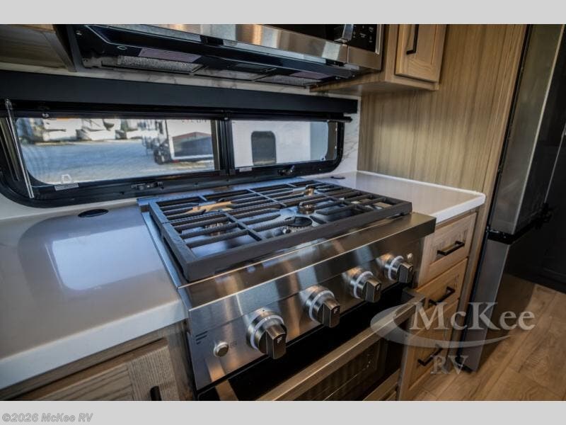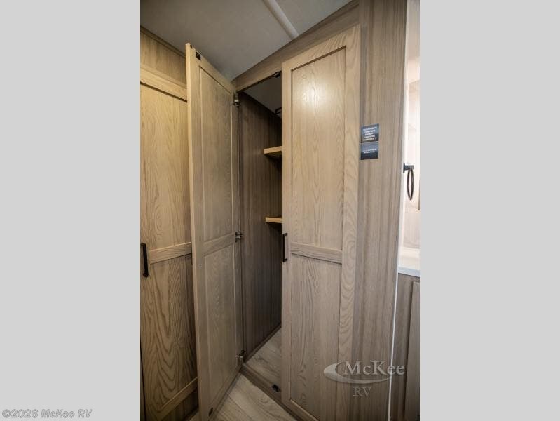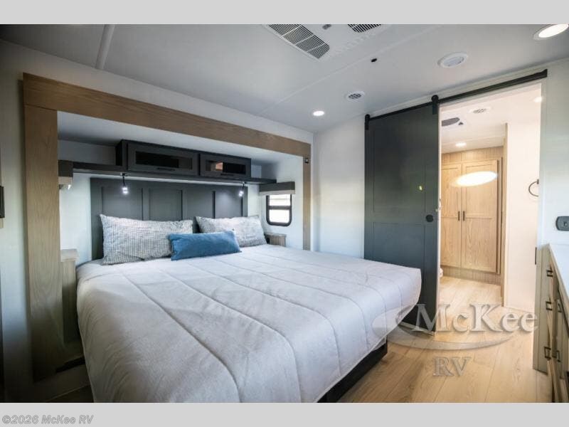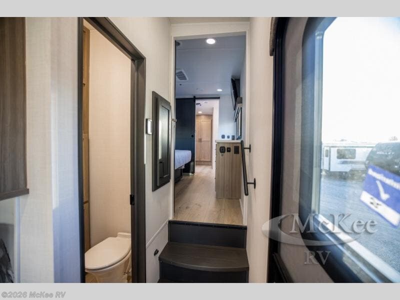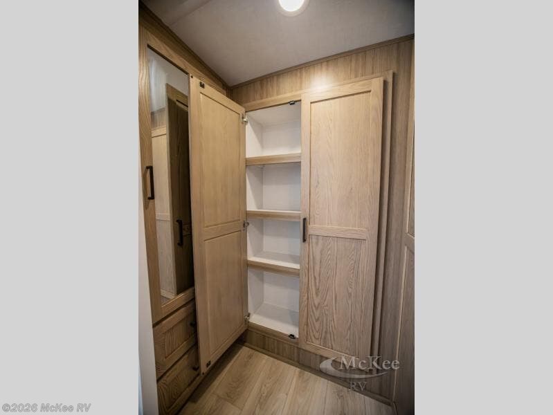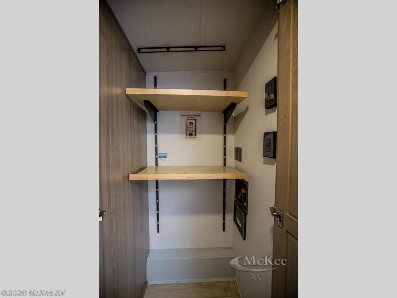 You can't go wrong when choosing this spacious fifth wheel! The master bedroom features a king bed slide out, wardrobe, and a dresser with a fireplace, and the full front bath is sure to bring comfort. There are dual bath sinks here, tons of storage, and even washer and dryer prep if you choose to add these appliances. The mid-coach half bath will come in handy if you have guests staying over on the rear hide-a-bed sofa. You'll also find a theater seat and a rotating table and chairs where you can dine and relax each day, plus there is a large kitchen island so the chef of your group has plenty of prep space. A Smart TV and fireplace will make your space feel more like home, and there is a pull-out desk here if you need to get some work done!