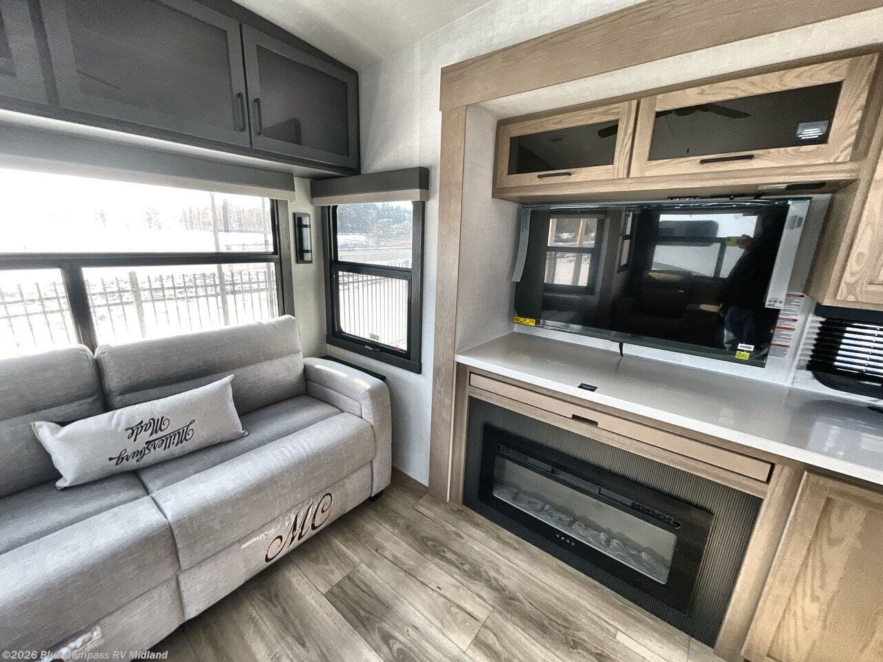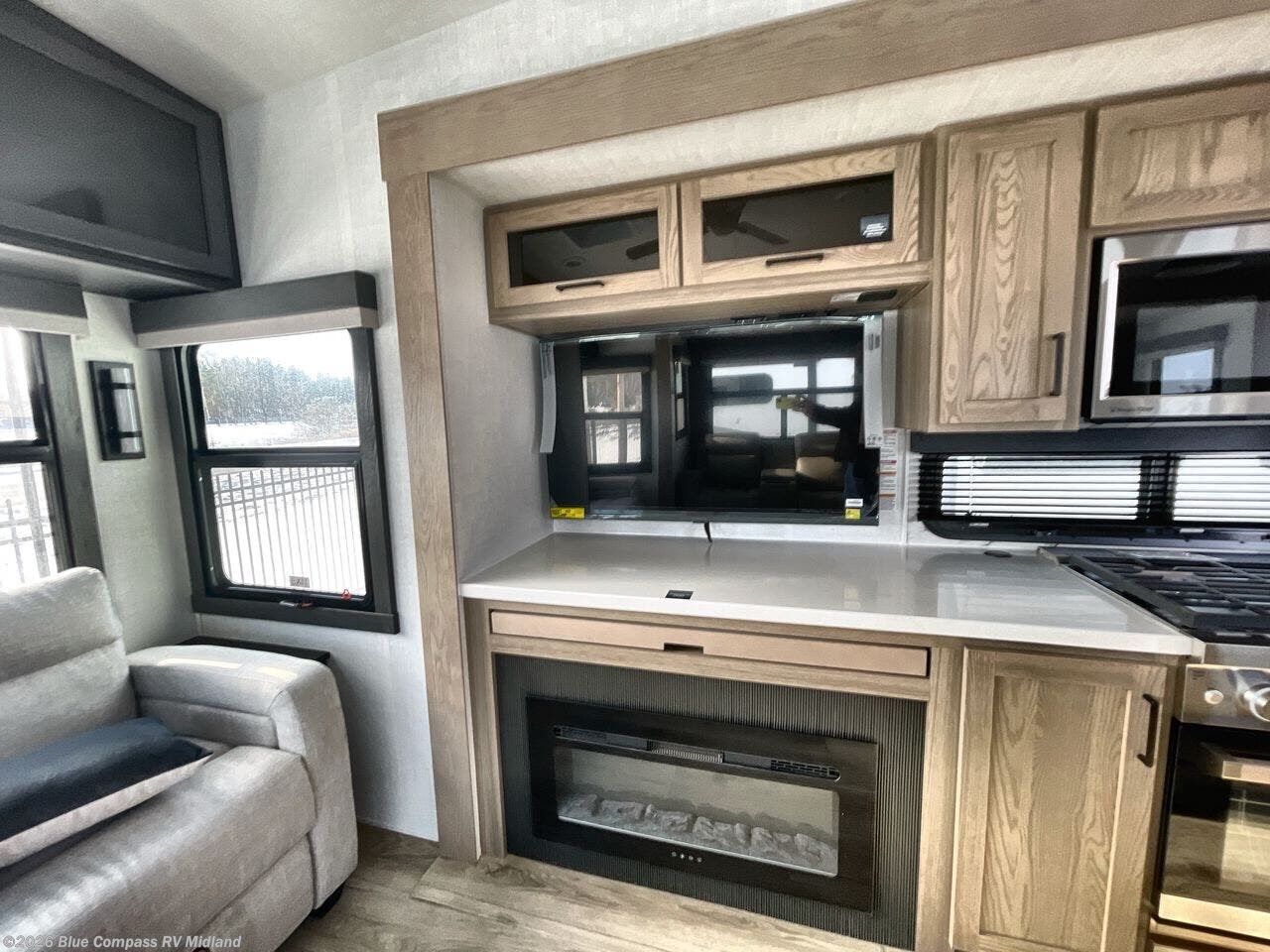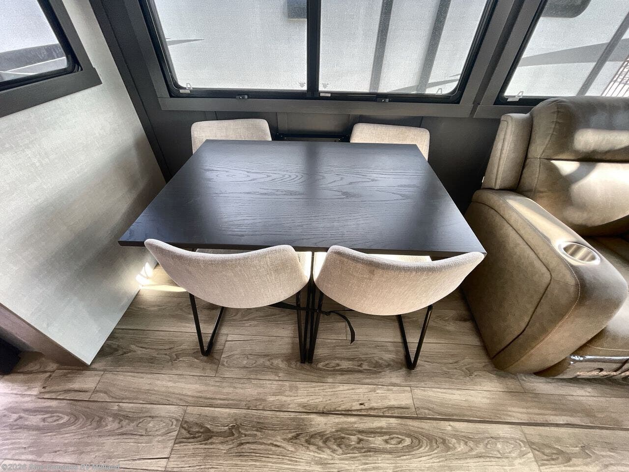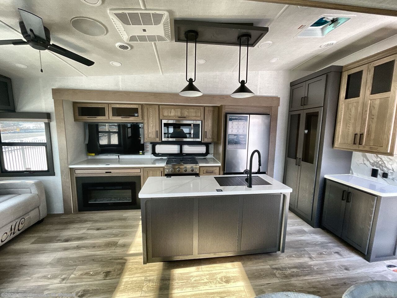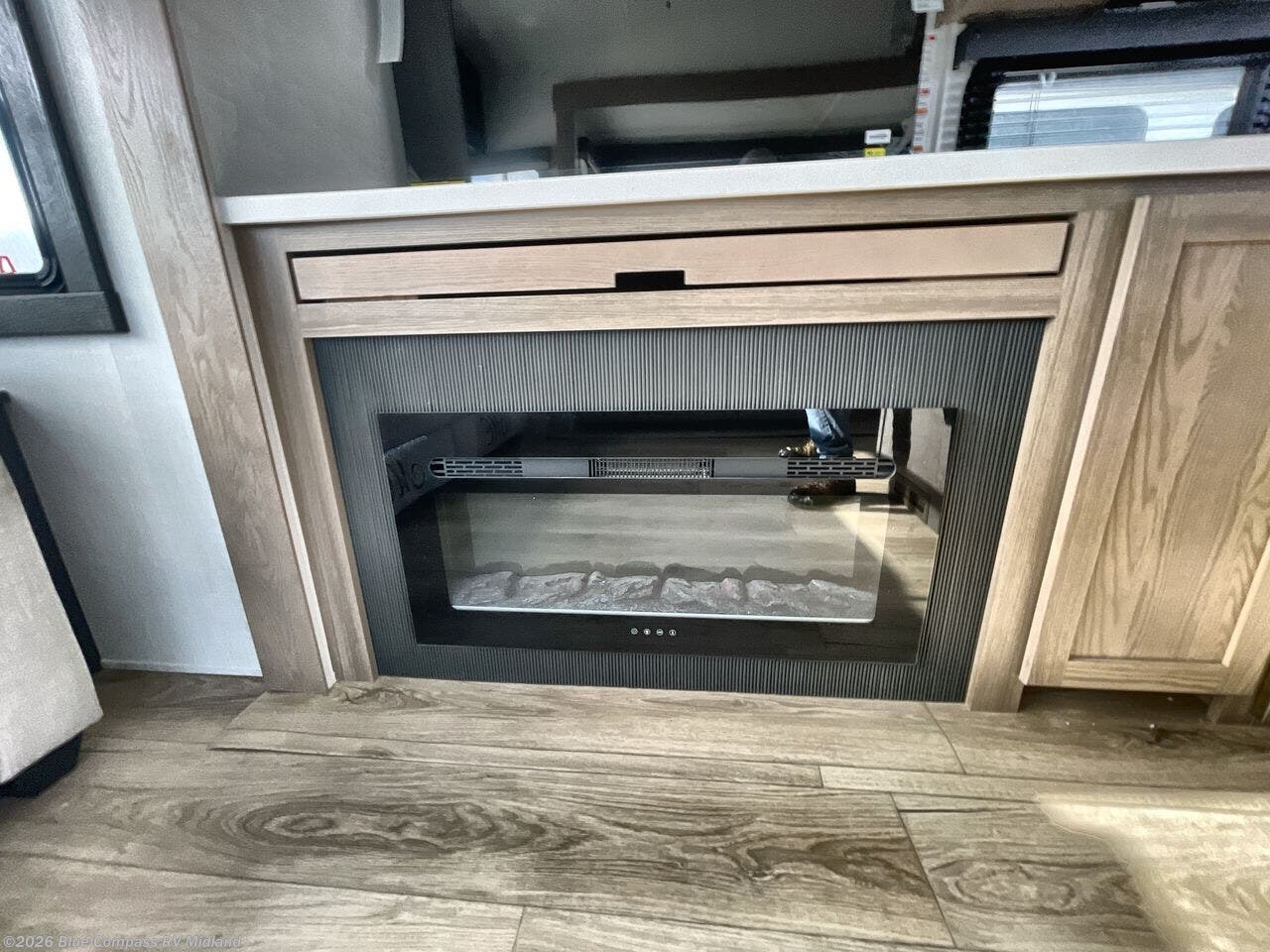 You can't go wrong when choosing this spacious fifth wheel! The master bedroom features a king bed slide out, wardrobe, and a dresser with a fireplace, and the full front bath is sure to bring comfort. There are dual bath sinks here, tons of storage, and even washer and dryer prep if you choose to add these appliances. The mid-coach half bath will come in handy if you have guests staying over on the rear hide-a-bed sofa. You'll also find a theater seat and a rotating table and chairs where you can dine and relax each day, plus there is a large kitchen island so the chef of your group has plenty of prep space. A Smart TV and fireplace will make your space feel more like home, and there is a pull-out desk here if you need to get some work done!