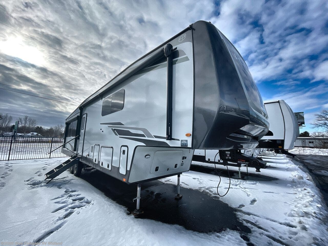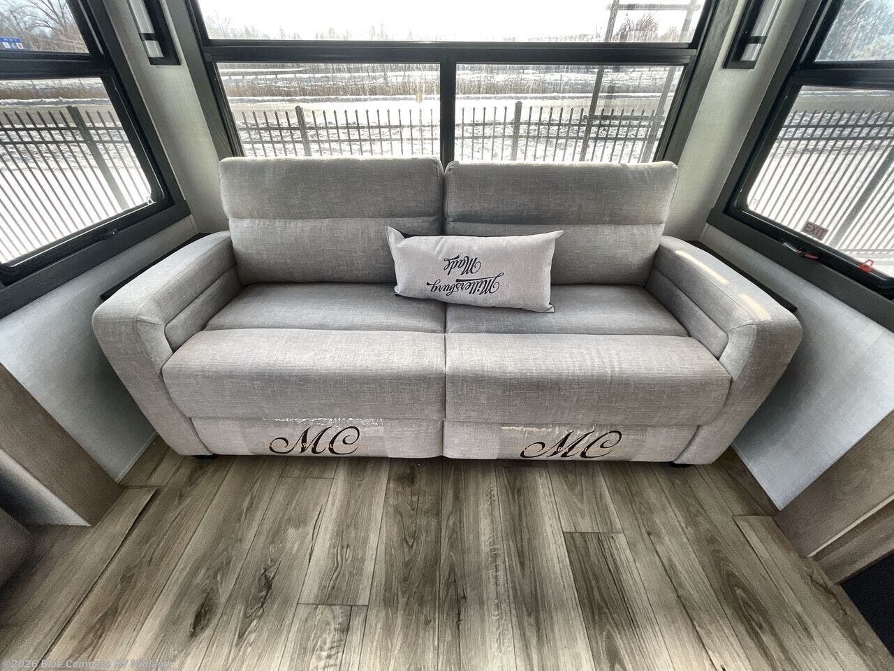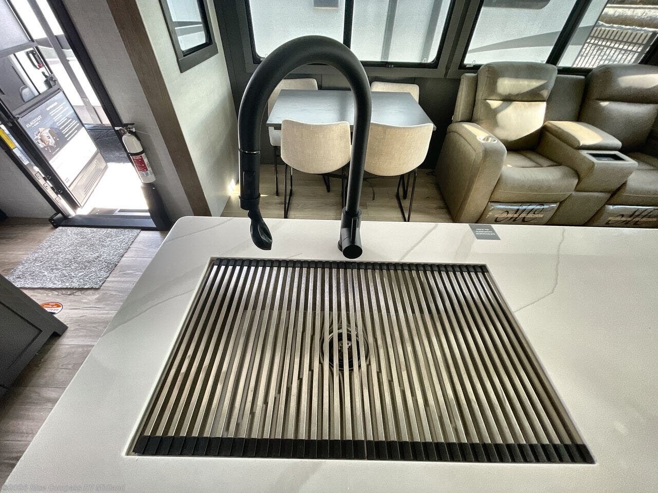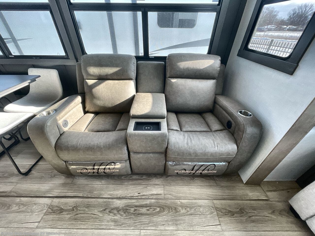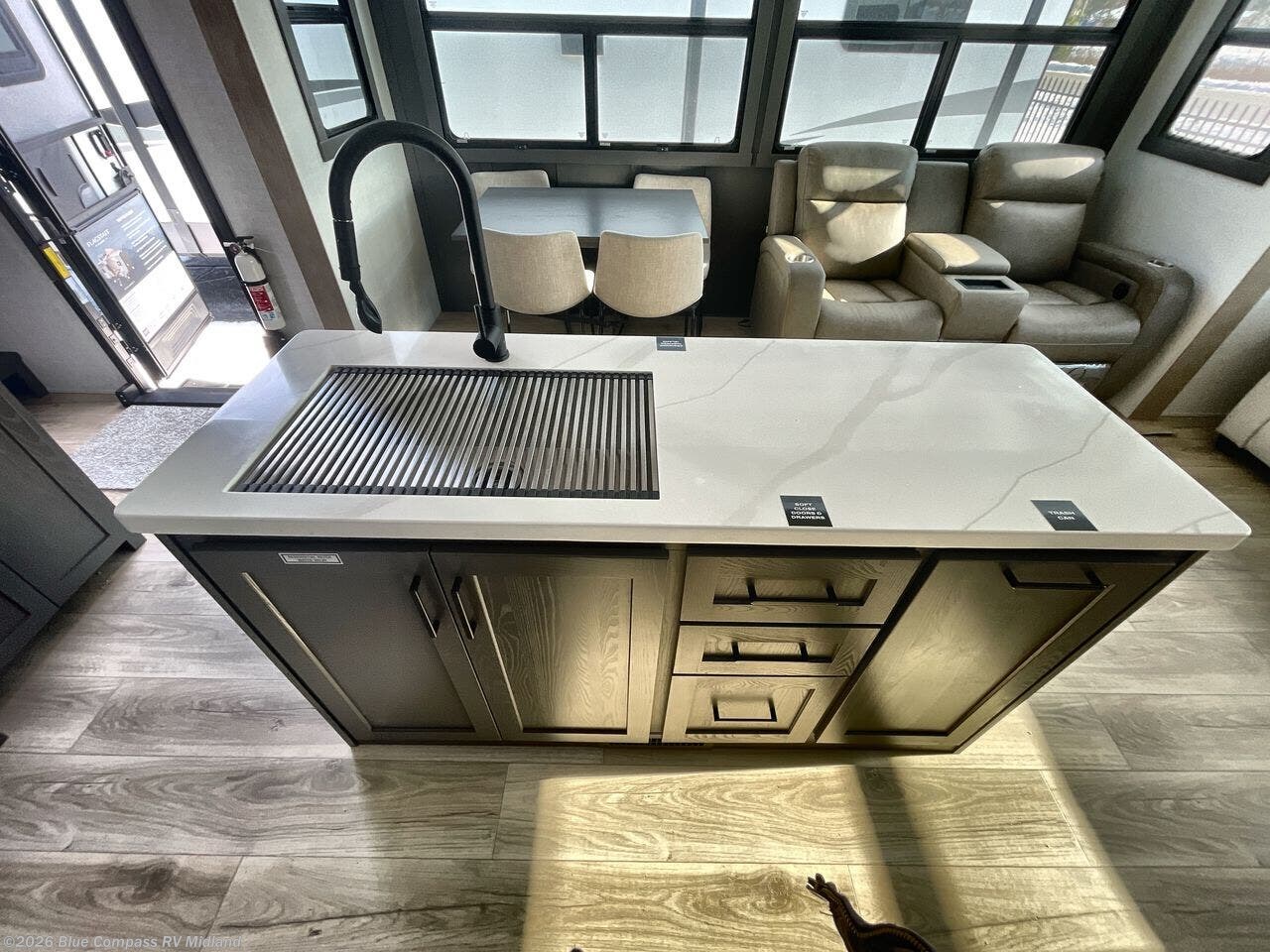 You can't go wrong when choosing this spacious fifth wheel! The master bedroom features a king bed slide out, wardrobe, and a dresser with a fireplace, and the full front bath is sure to bring comfort. There are dual bath sinks here, tons of storage, and even washer and dryer prep if you choose to add these appliances. The mid-coach half bath will come in handy if you have guests staying over on the rear hide-a-bed sofa. You'll also find a theater seat and a rotating table and chairs where you can dine and relax each day, plus there is a large kitchen island so the chef of your group has plenty of prep space. A Smart TV and fireplace will make your space feel more like home, and there is a pull-out desk here if you need to get some work done!