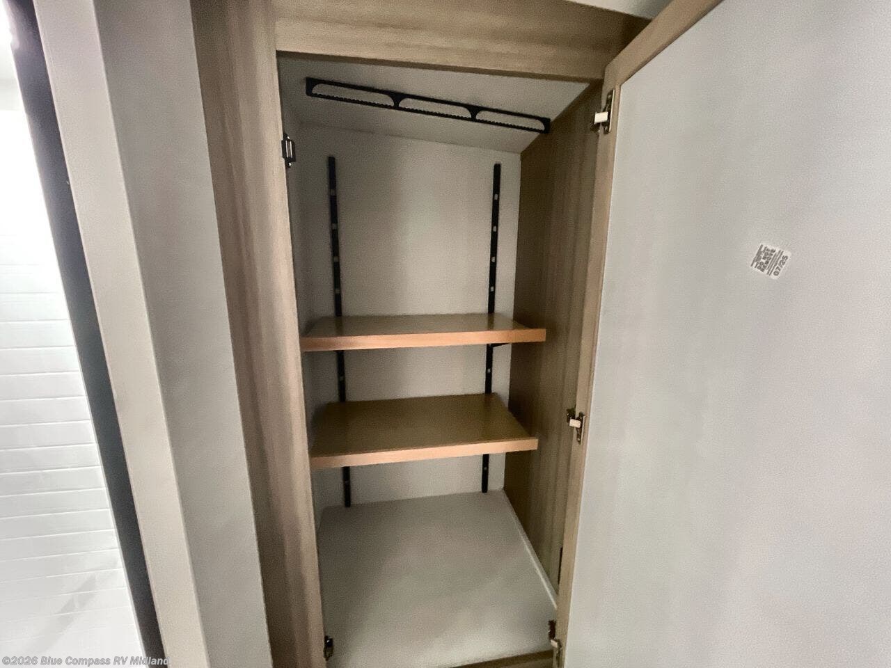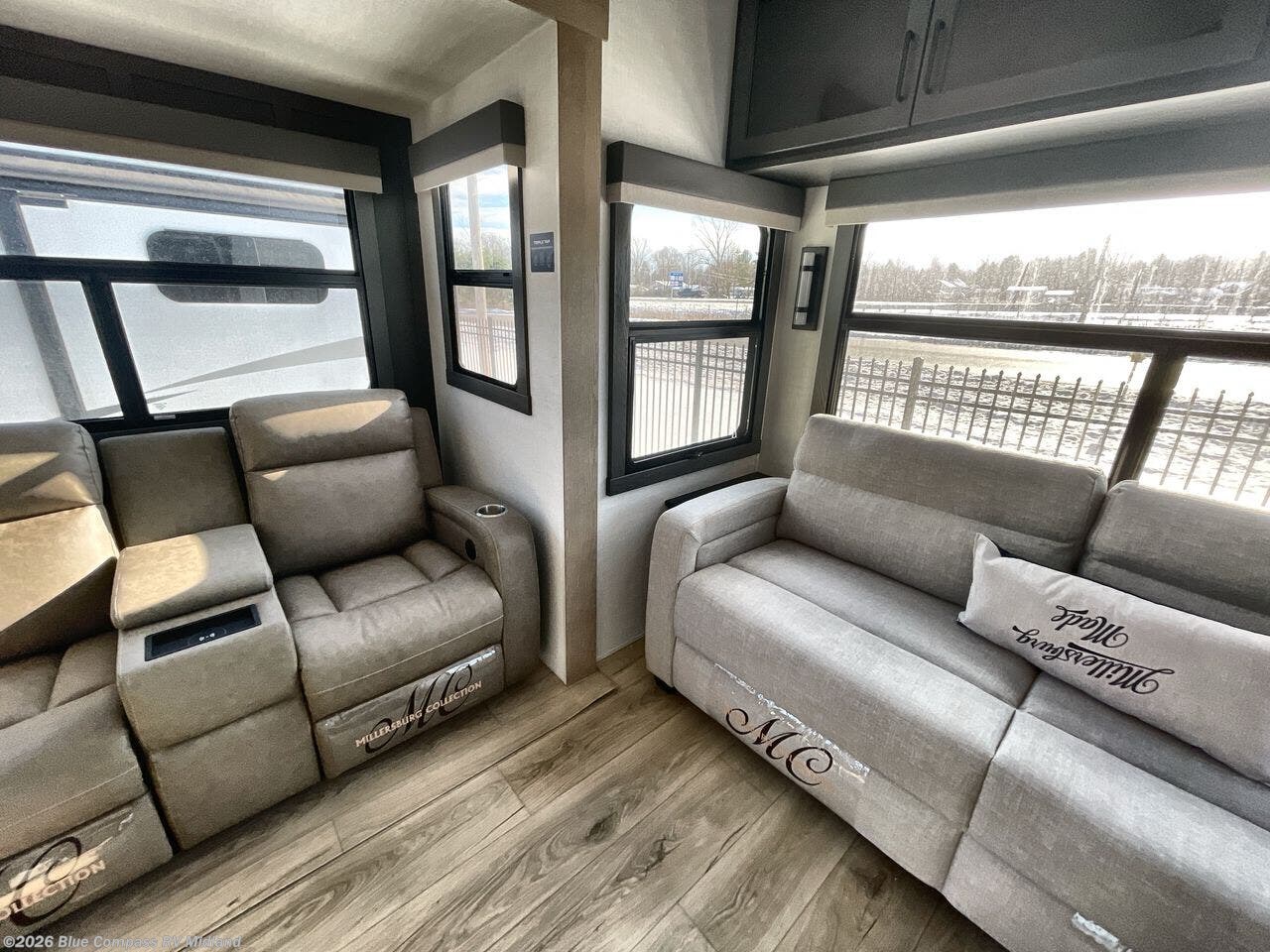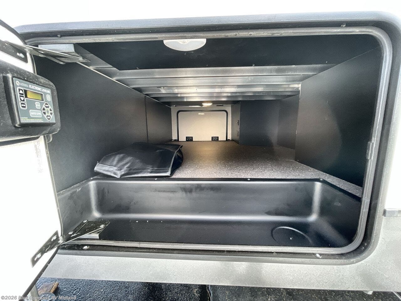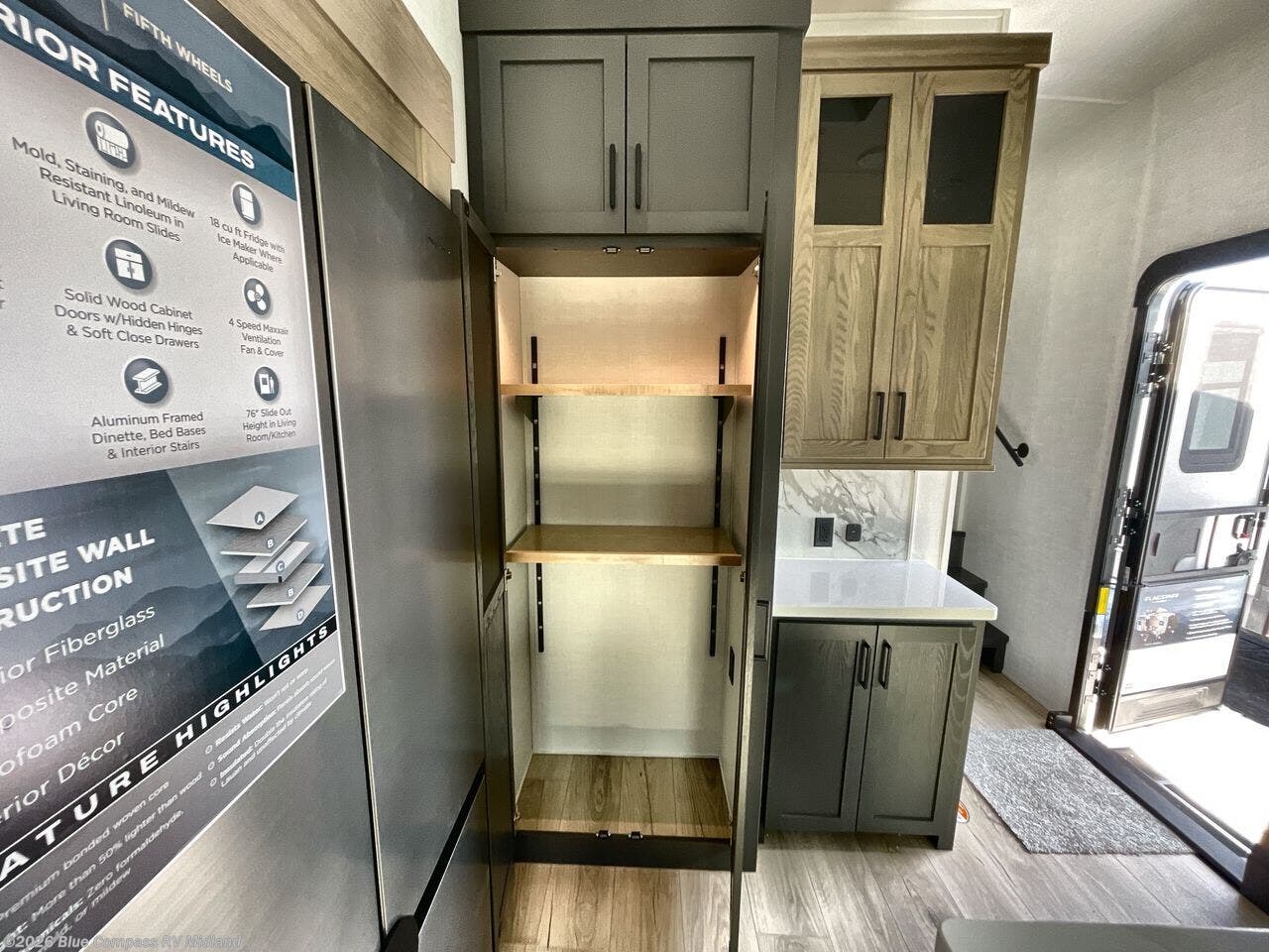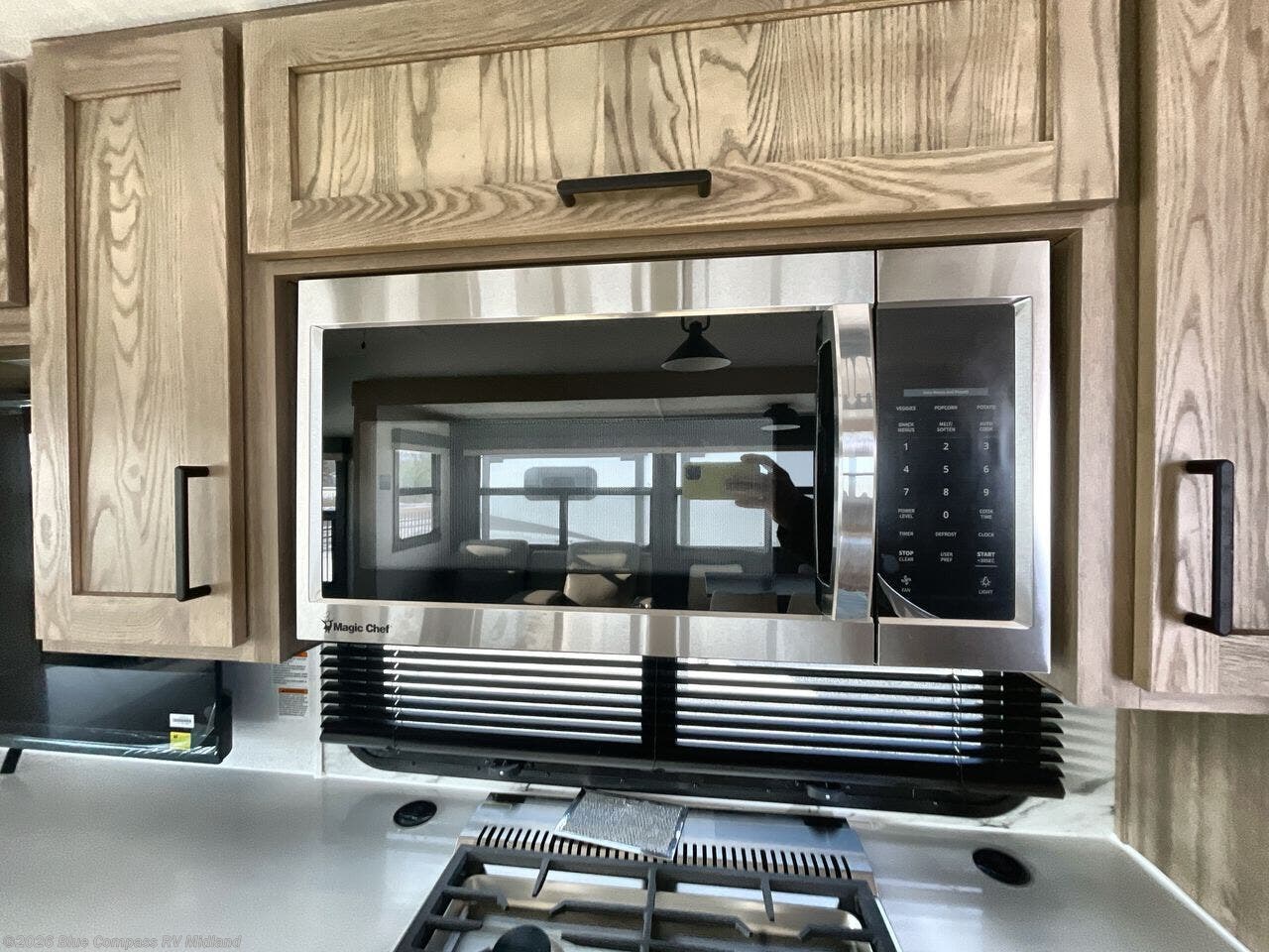 You can't go wrong when choosing this spacious fifth wheel! The master bedroom features a king bed slide out, wardrobe, and a dresser with a fireplace, and the full front bath is sure to bring comfort. There are dual bath sinks here, tons of storage, and even washer and dryer prep if you choose to add these appliances. The mid-coach half bath will come in handy if you have guests staying over on the rear hide-a-bed sofa. You'll also find a theater seat and a rotating table and chairs where you can dine and relax each day, plus there is a large kitchen island so the chef of your group has plenty of prep space. A Smart TV and fireplace will make your space feel more like home, and there is a pull-out desk here if you need to get some work done!