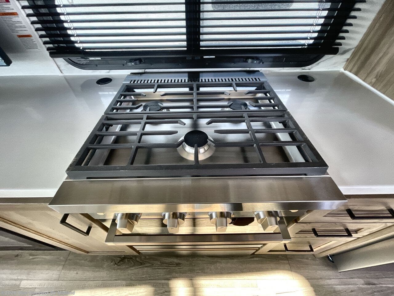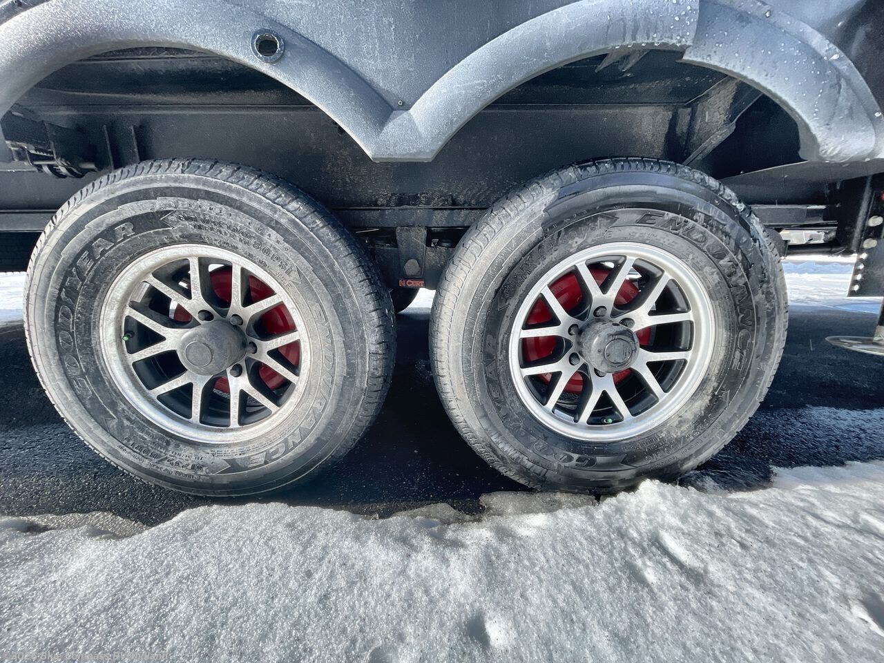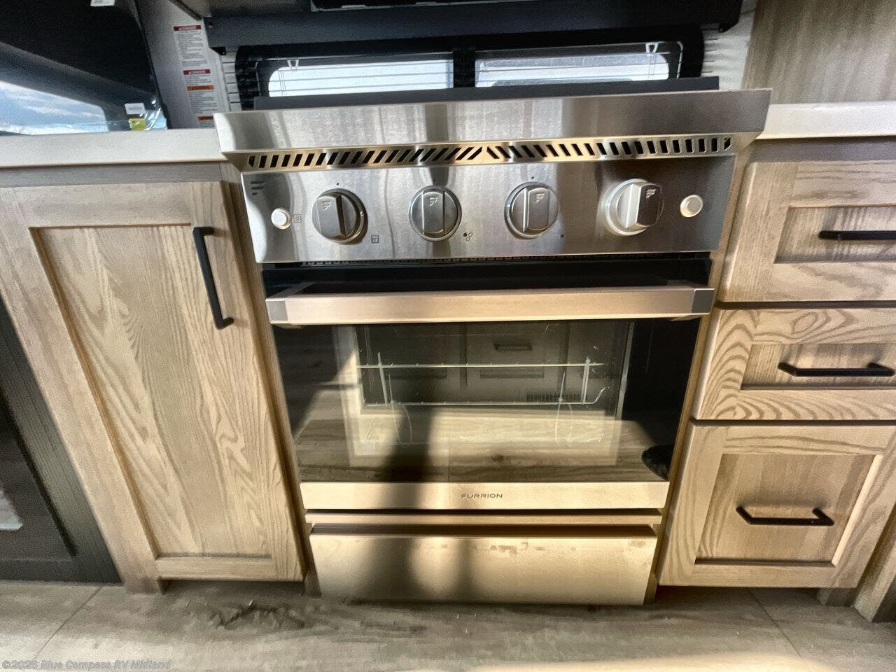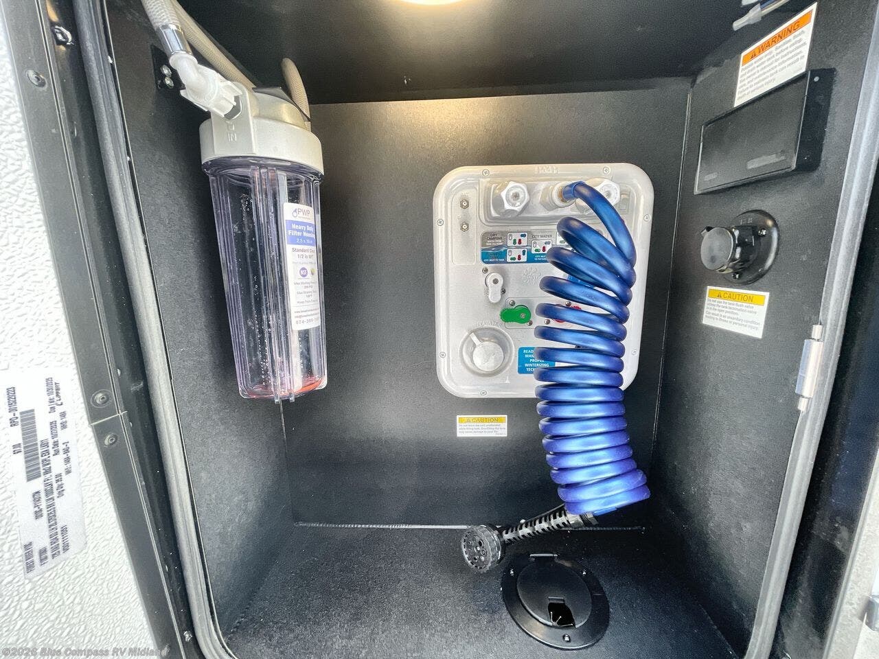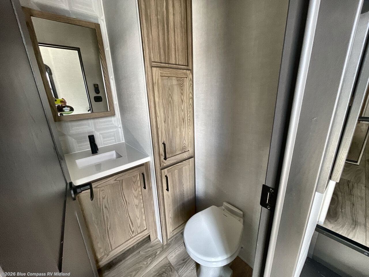 You can't go wrong when choosing this spacious fifth wheel! The master bedroom features a king bed slide out, wardrobe, and a dresser with a fireplace, and the full front bath is sure to bring comfort. There are dual bath sinks here, tons of storage, and even washer and dryer prep if you choose to add these appliances. The mid-coach half bath will come in handy if you have guests staying over on the rear hide-a-bed sofa. You'll also find a theater seat and a rotating table and chairs where you can dine and relax each day, plus there is a large kitchen island so the chef of your group has plenty of prep space. A Smart TV and fireplace will make your space feel more like home, and there is a pull-out desk here if you need to get some work done!