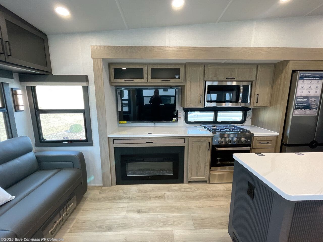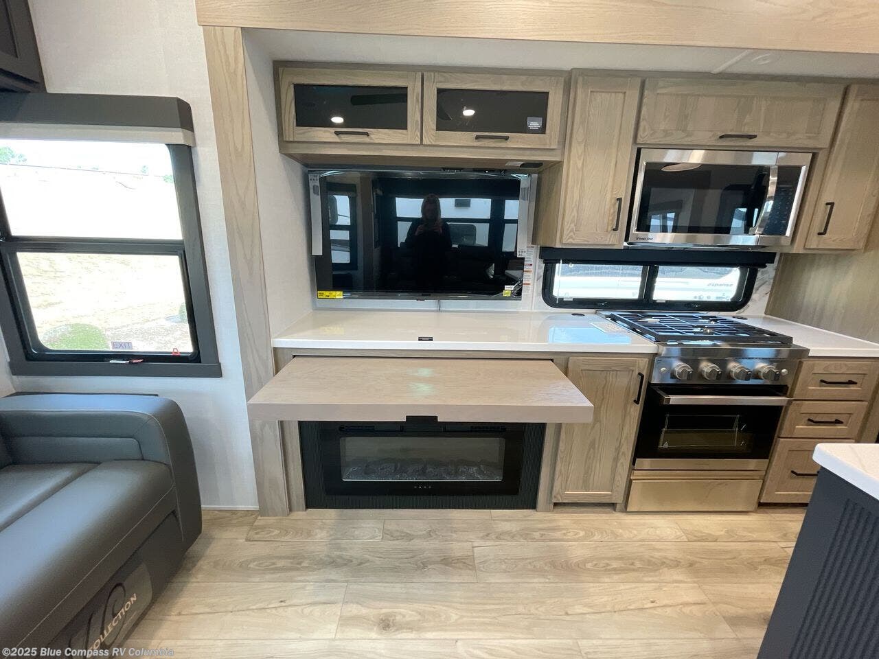 You can't go wrong when choosing this spacious fifth wheel! The master bedroom features a king bed slide out, wardrobe, and a dresser with a fireplace, and the full front bath is sure to bring comfort. There are dual bath sinks here, tons of storage, and even washer and dryer prep if you choose to add these appliances. The mid-coach half bath will come in handy if you have guests staying over on the rear hide-a-bed sofa. You'll also find a theater seat and a rotating table and chairs where you can dine and relax each day, plus there is a large kitchen island so the chef of your group has plenty of prep space. A Smart TV and fireplace will make your space feel more like home, and there is a pull-out desk here if you need to get some work done!