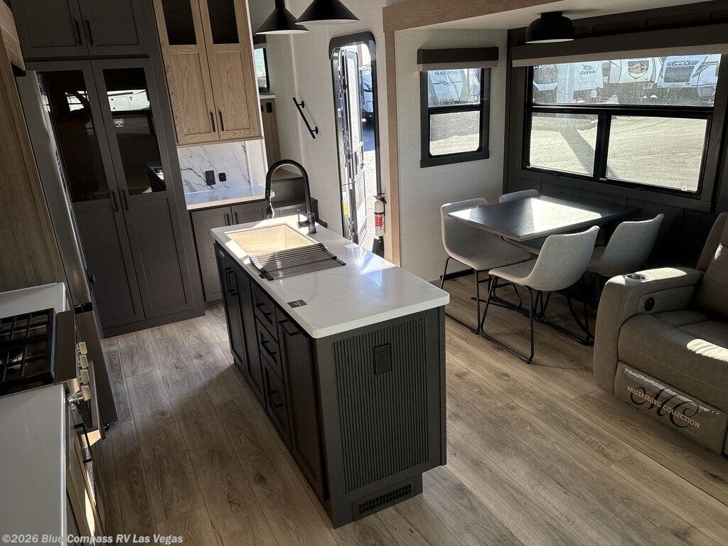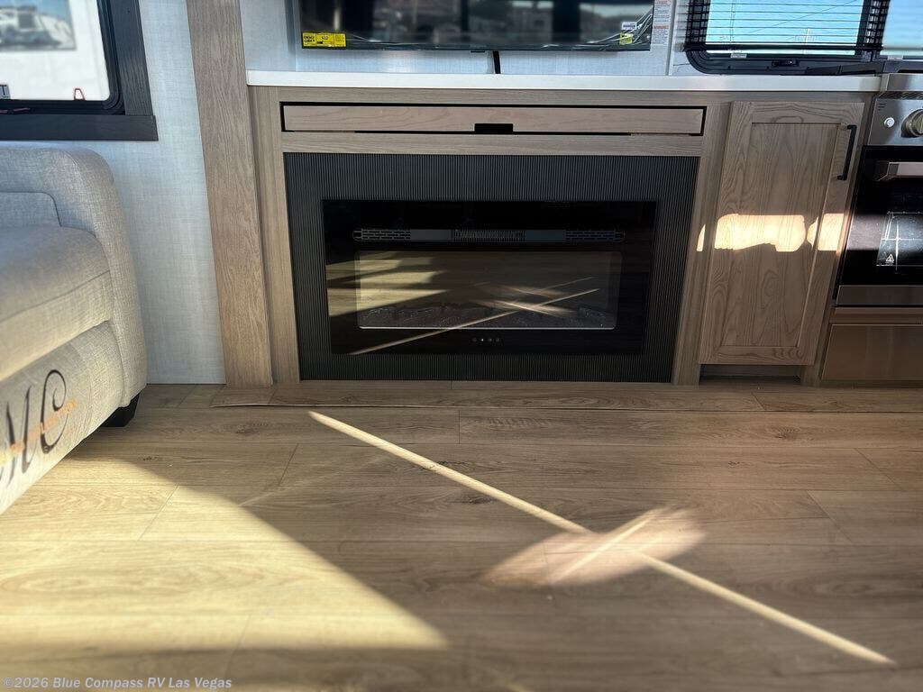 You can't go wrong when choosing this spacious fifth wheel! The master bedroom features a king bed slide out, wardrobe, and a dresser with a fireplace, and the full front bath is sure to bring comfort. There are dual bath sinks here, tons of storage, and even washer and dryer prep if you choose to add these appliances. The mid-coach half bath will come in handy if you have guests staying over on the rear hide-a-bed sofa. You'll also find a theater seat and a rotating table and chairs where you can dine and relax each day, plus there is a large kitchen island so the chef of your group has plenty of prep space. A Smart TV and fireplace will make your space feel more like home, and there is a pull-out desk here if you need to get some work done!