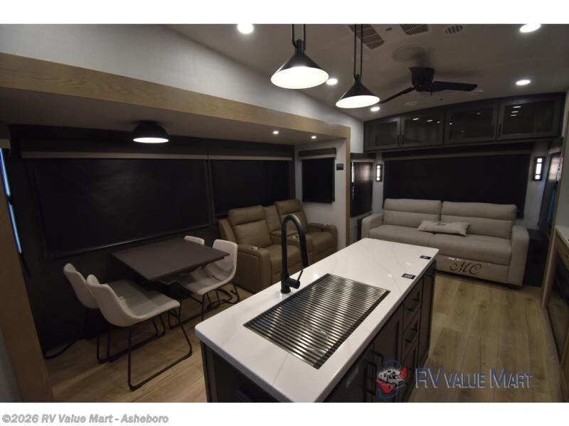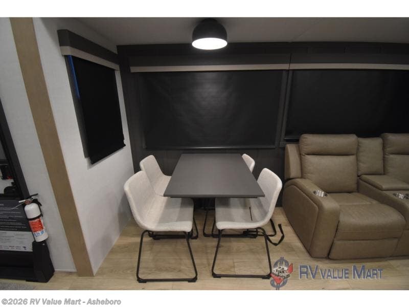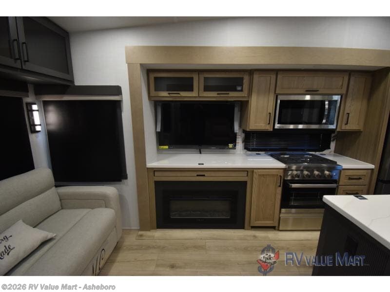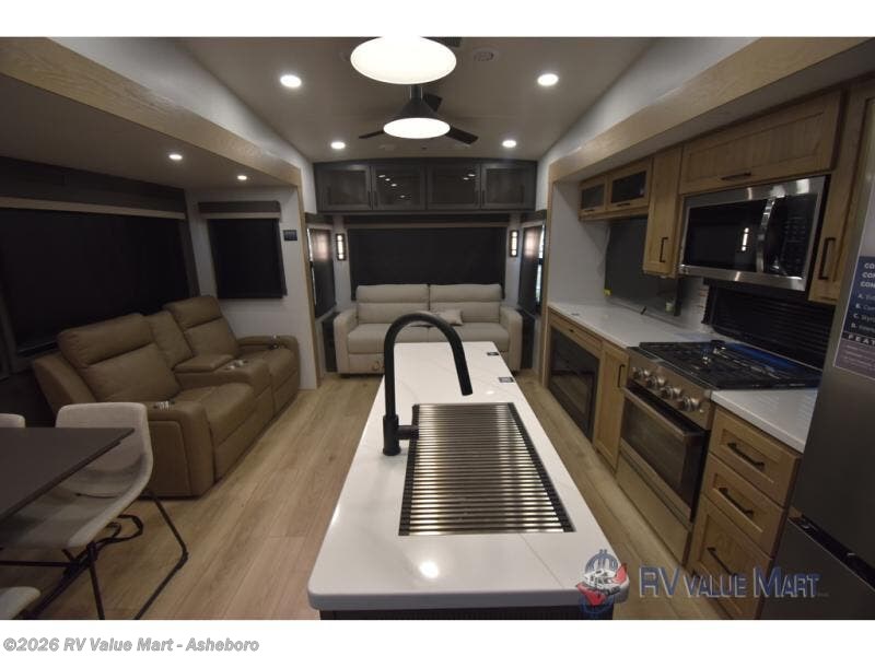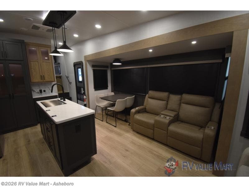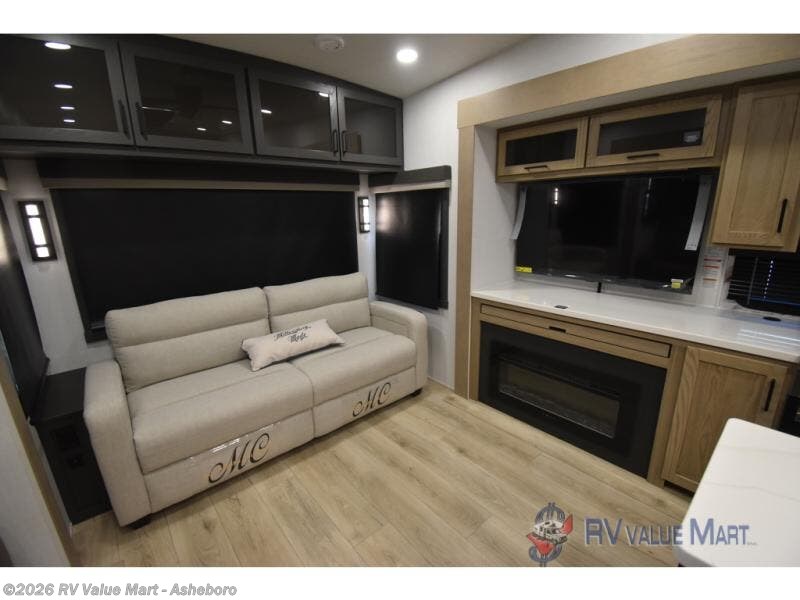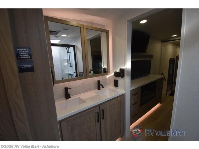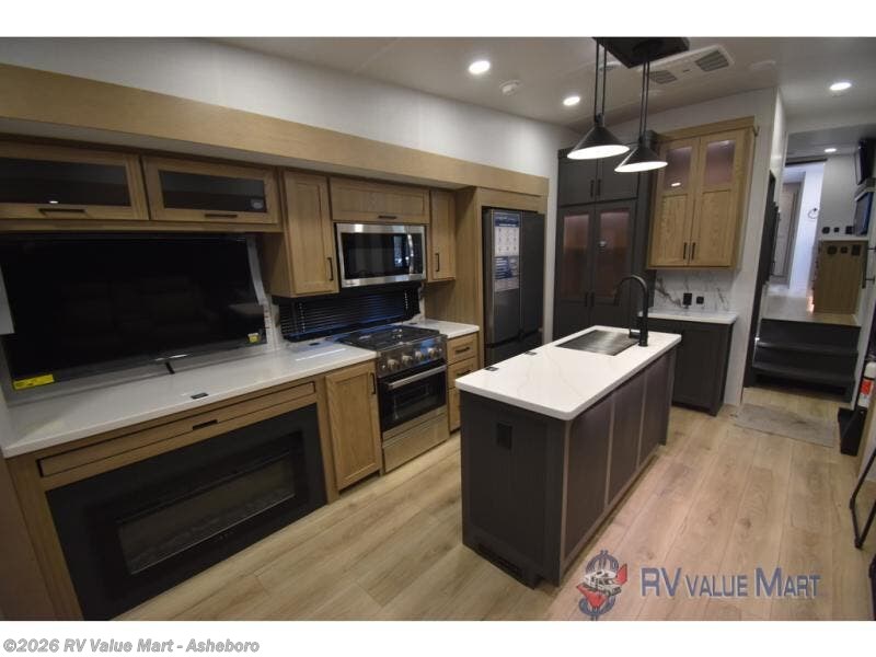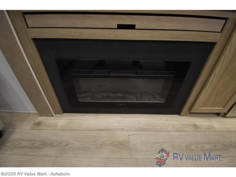 You can't go wrong when choosing this spacious fifth wheel! The master bedroom features a king bed slide out, wardrobe, and a dresser with a fireplace, and the full front bath is sure to bring comfort. There are dual bath sinks here, tons of storage, and even washer and dryer prep if you choose to add these appliances. The mid-coach half bath will come in handy if you have guests staying over on the rear hide-a-bed sofa. You'll also find a theater seat and a rotating table and chairs where you can dine and relax each day, plus there is a large kitchen island so the chef of your group has plenty of prep space. A Smart TV and fireplace will make your space feel more like home, and there is a pull-out desk here if you need to get some work done!