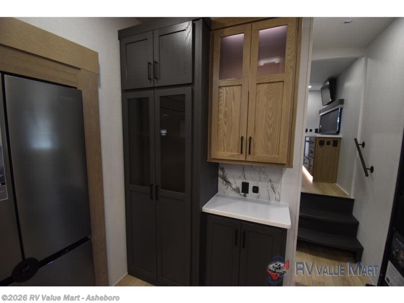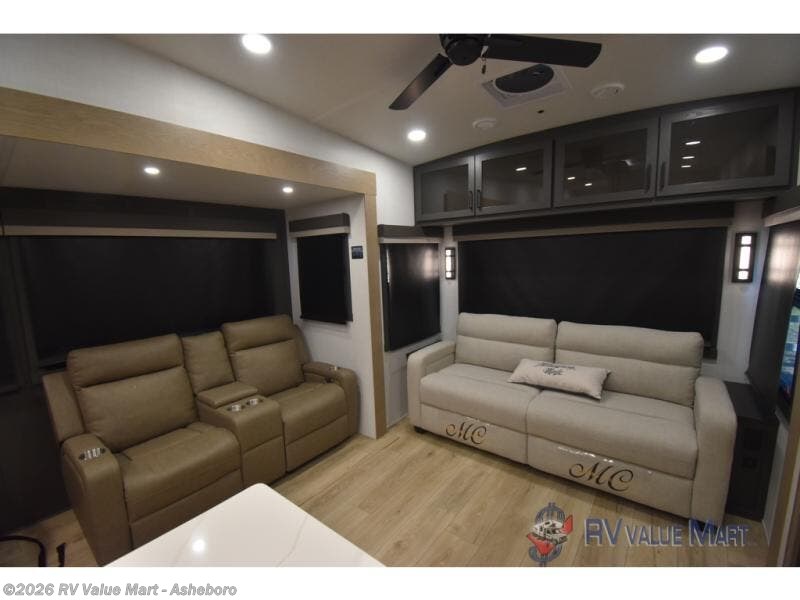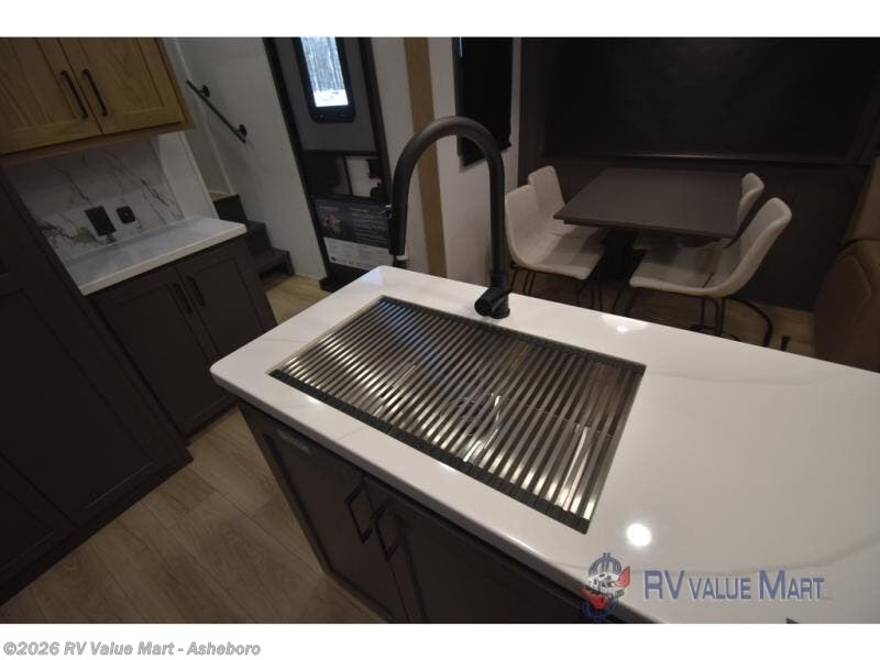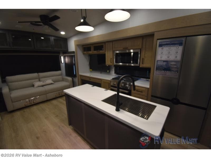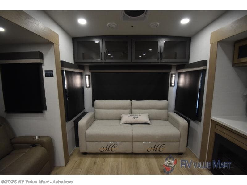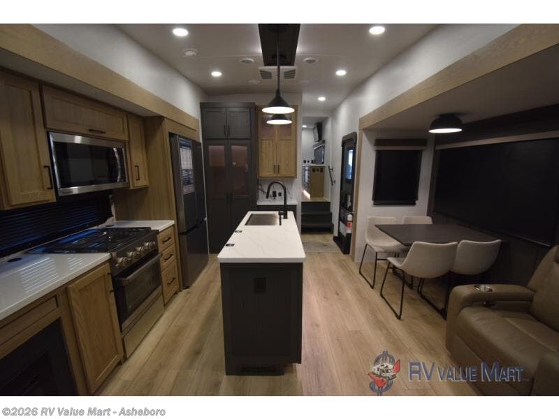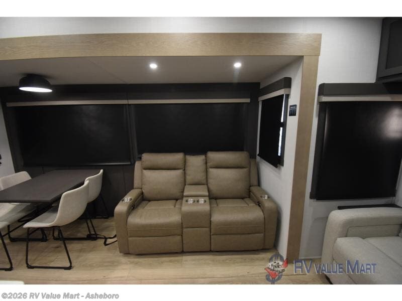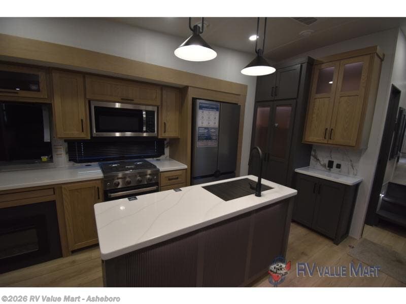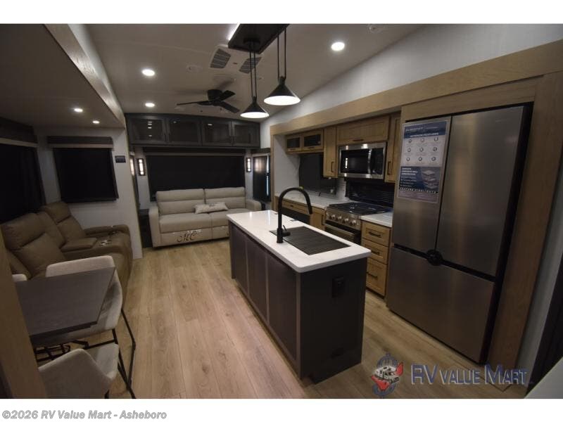 You can't go wrong when choosing this spacious fifth wheel! The master bedroom features a king bed slide out, wardrobe, and a dresser with a fireplace, and the full front bath is sure to bring comfort. There are dual bath sinks here, tons of storage, and even washer and dryer prep if you choose to add these appliances. The mid-coach half bath will come in handy if you have guests staying over on the rear hide-a-bed sofa. You'll also find a theater seat and a rotating table and chairs where you can dine and relax each day, plus there is a large kitchen island so the chef of your group has plenty of prep space. A Smart TV and fireplace will make your space feel more like home, and there is a pull-out desk here if you need to get some work done!